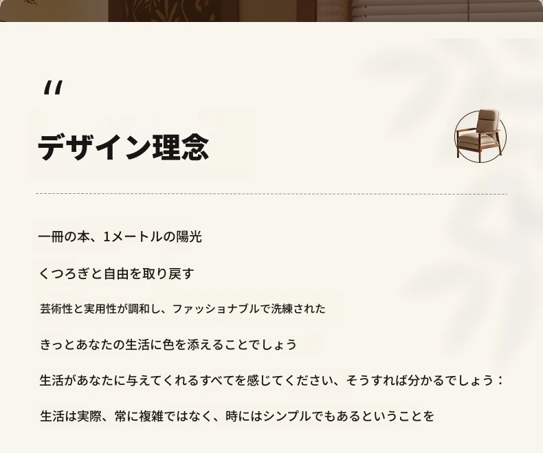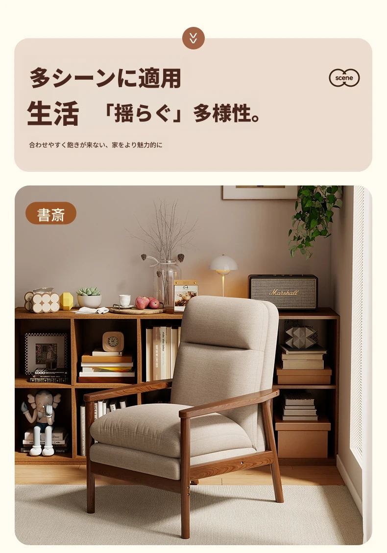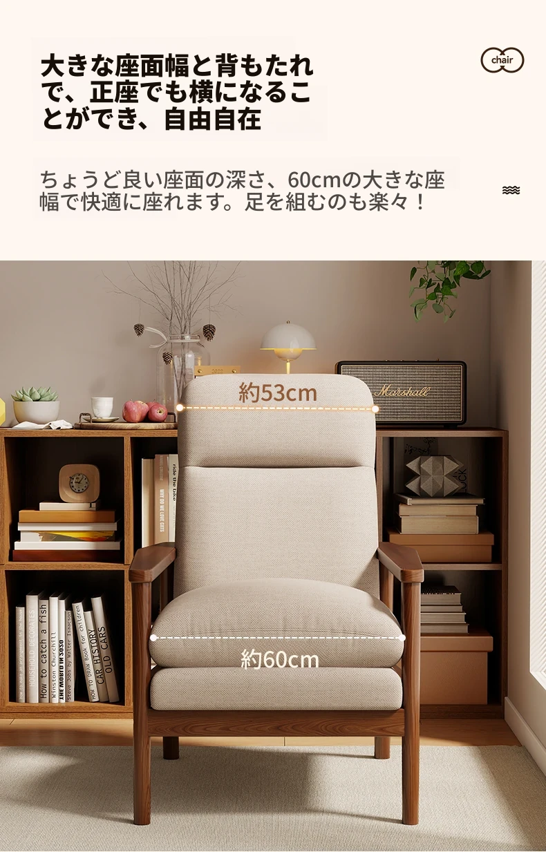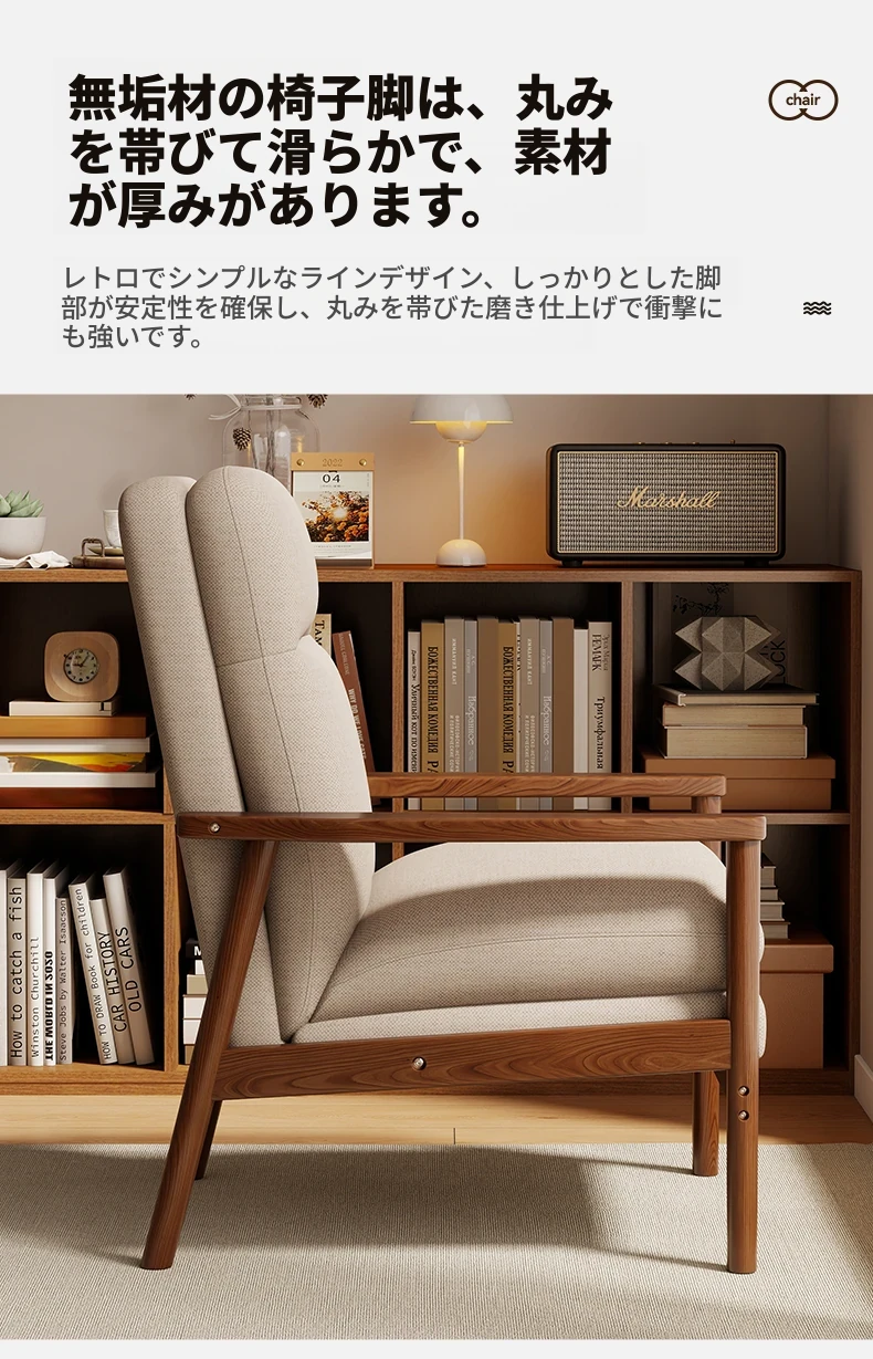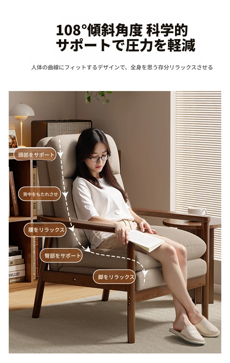 モダンなデザインの無垢材一人掛けソファ椅子 - 家庭用、バルコニーに最適なリラックスチェア。快適な背もたれで、リビングや接客スペースにぴったりです。