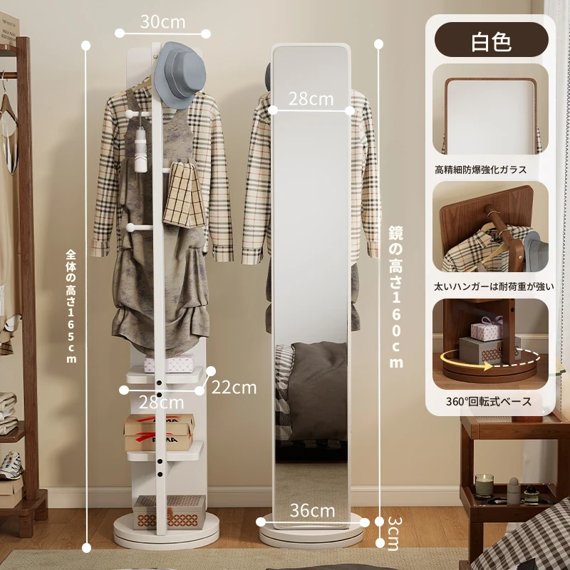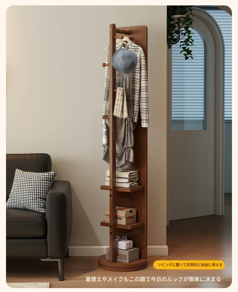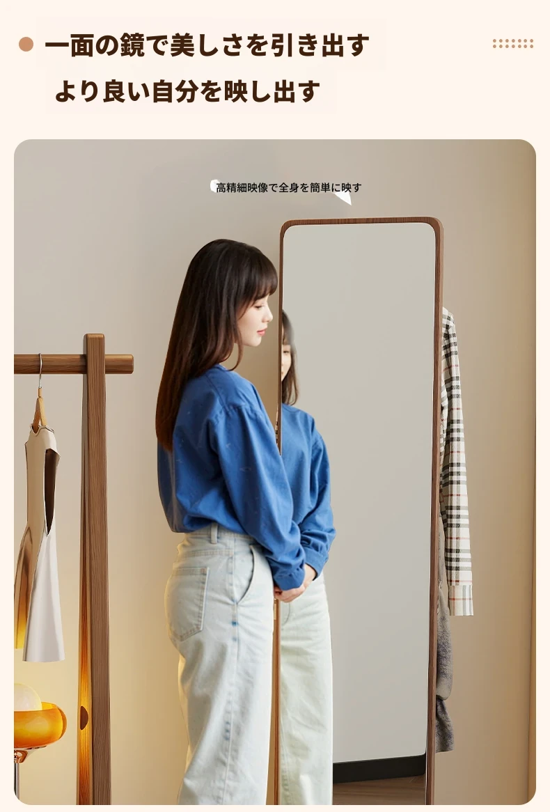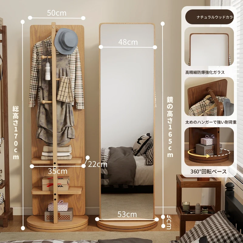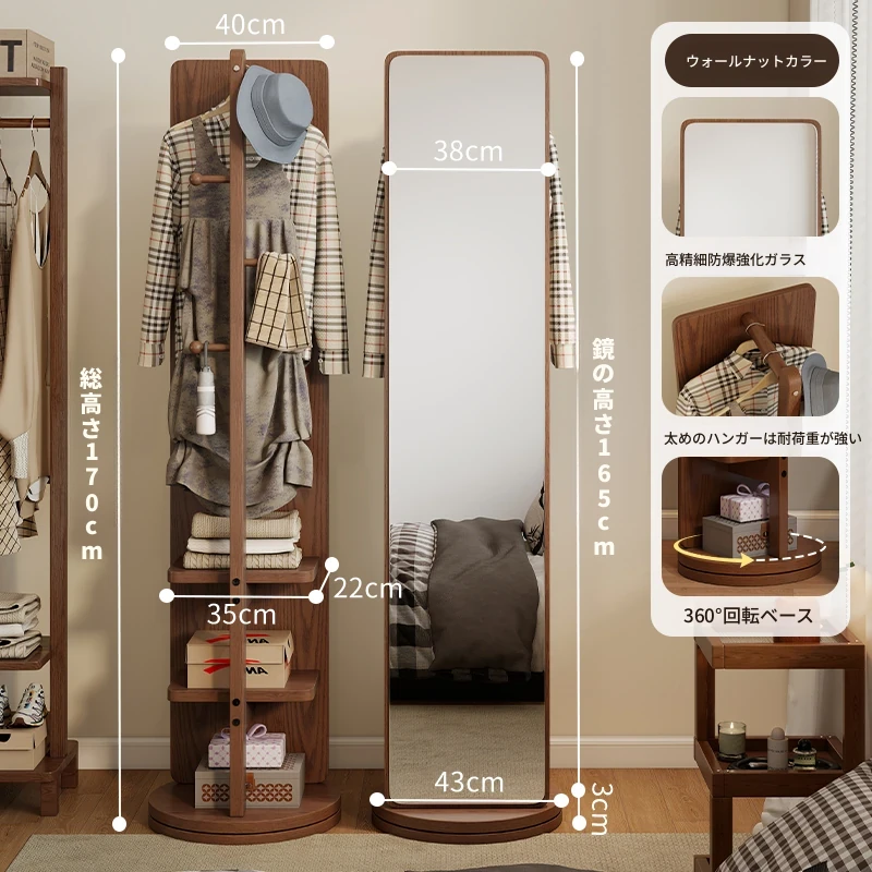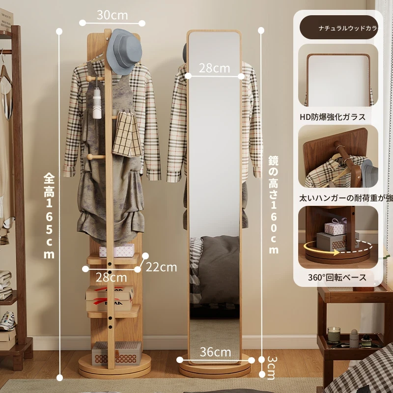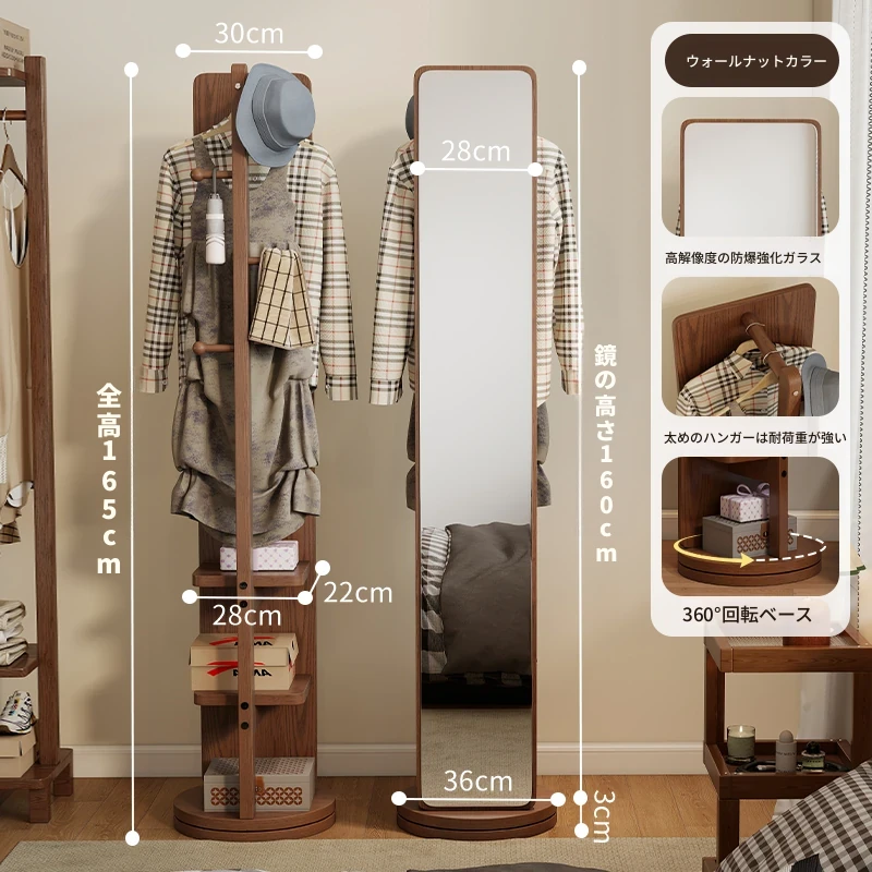 高品質な無垢材の全身鏡!自宅用の寝室に最適、回転式で便利な試着鏡。衣類ハンガー一体型で、スタイリッシュなデザインが魅力。おしゃれな空間を演出し、毎日のコーディネートが楽しくなるアイテムです!