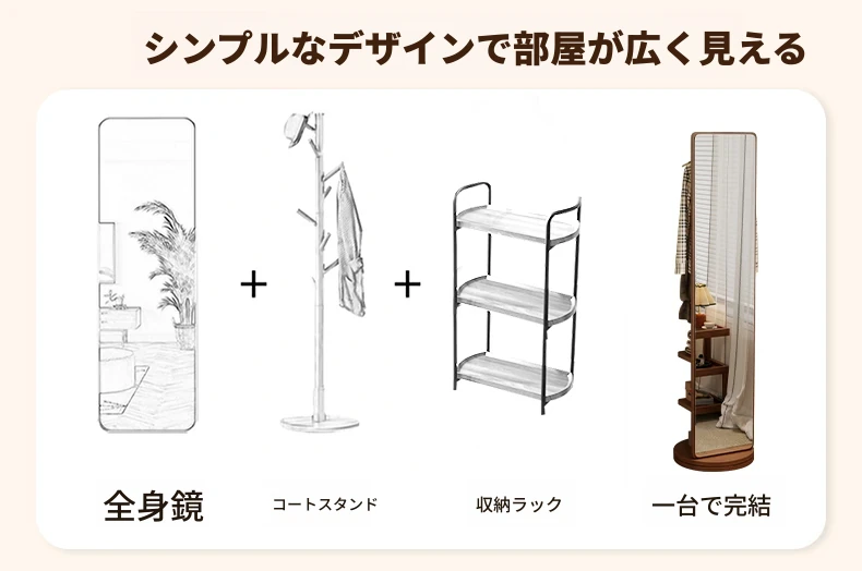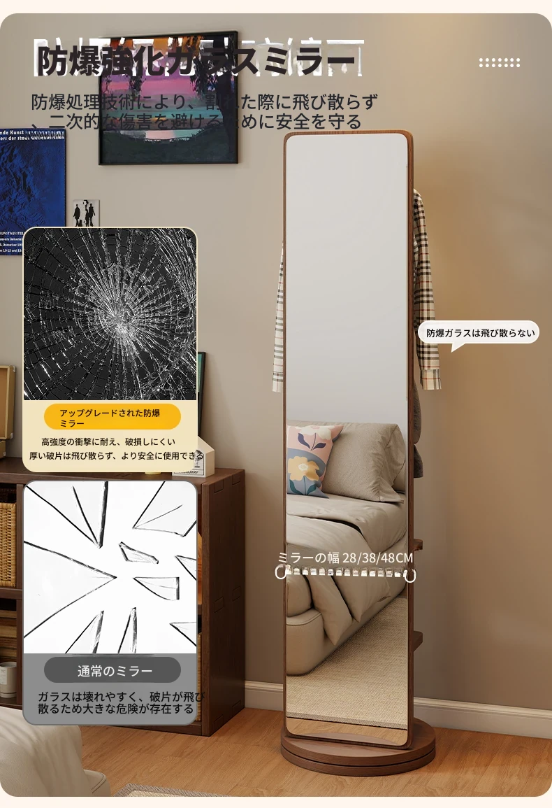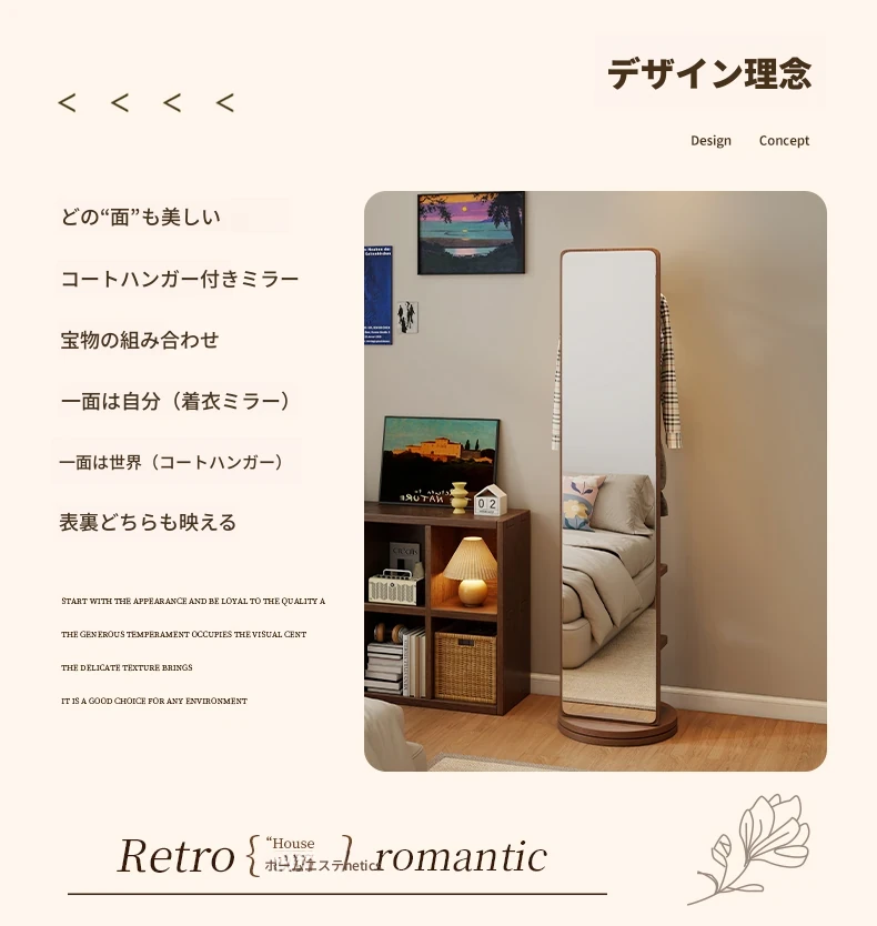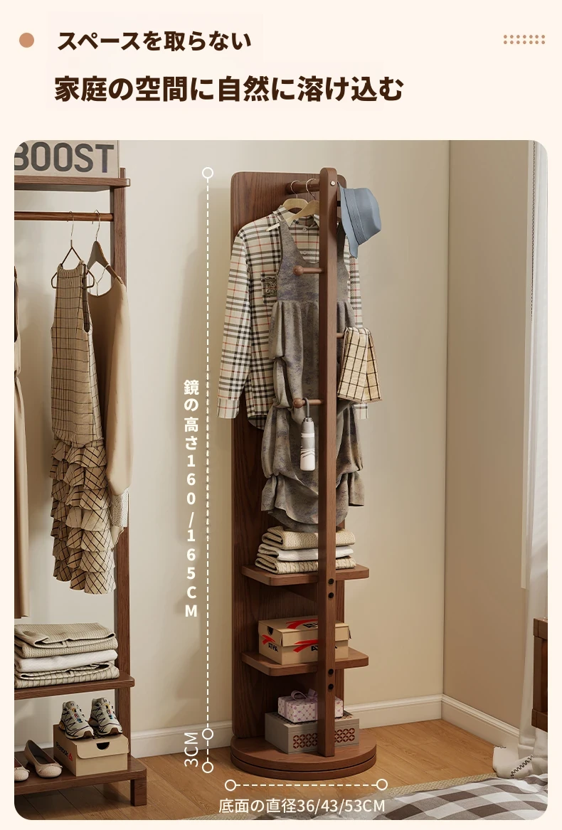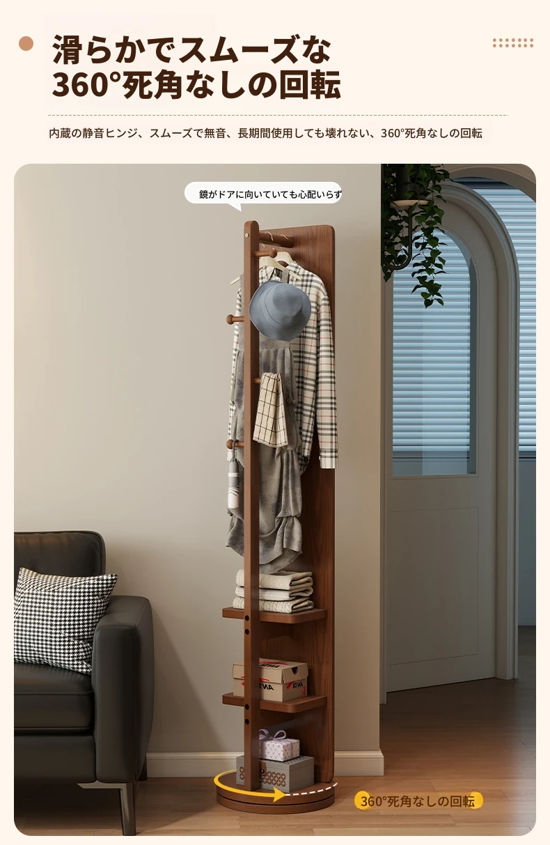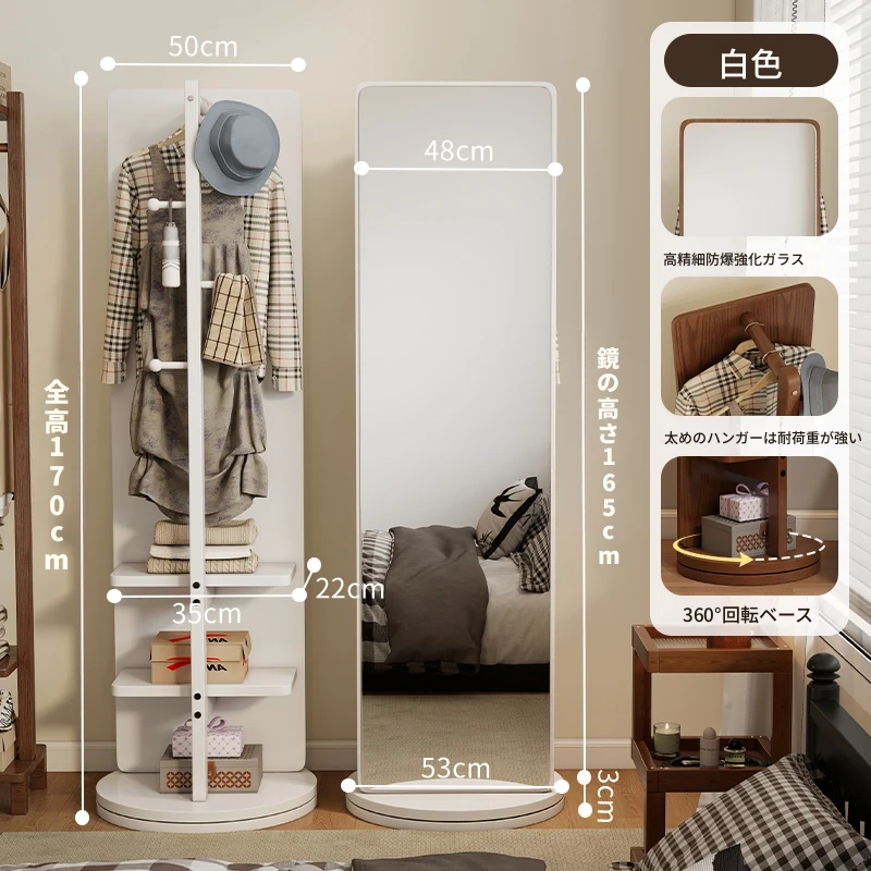 高品質な無垢材の全身鏡!自宅用の寝室に最適、回転式で便利な試着鏡。衣類ハンガー一体型で、スタイリッシュなデザインが魅力。おしゃれな空間を演出し、毎日のコーディネートが楽しくなるアイテムです!