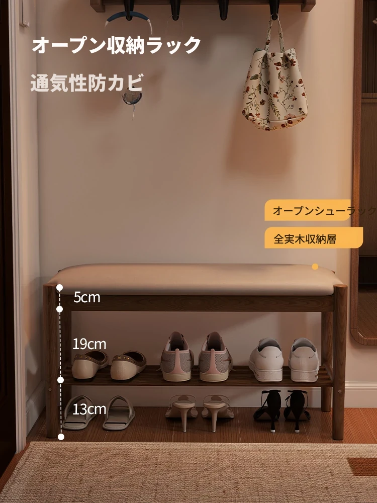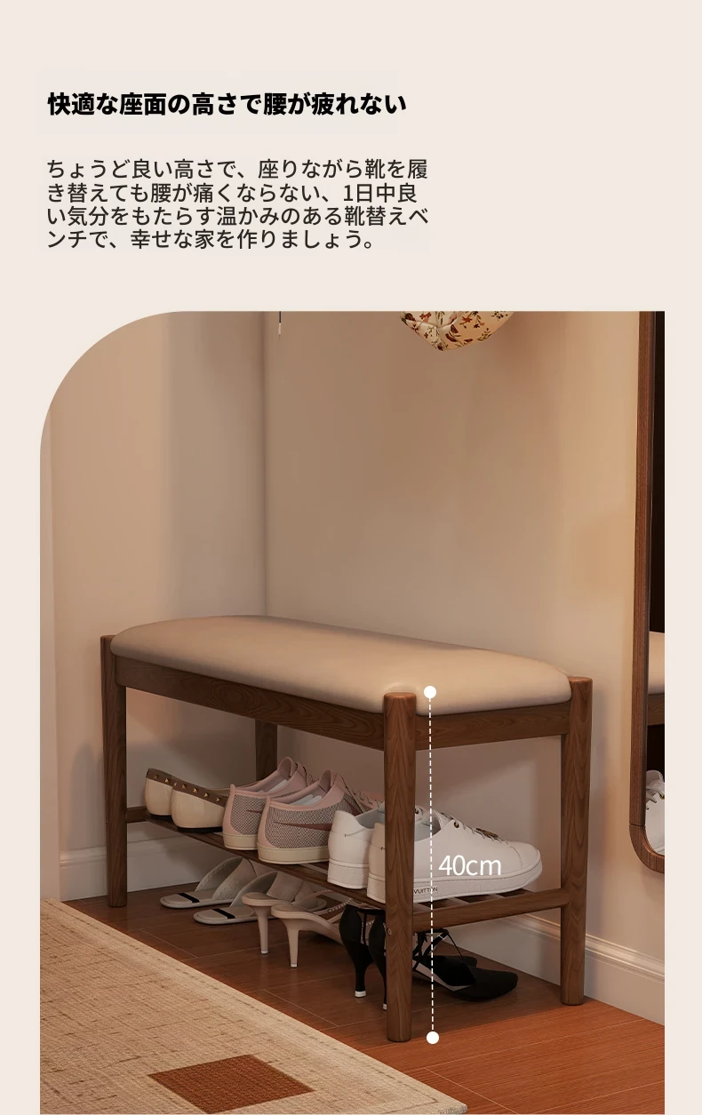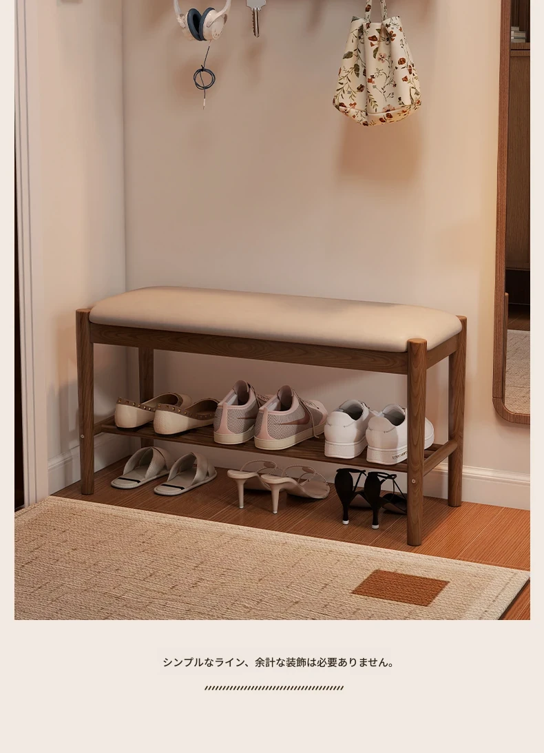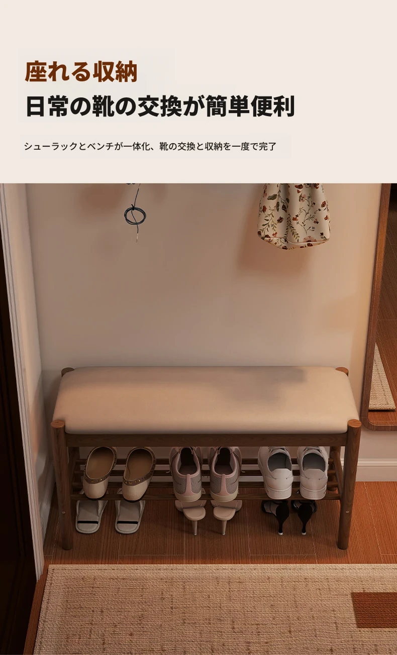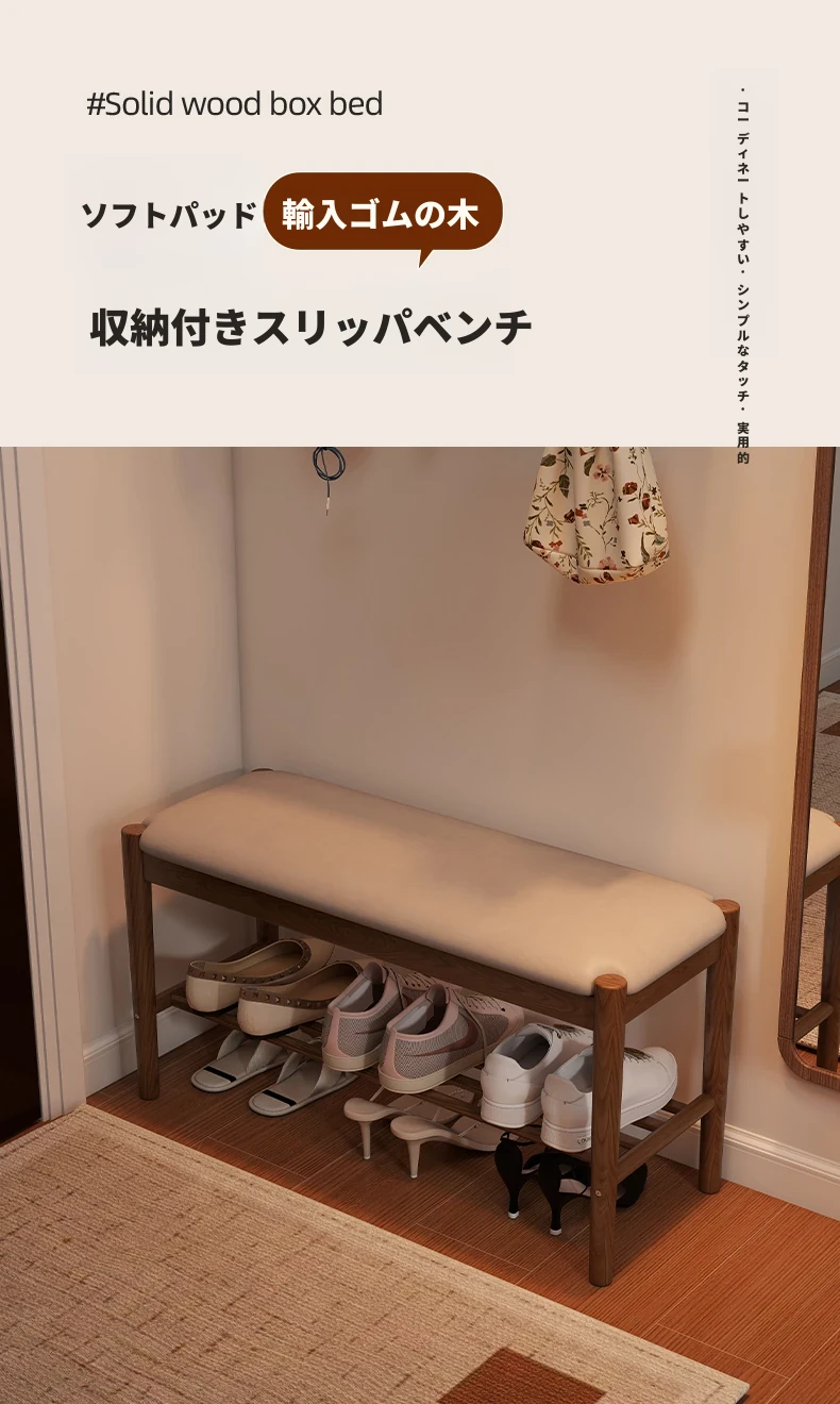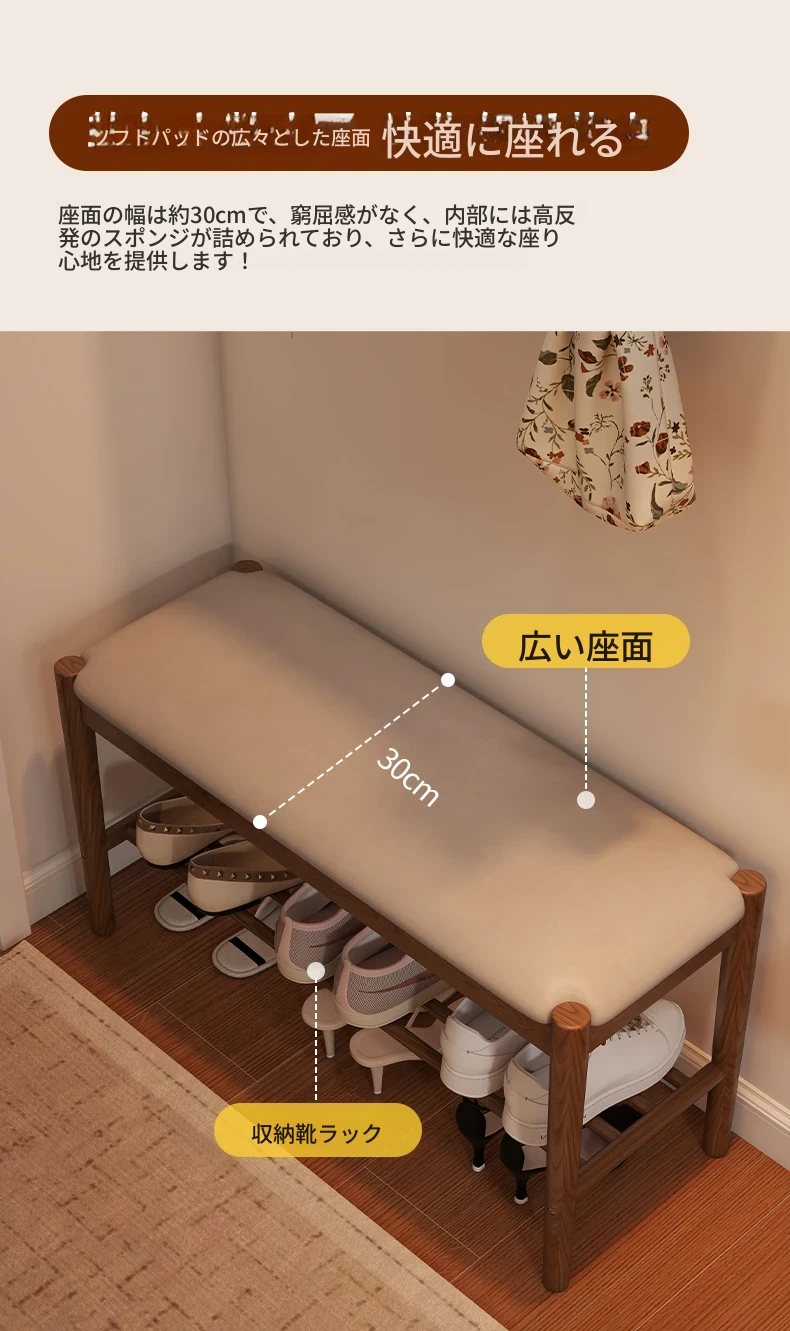 天然木製の靴を履くためのベンチ - 家庭用エントランスに最適!座れるソフトパッド付きのロングベンチとシューズラックが一体化。スタイリッシュで機能的なデザインが、あなたの玄関をおしゃれに演出します!