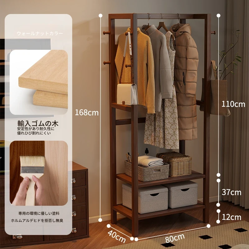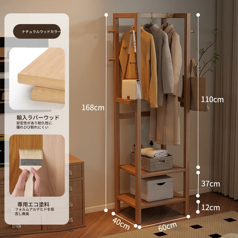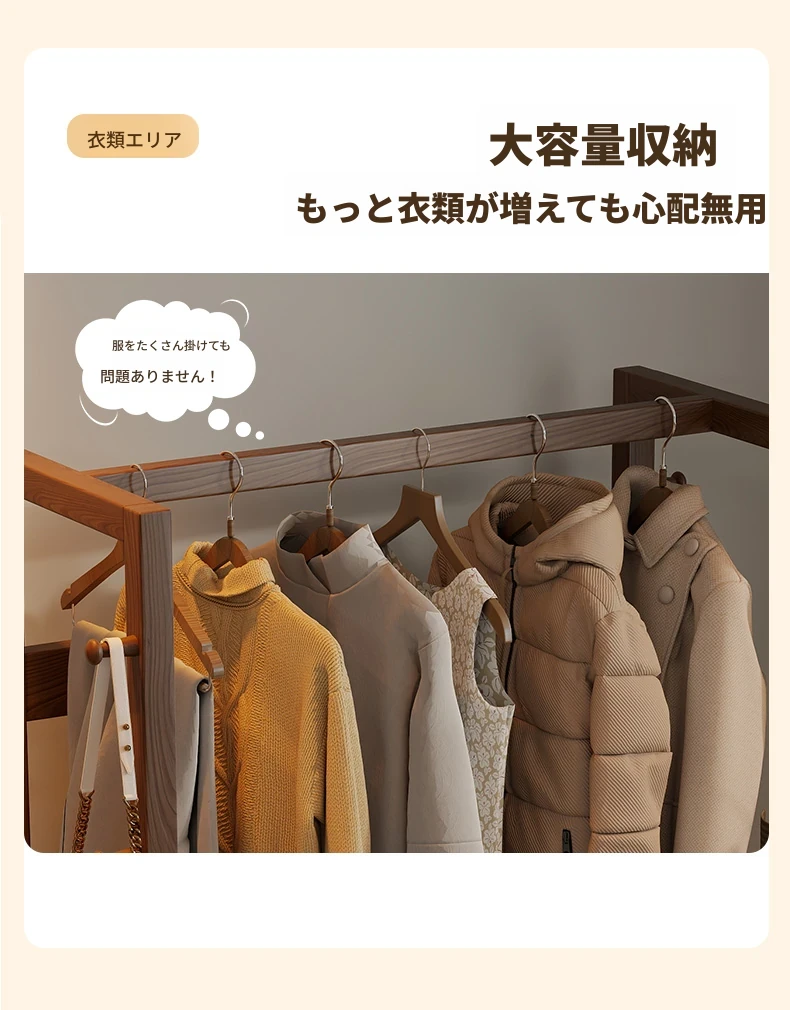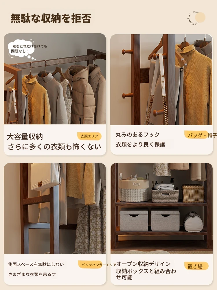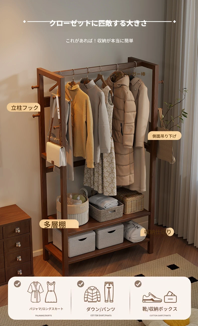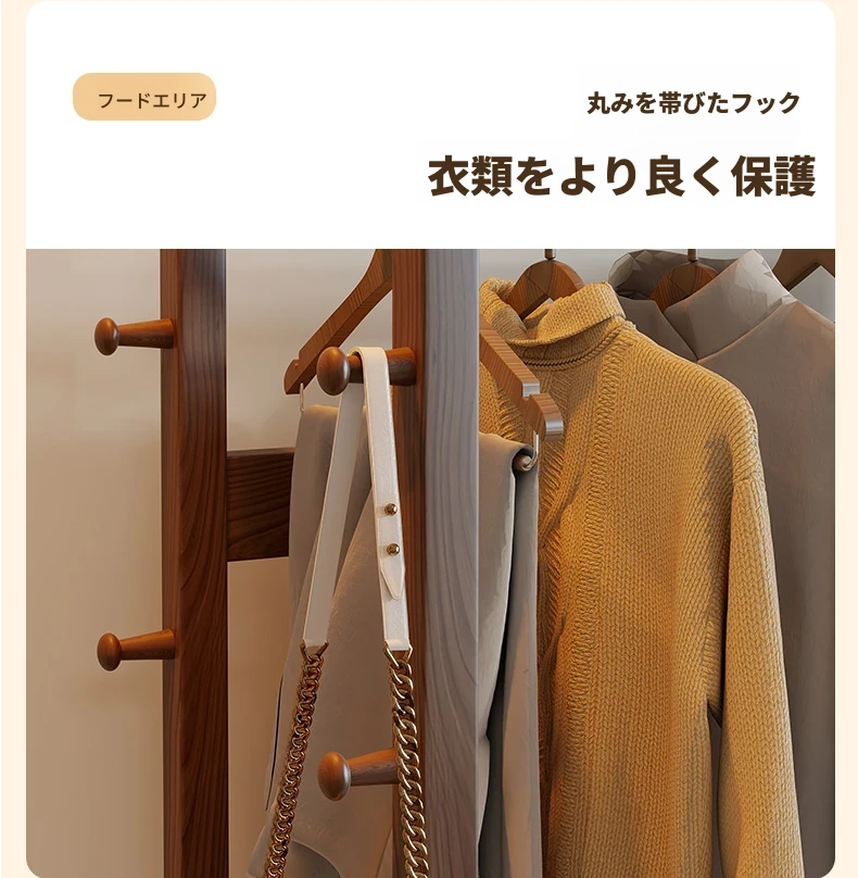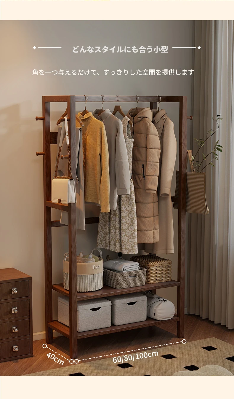 天然木材使用のスタイリッシュなスタンド式衣類ハンガー!寝室やリビングにぴったりな多機能収納ラック。ベッドサイドにも最適、小型で場所を取らず、あなたの生活空間をおしゃれに演出します。