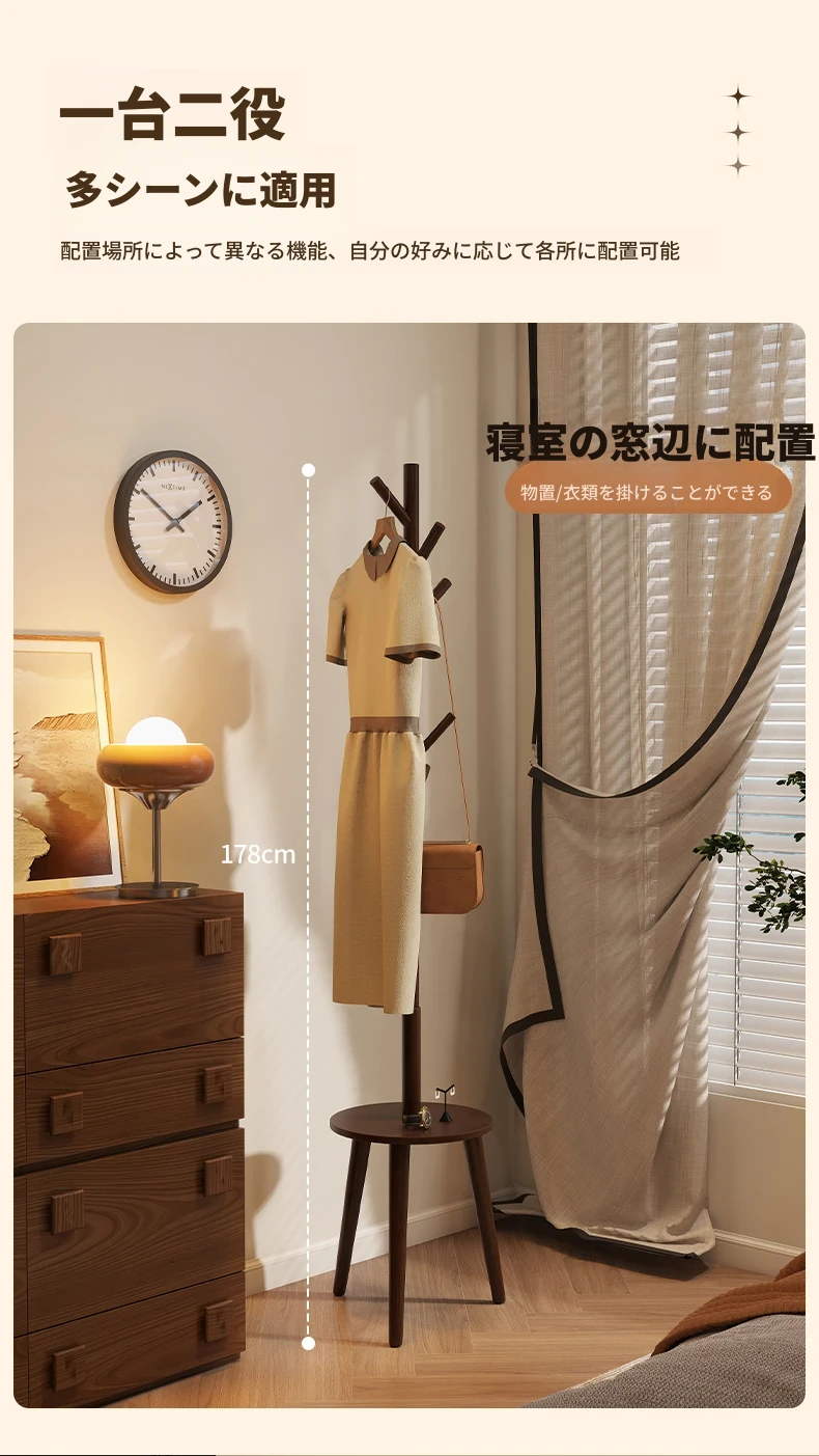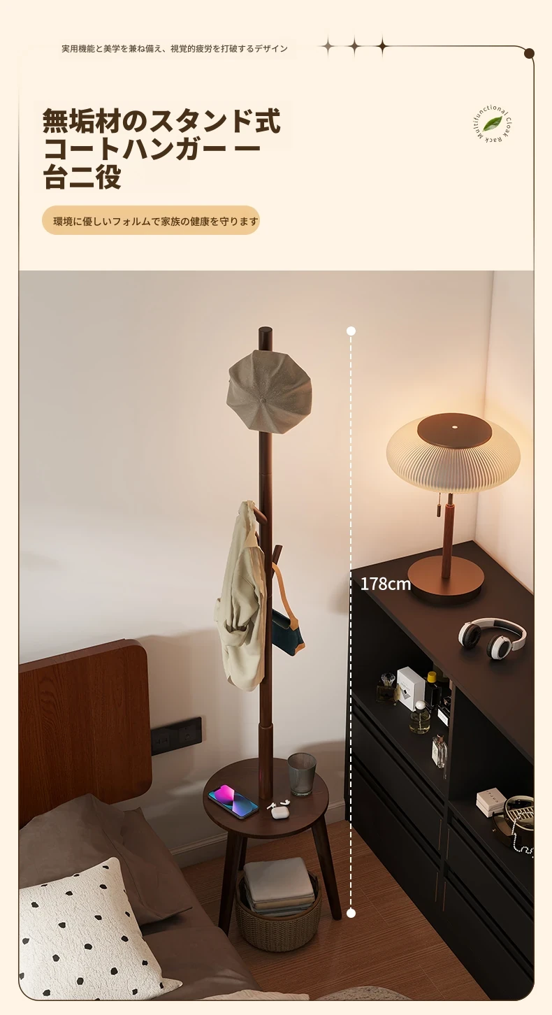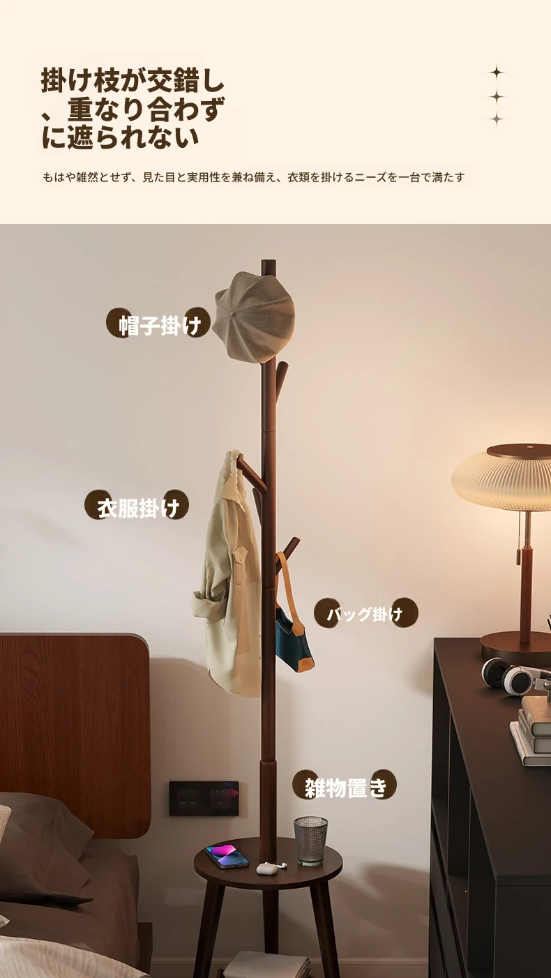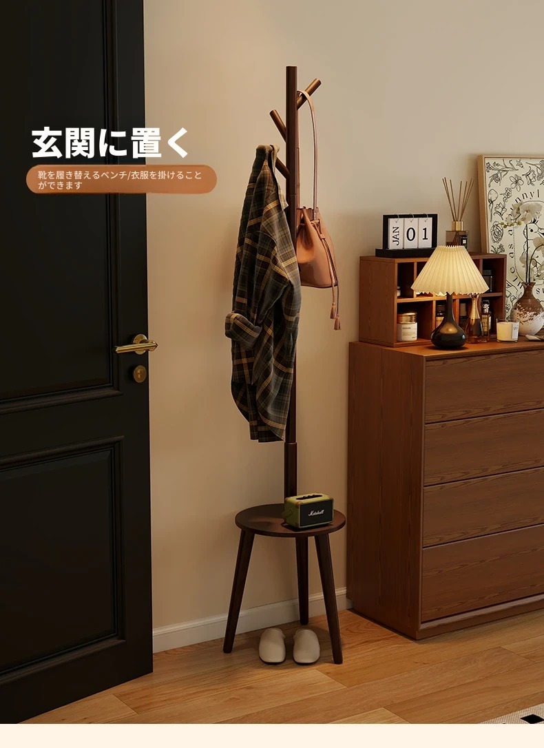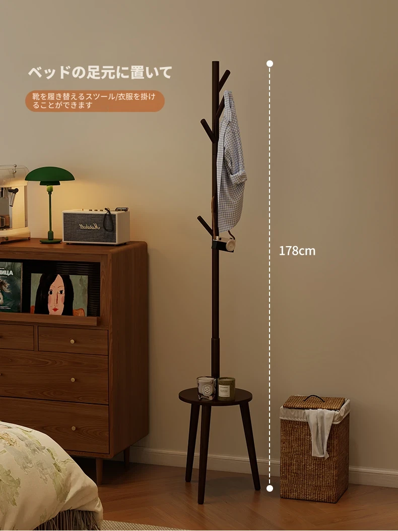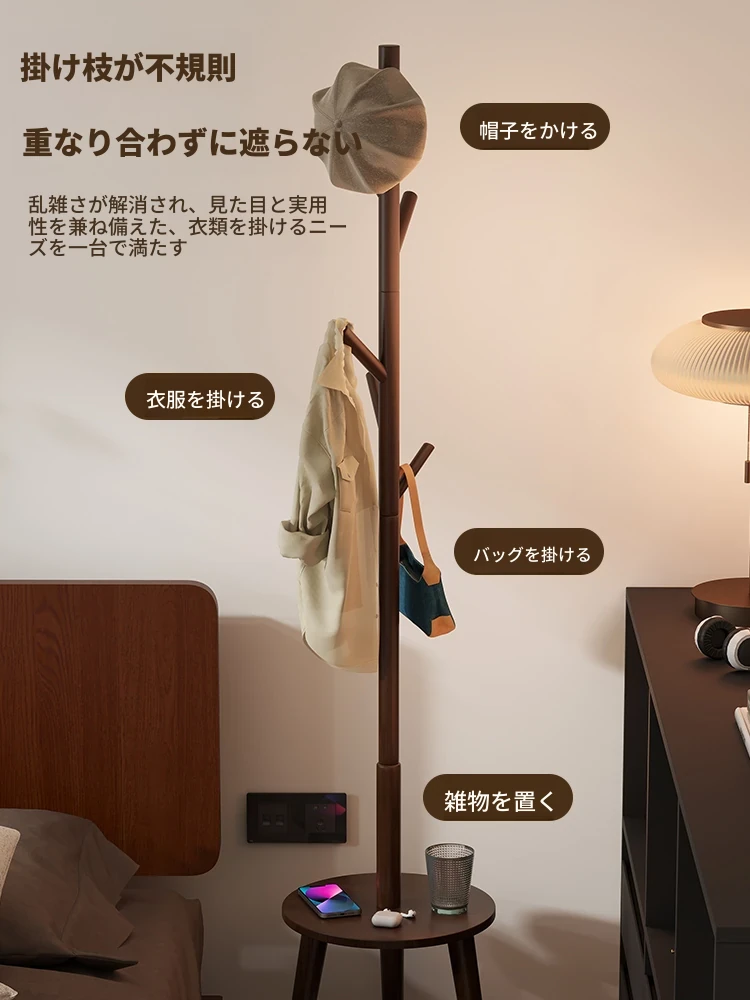 天然木製のスタンディングコートラック - 寝室やリビングに最適!シンプルでおしゃれなデザイン、衣類や小物をすっきり収納できる便利なアイテム。お部屋を美しく整え、使いやすさも抜群!