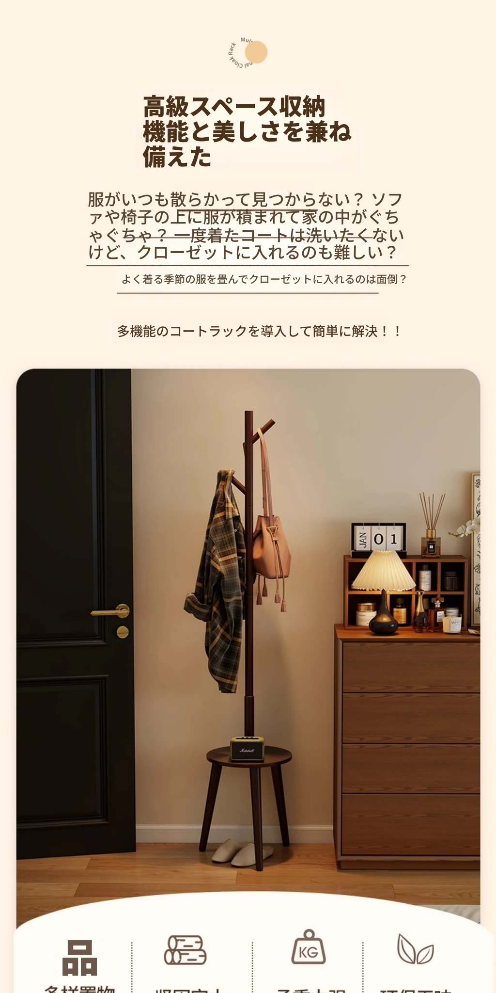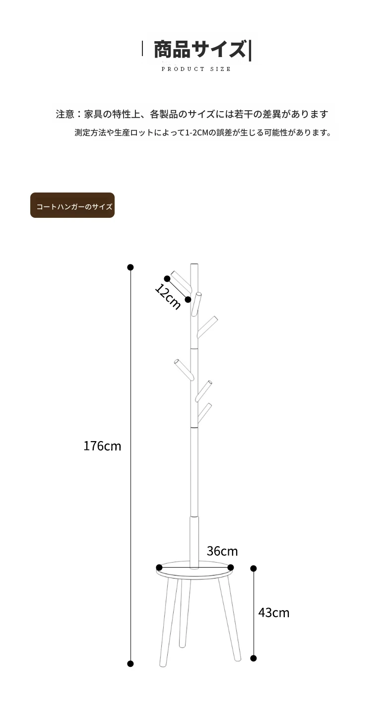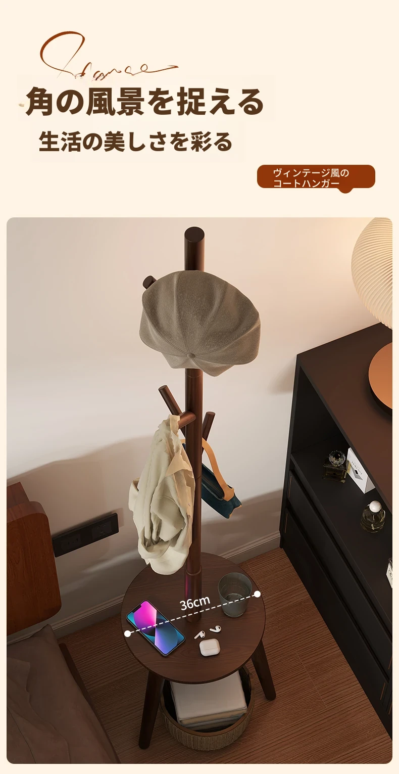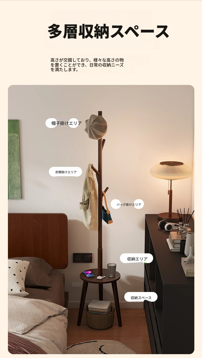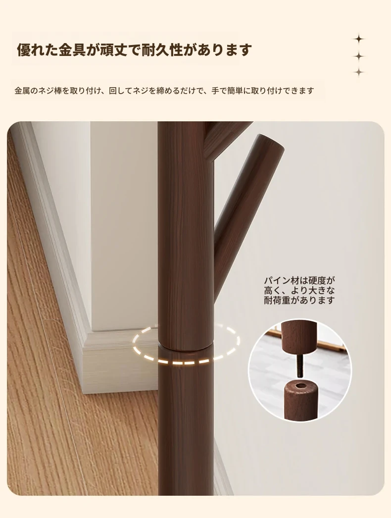 天然木製のスタンディングコートラック - 寝室やリビングに最適!シンプルでおしゃれなデザイン、衣類や小物をすっきり収納できる便利なアイテム。お部屋を美しく整え、使いやすさも抜群!