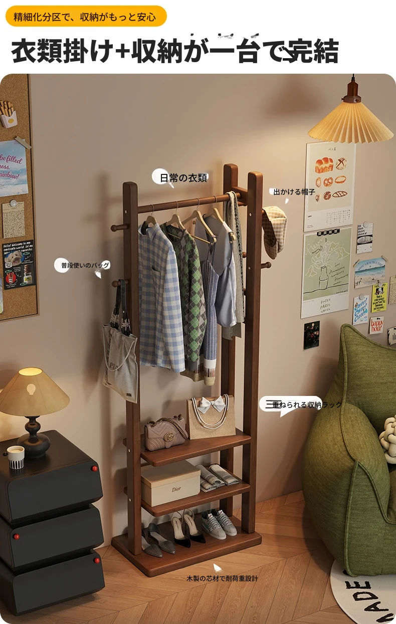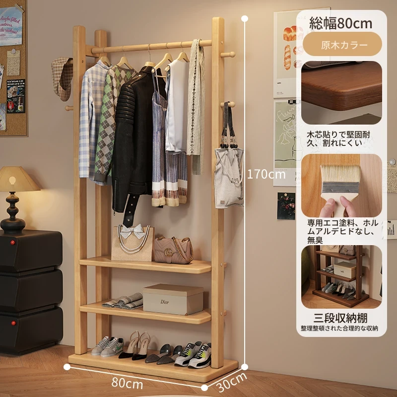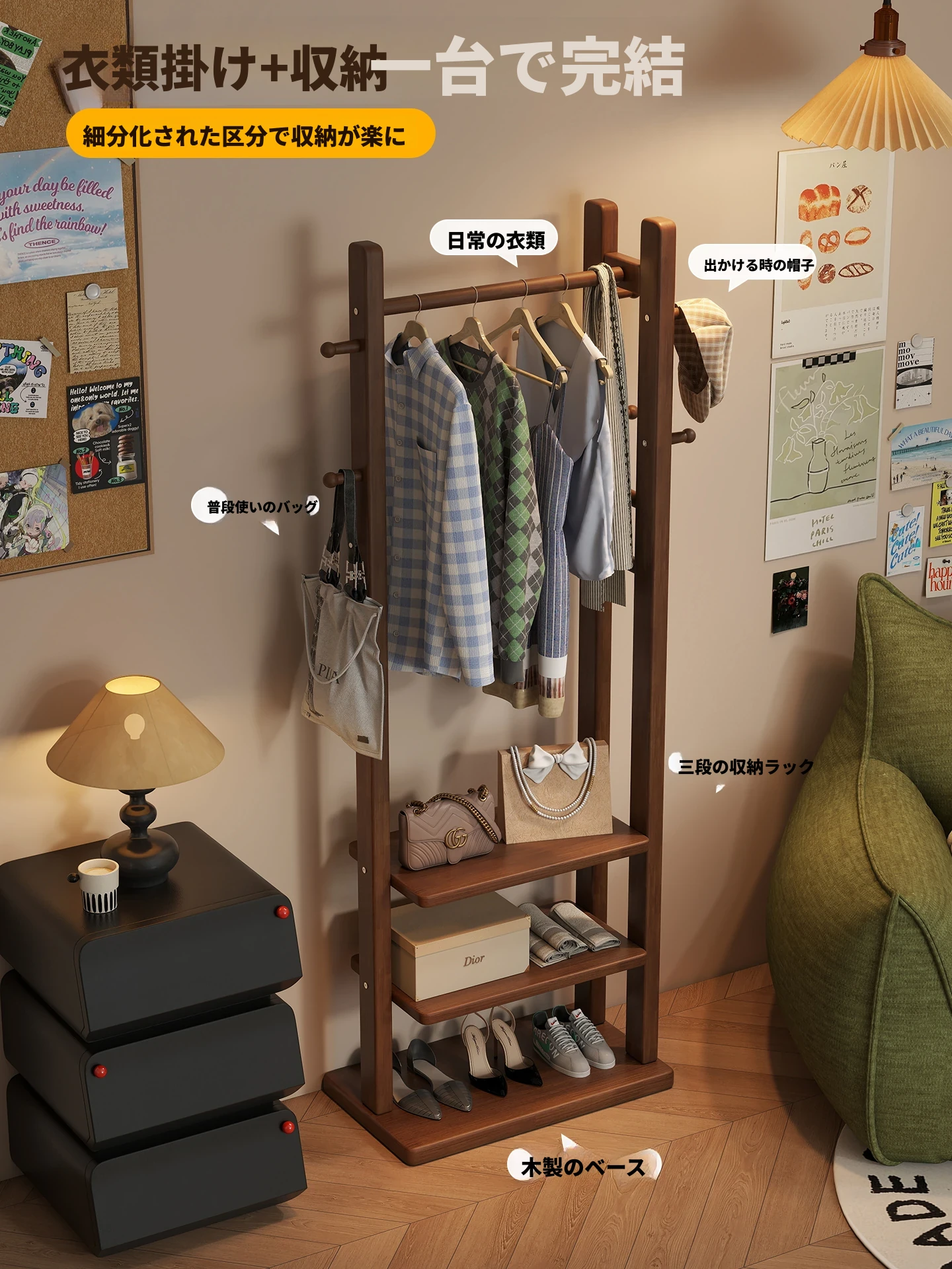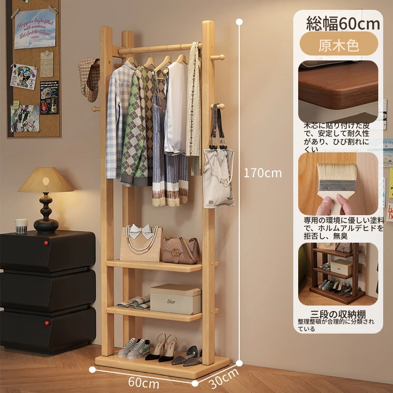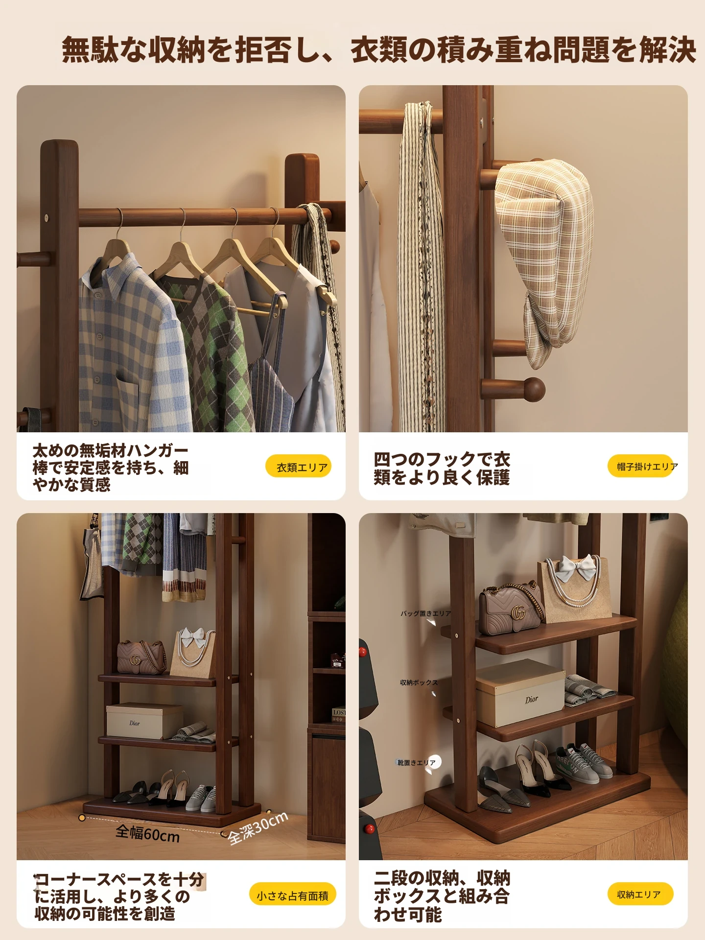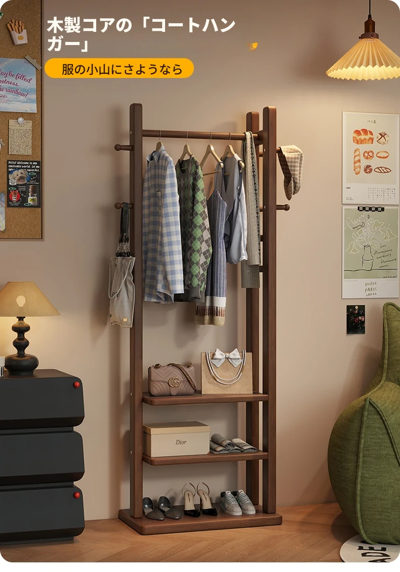 天然木製のフロアコートハンガー - シンプルでおしゃれな衣類収納ラック、リビングや寝室に最適な多機能収納アイテム!お部屋をすっきり整えて、おしゃれな空間を演出します。
