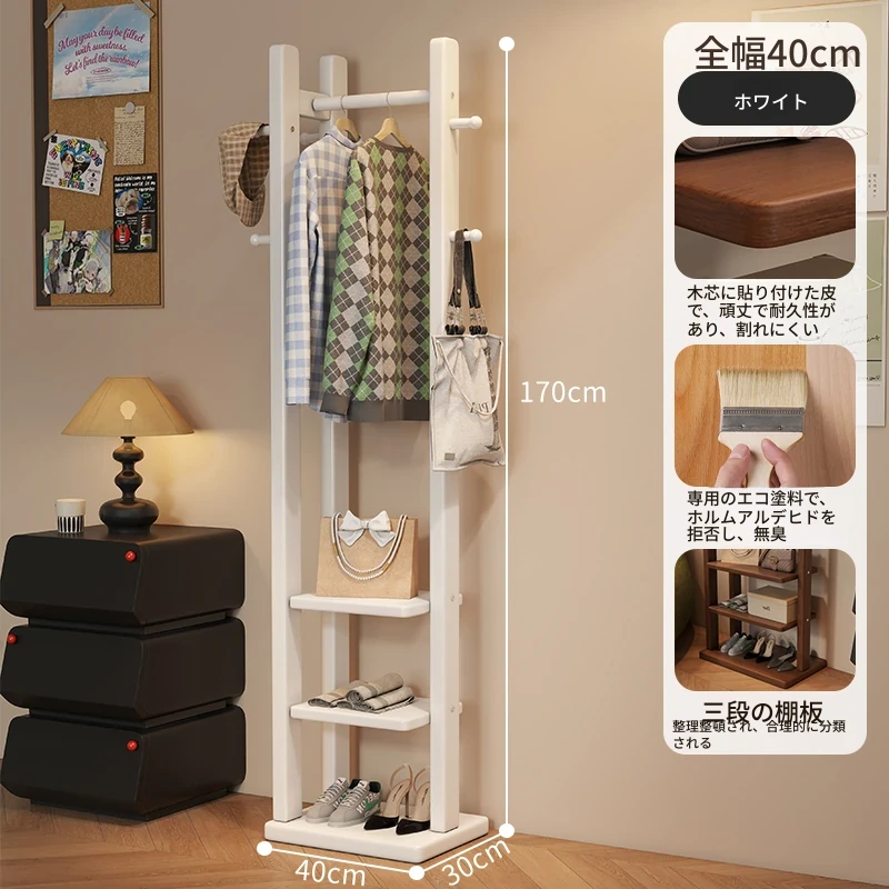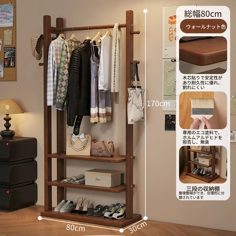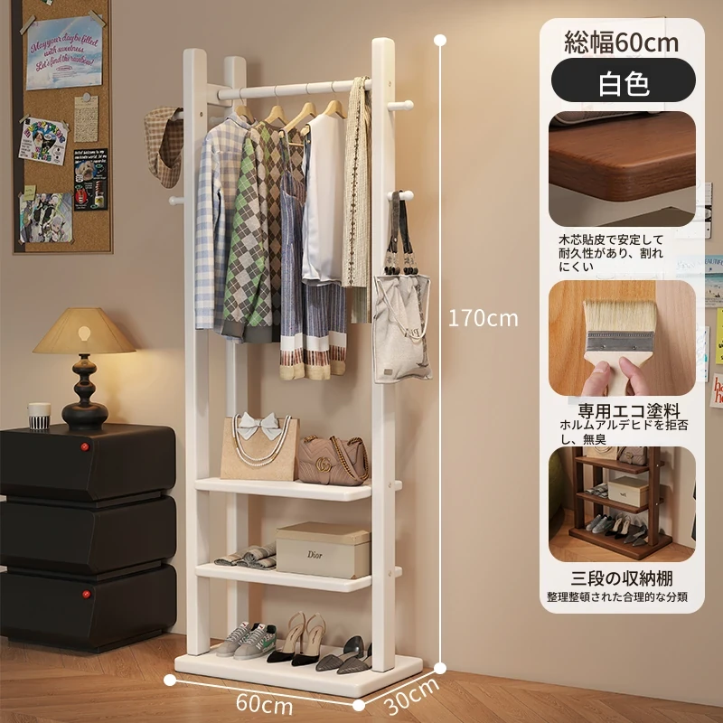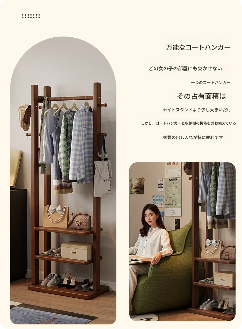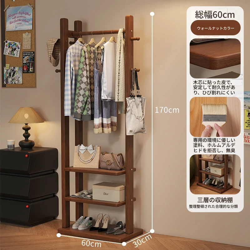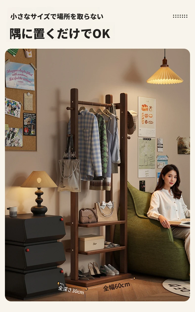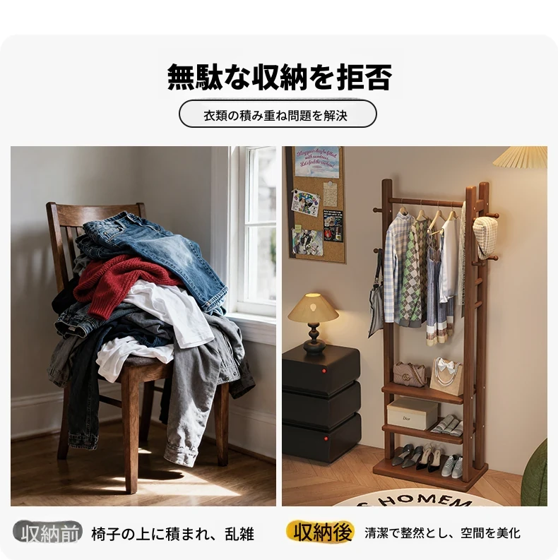 天然木製のフロアコートハンガー - シンプルでおしゃれな衣類収納ラック、リビングや寝室に最適な多機能収納アイテム!お部屋をすっきり整えて、おしゃれな空間を演出します。