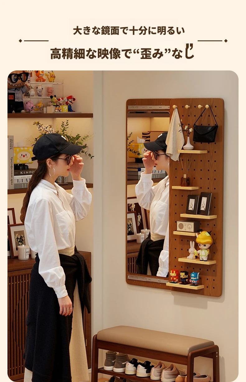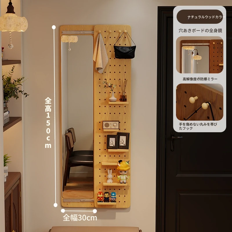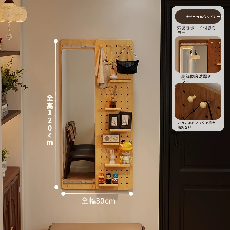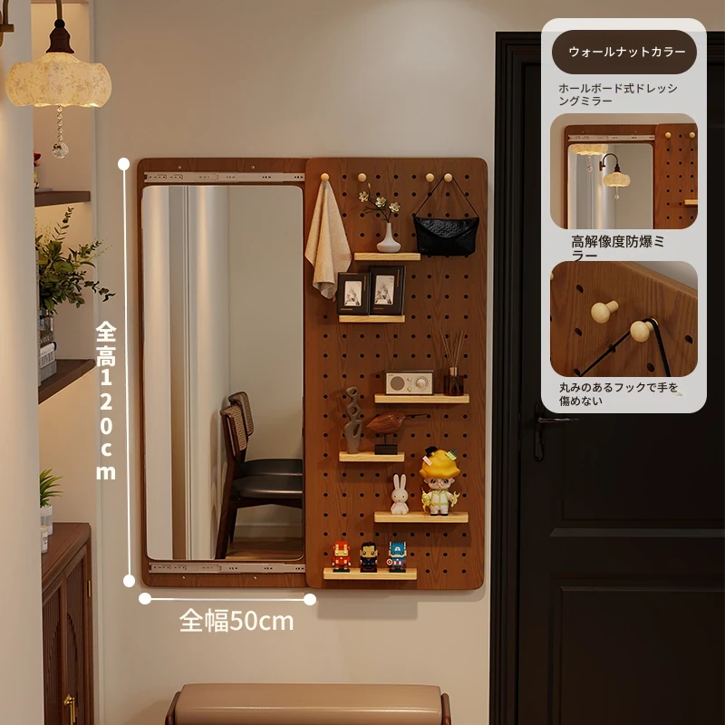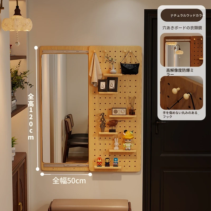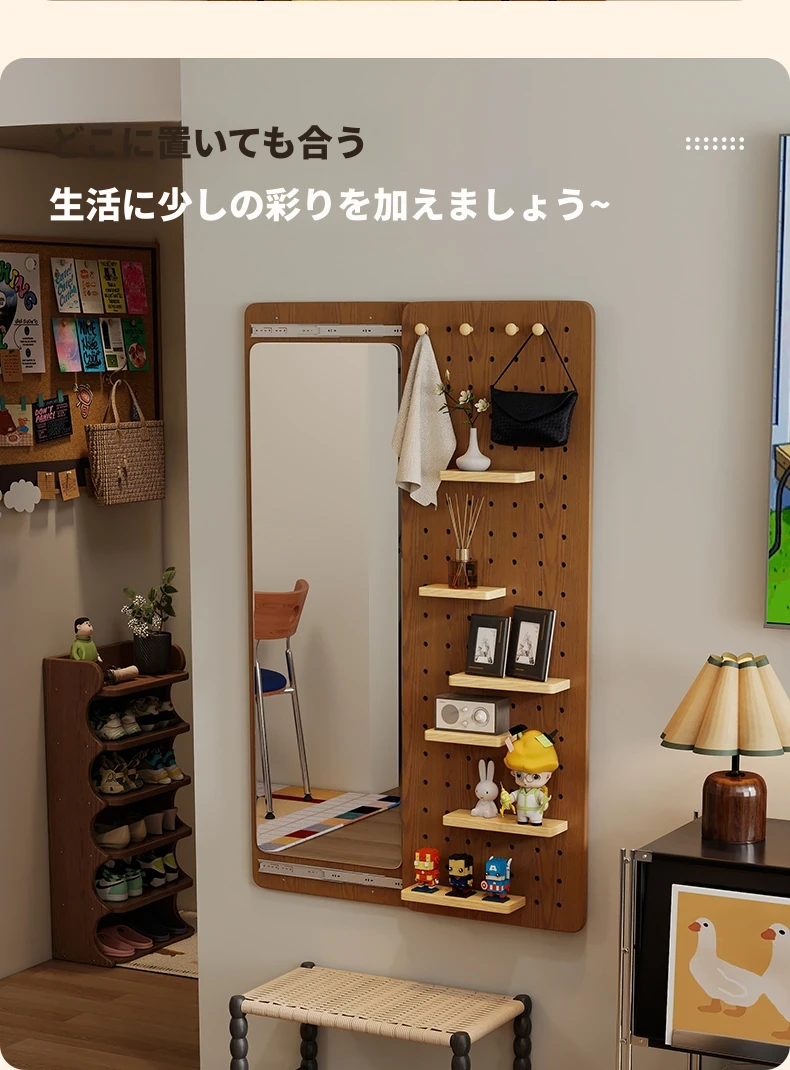 実木製の穴あきスタイル全身鏡 - 隠れた引き出し式デザイン、寝室や家庭用に最適な試着ミラー、玄関にぴったりの一体型!おしゃれで機能的なインテリアアイテム。