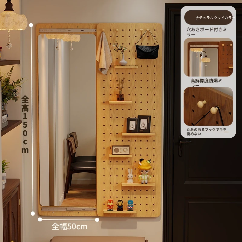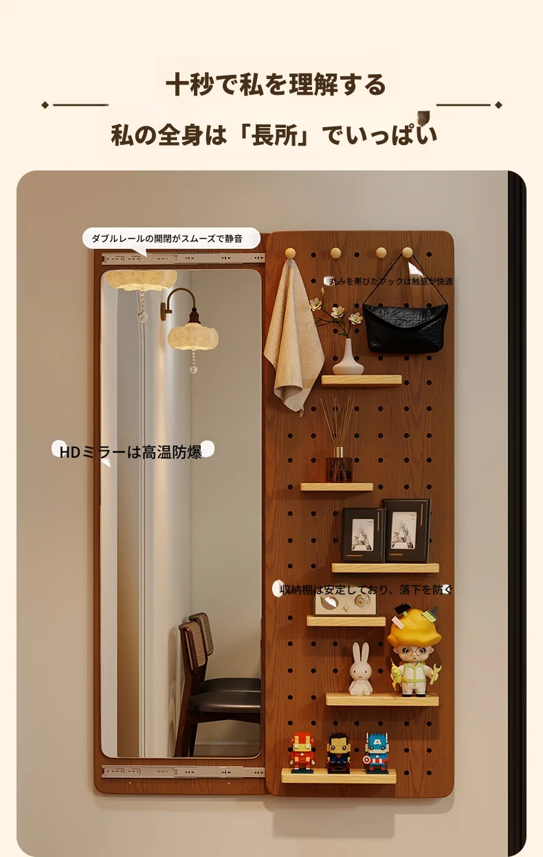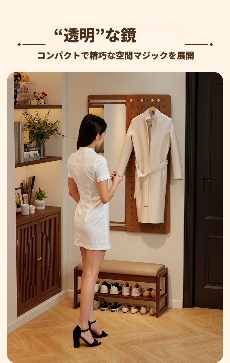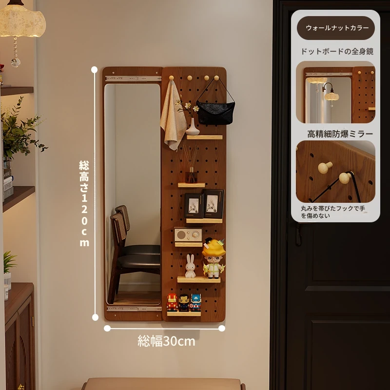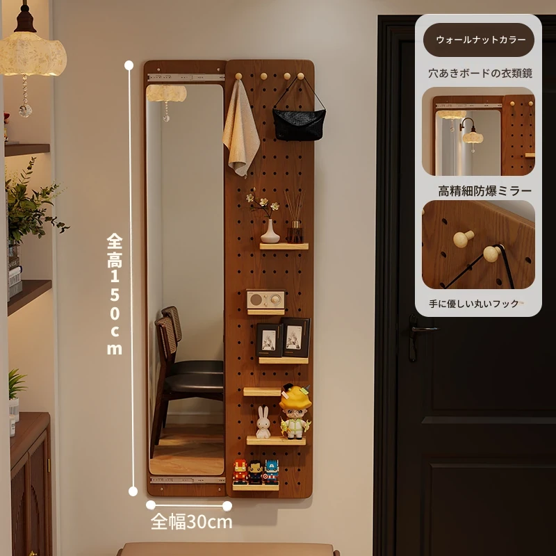 実木製の穴あきスタイル全身鏡 - 隠れた引き出し式デザイン、寝室や家庭用に最適な試着ミラー、玄関にぴったりの一体型!おしゃれで機能的なインテリアアイテム。