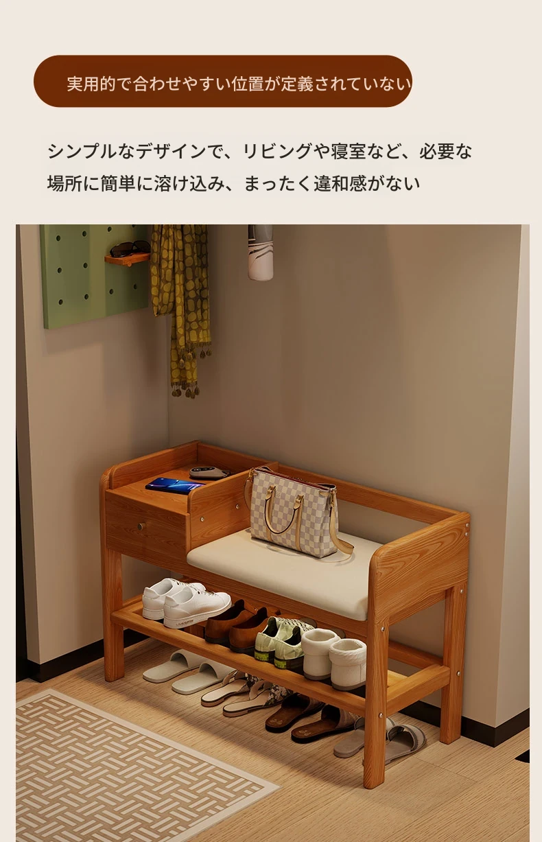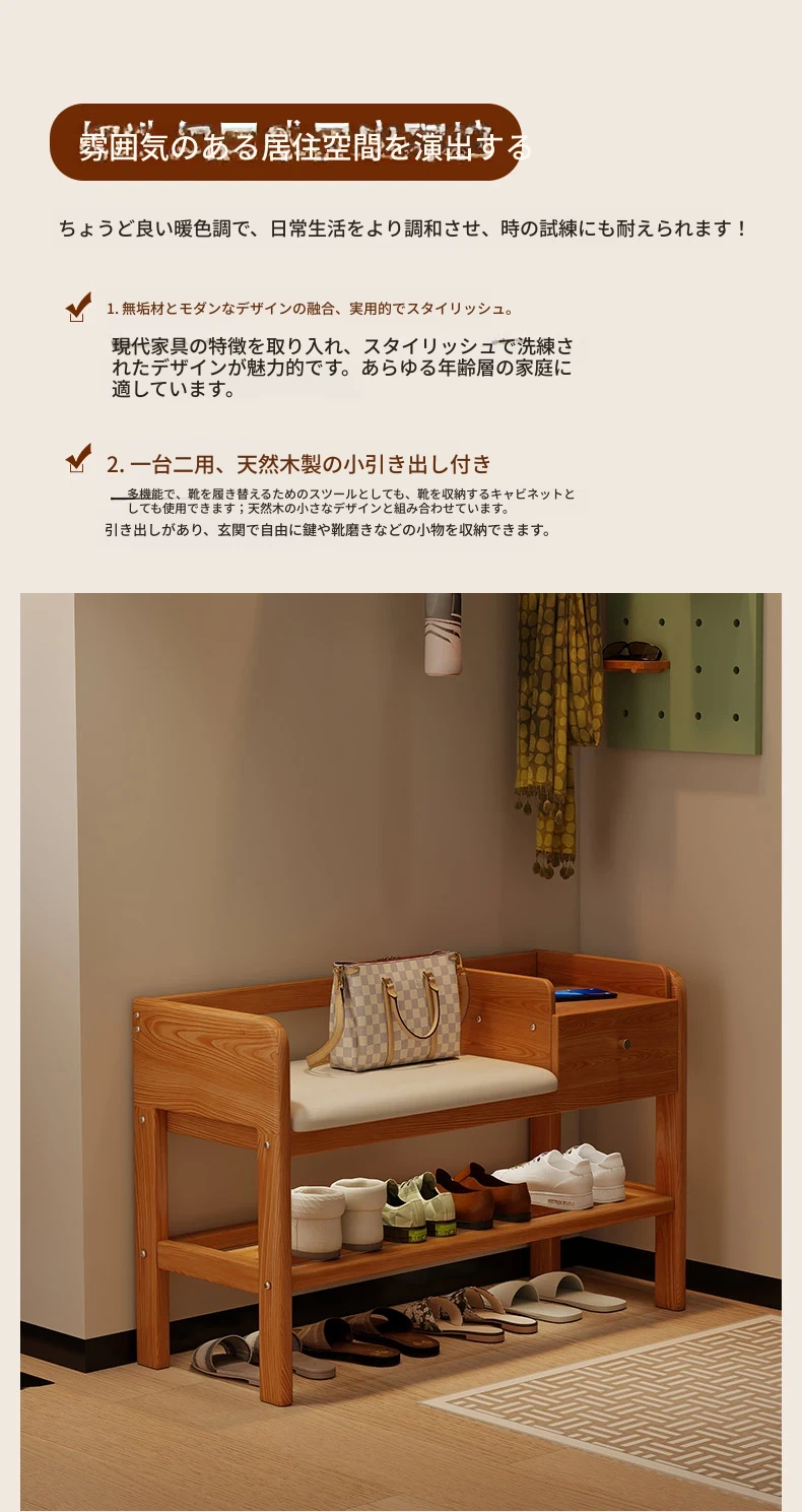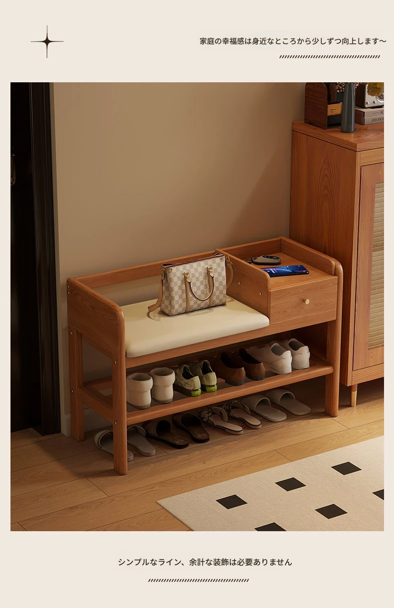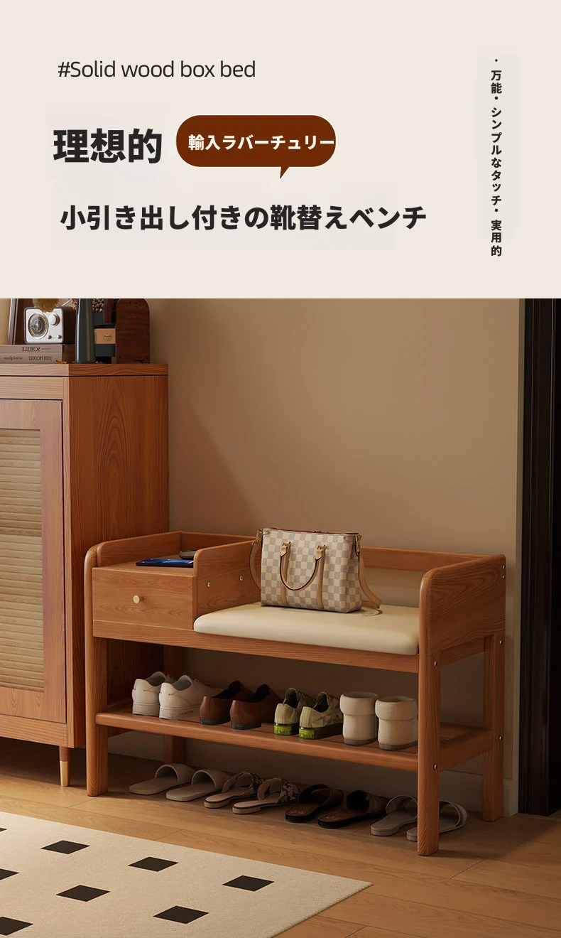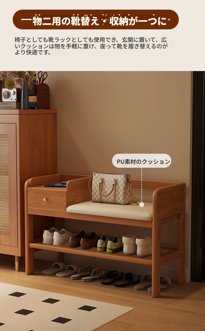 玄関用シューズベンチ - 引き出し付き、実木製で頑丈!おしゃれなエントランスを演出し、靴を履くのに便利。家に入るたびに心地よさを感じる高級感あふれるシューズラックです。