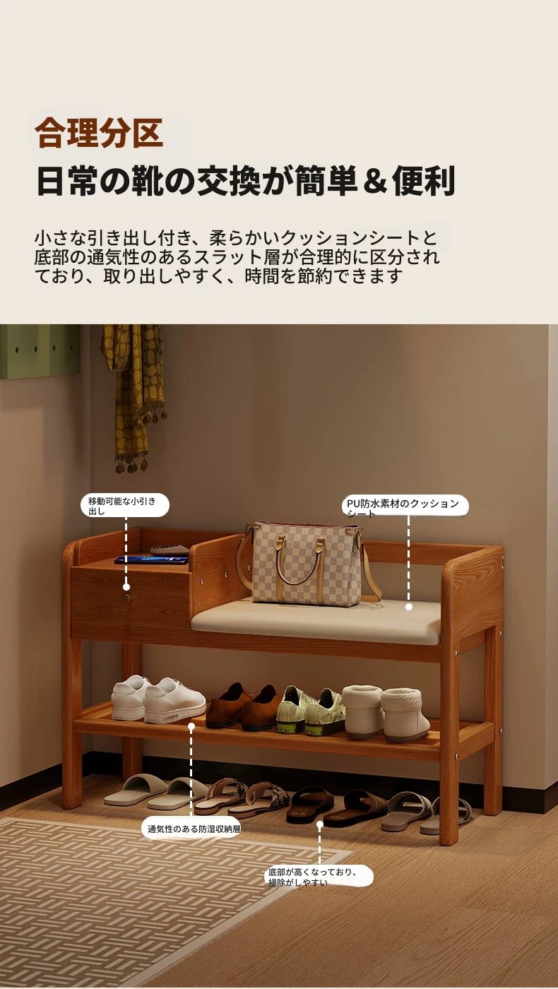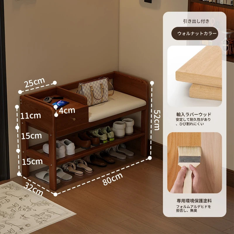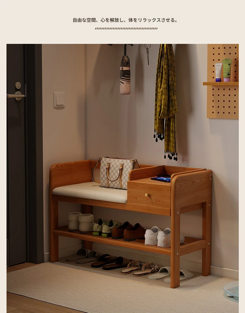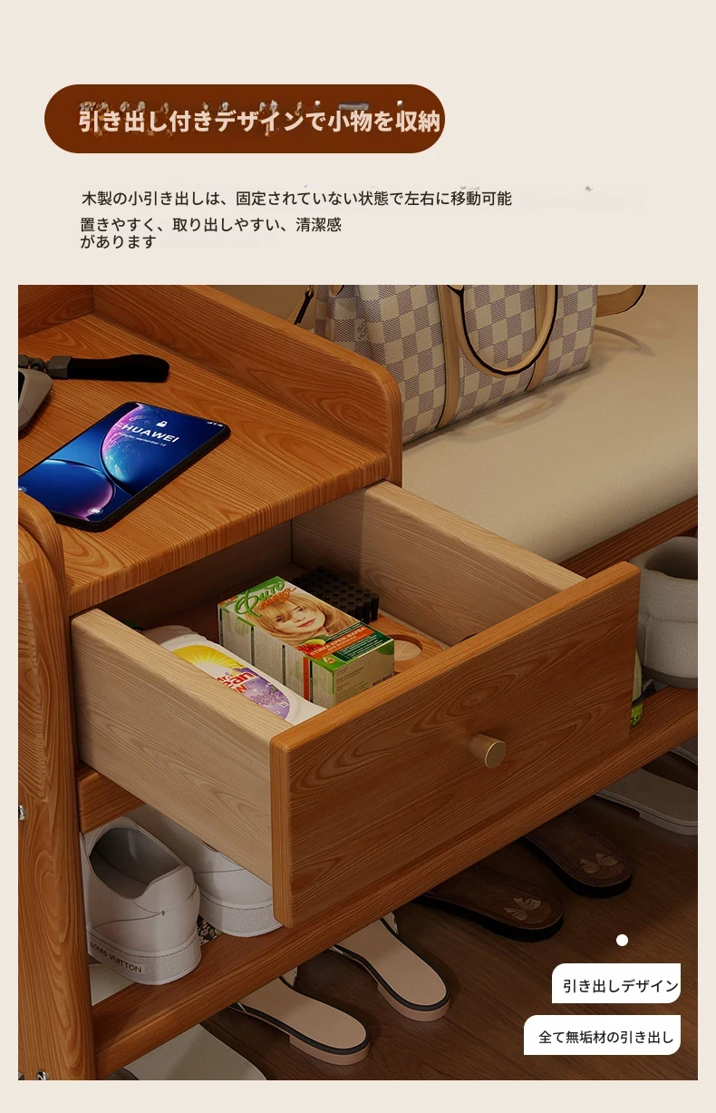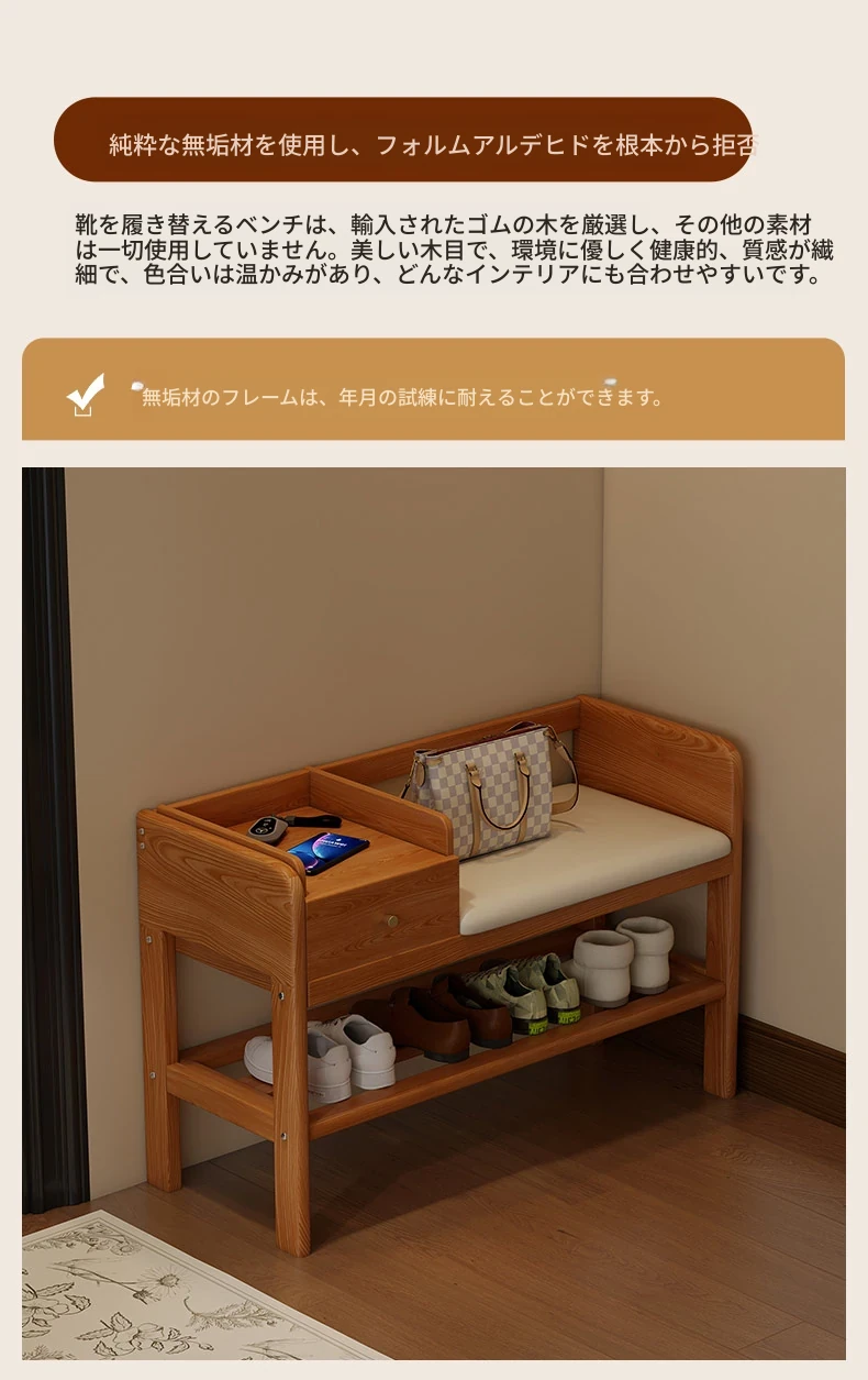玄関用シューズベンチ - 引き出し付き、実木製で頑丈!おしゃれなエントランスを演出し、靴を履くのに便利。家に入るたびに心地よさを感じる高級感あふれるシューズラックです。