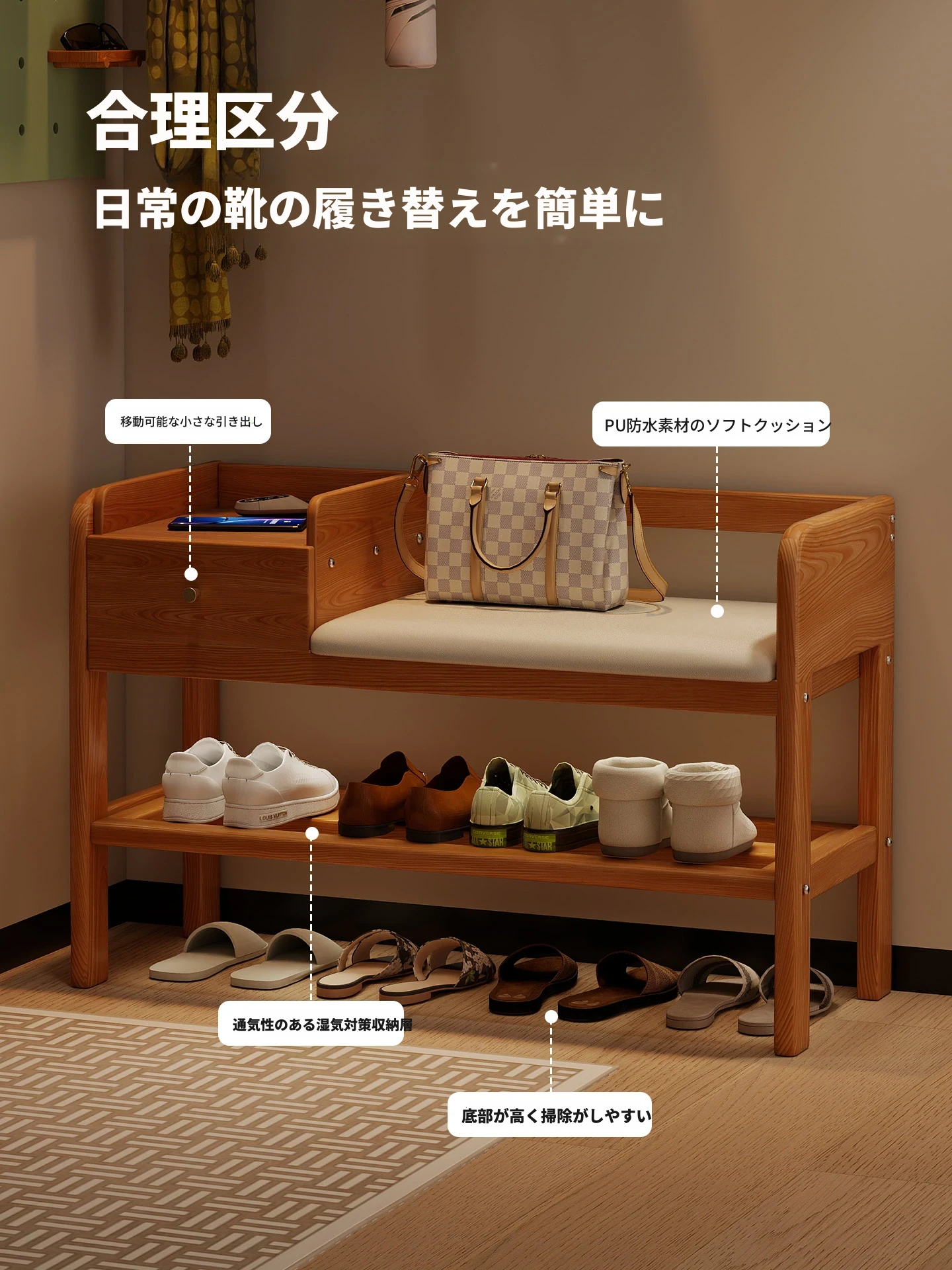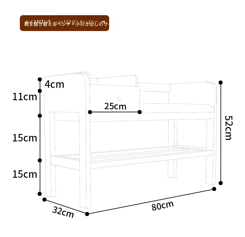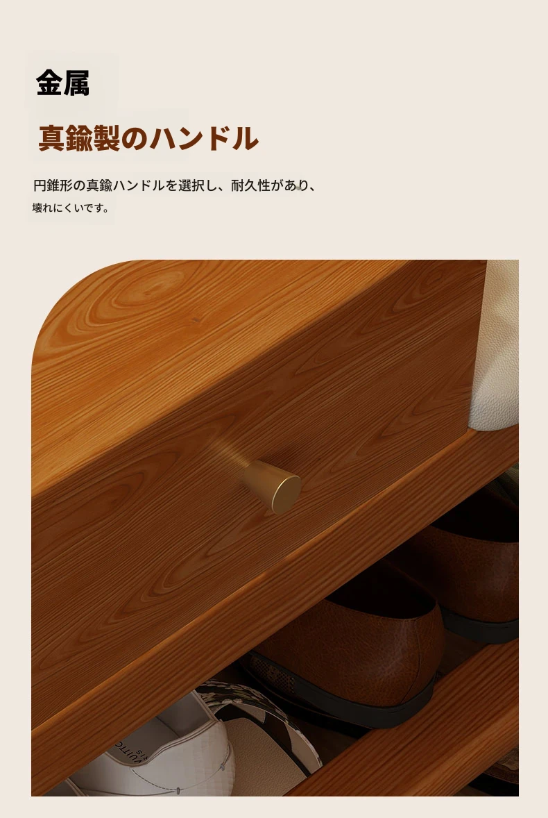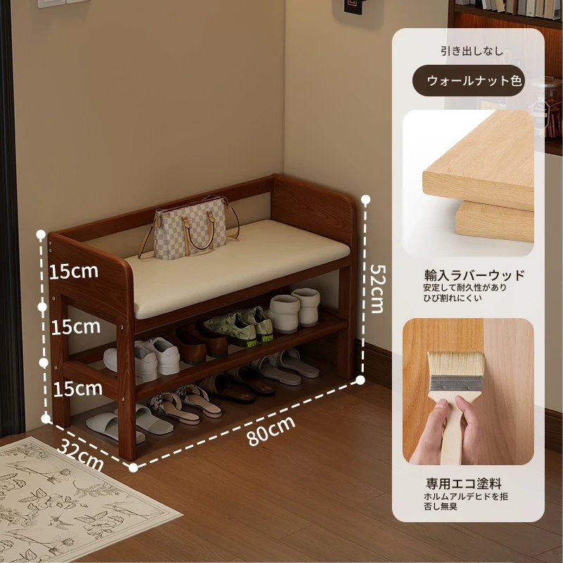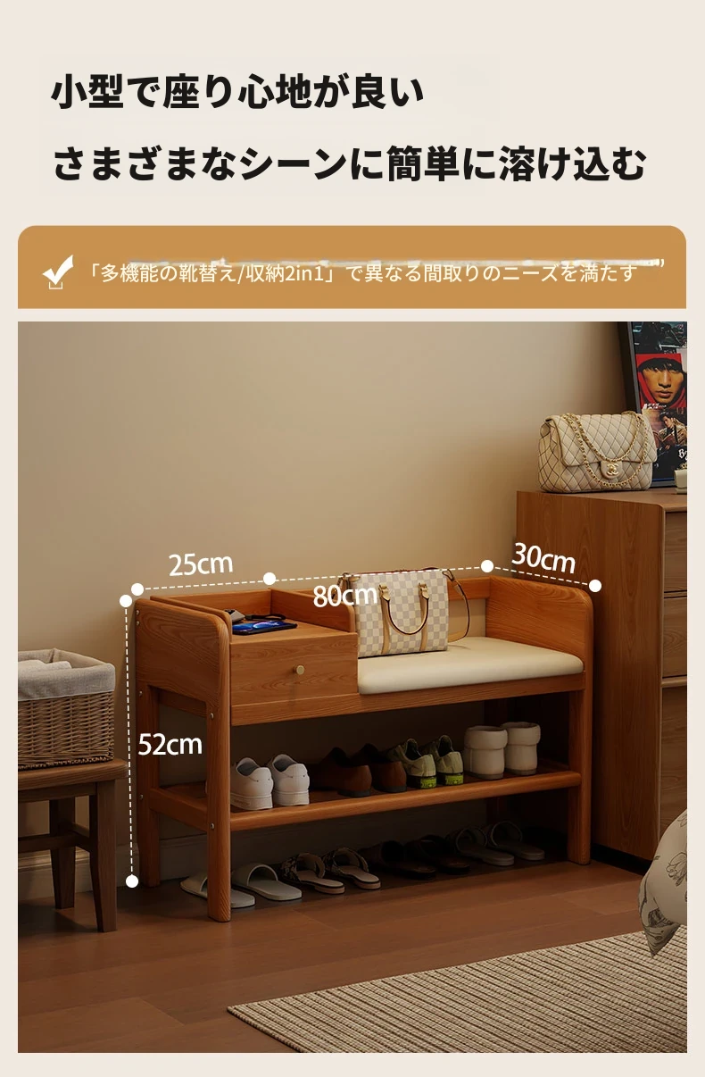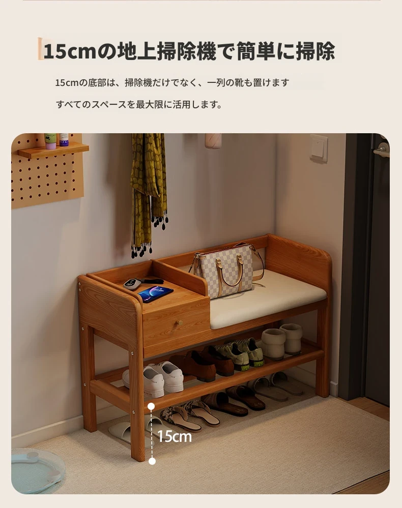玄関用シューズベンチ - 引き出し付き、実木製で頑丈!おしゃれなエントランスを演出し、靴を履くのに便利。家に入るたびに心地よさを感じる高級感あふれるシューズラックです。