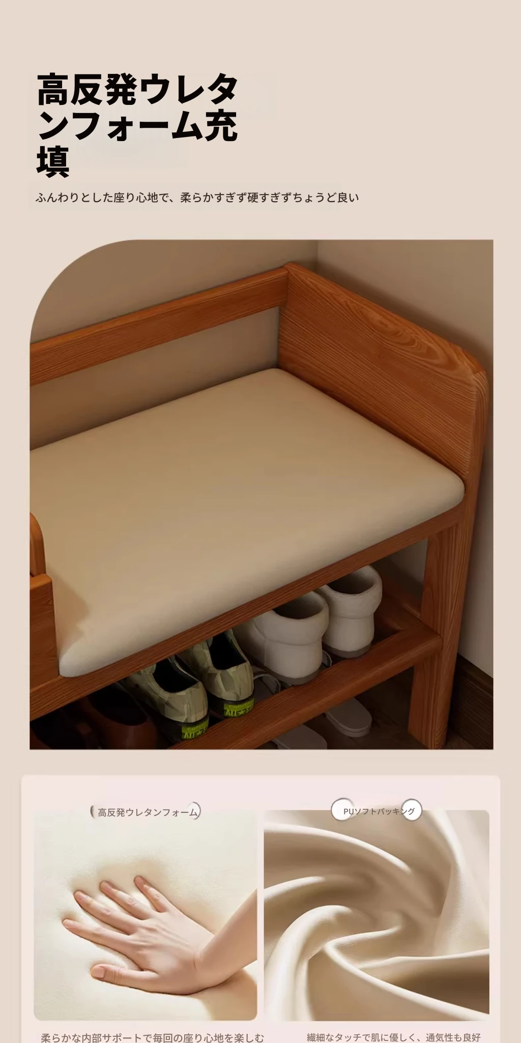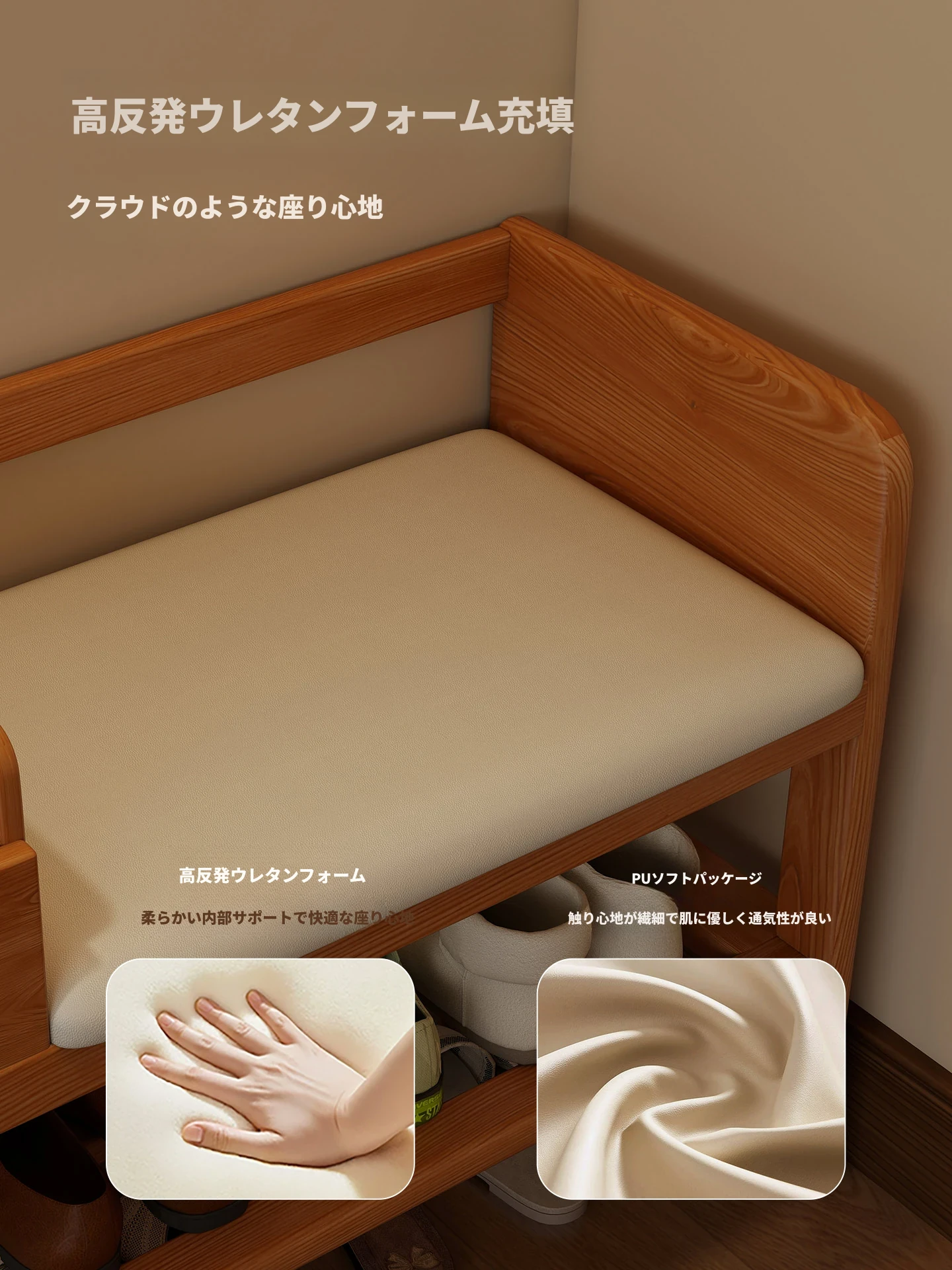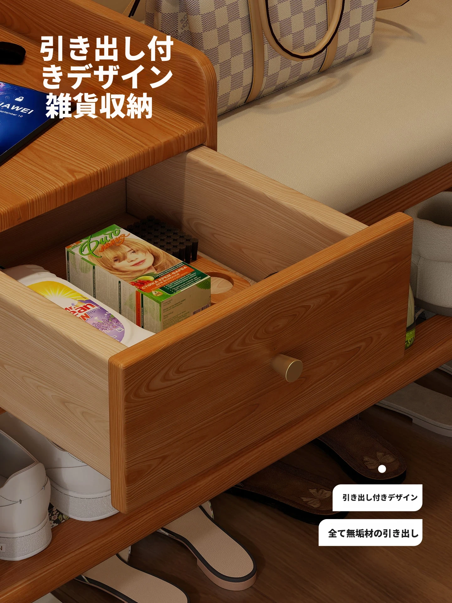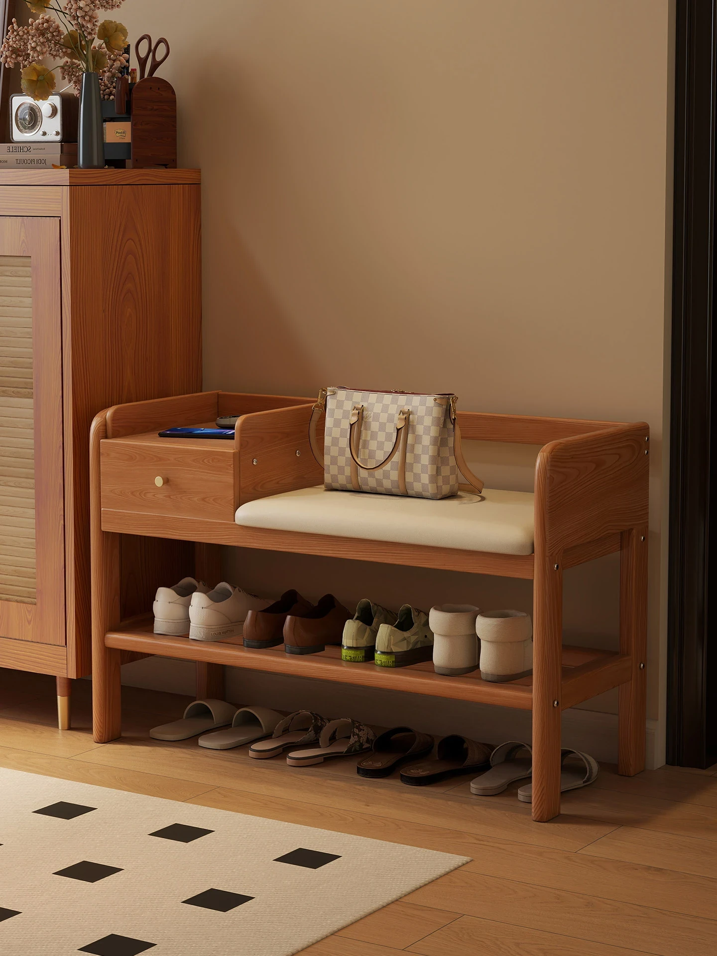 玄関用シューズベンチ - 引き出し付き、実木製で頑丈!おしゃれなエントランスを演出し、靴を履くのに便利。家に入るたびに心地よさを感じる高級感あふれるシューズラックです。