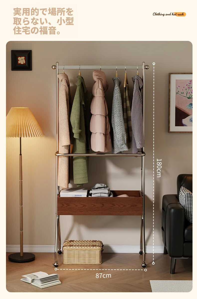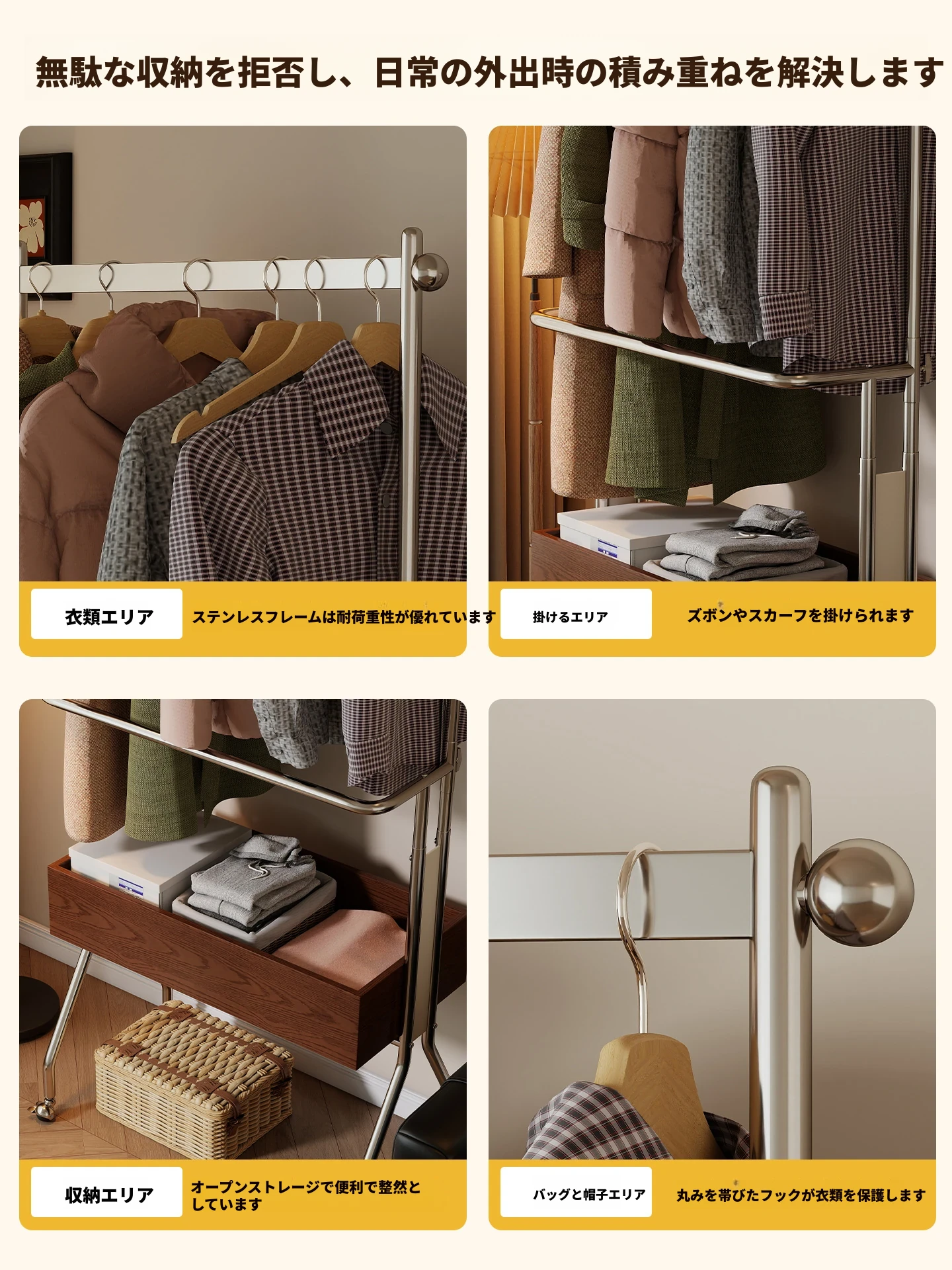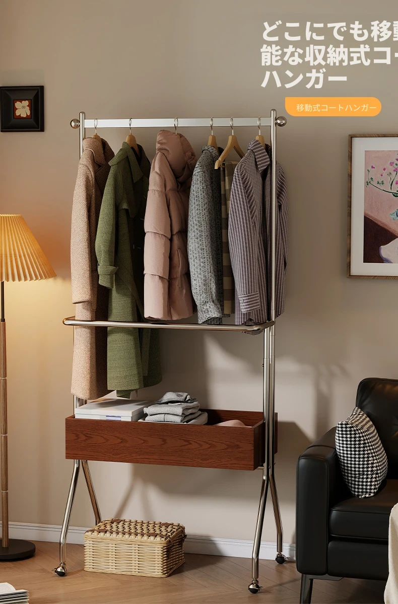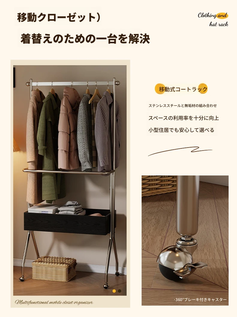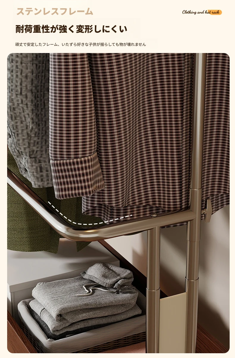 軽やかにおしゃれを楽しむ!ステンレス製のダブルレイヤーコートハンガー - 家庭用玄関・寝室にぴったりの中古移動式衣類収納ラック。スタイリッシュなデザインで、スペースを有効活用しながら、衣類を美しく飾ります。