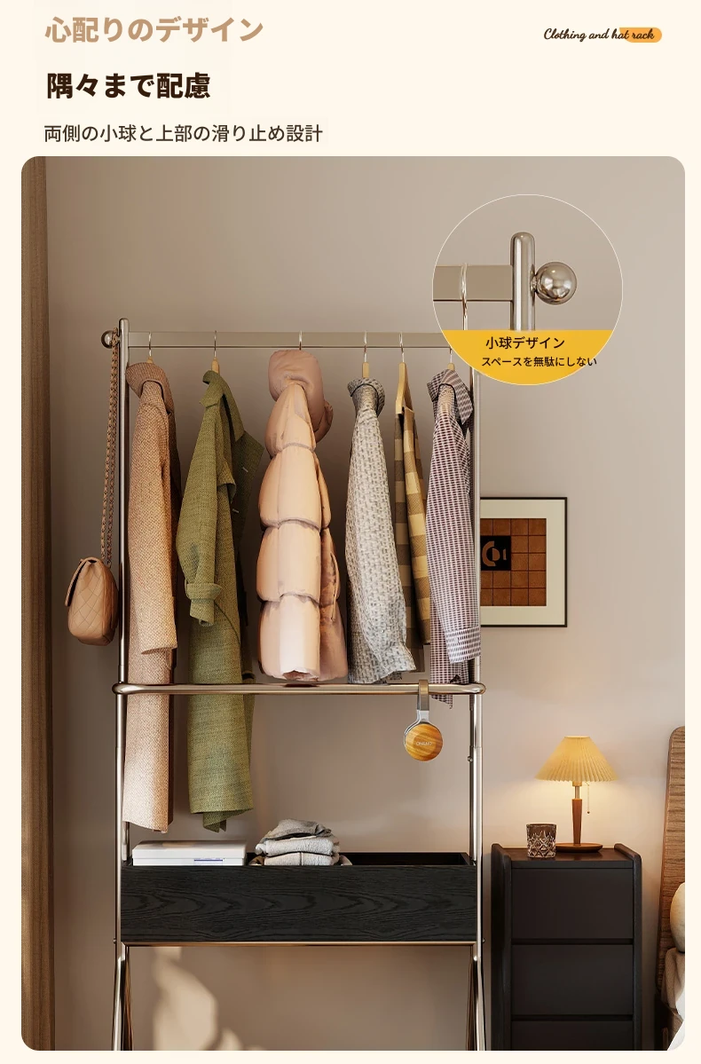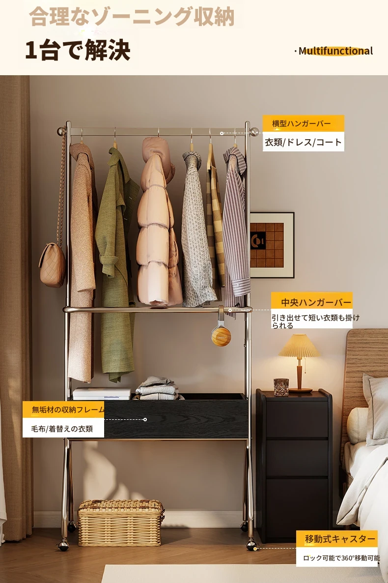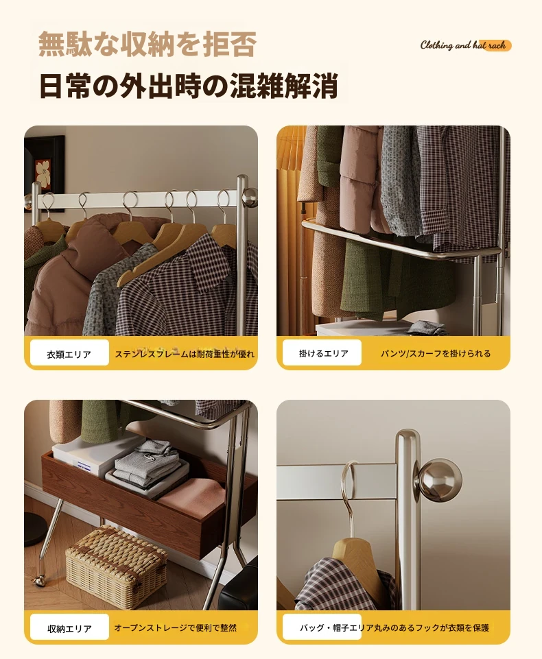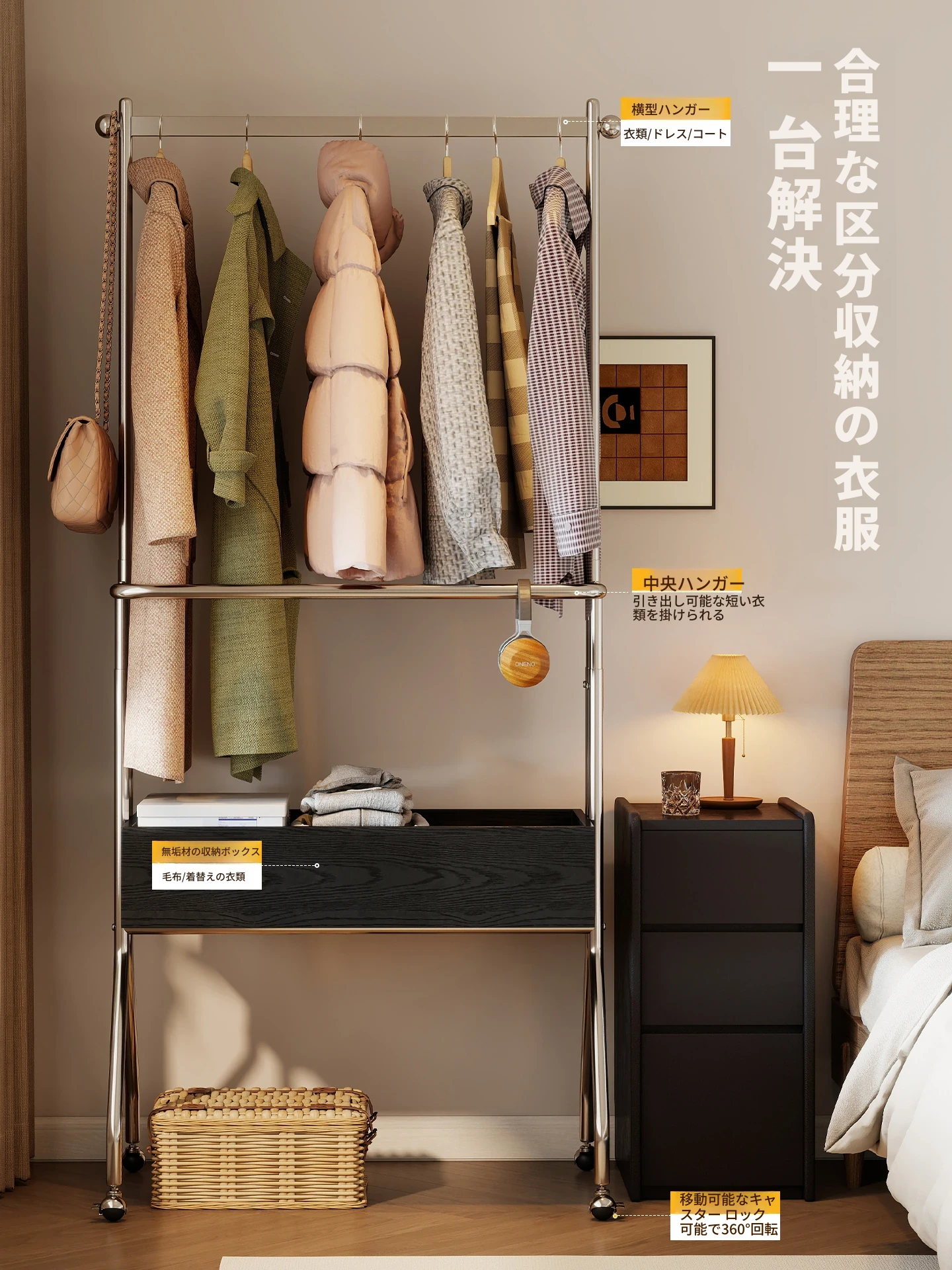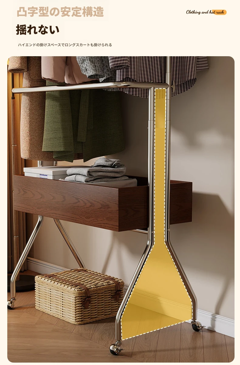 軽やかにおしゃれを楽しむ!ステンレス製のダブルレイヤーコートハンガー - 家庭用玄関・寝室にぴったりの中古移動式衣類収納ラック。スタイリッシュなデザインで、スペースを有効活用しながら、衣類を美しく飾ります。