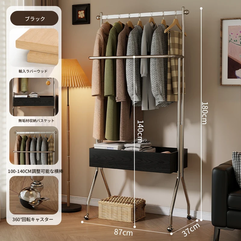 黒色-移動式コートラック【100-140cm調整可能な横棒】