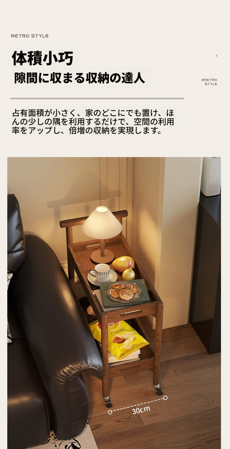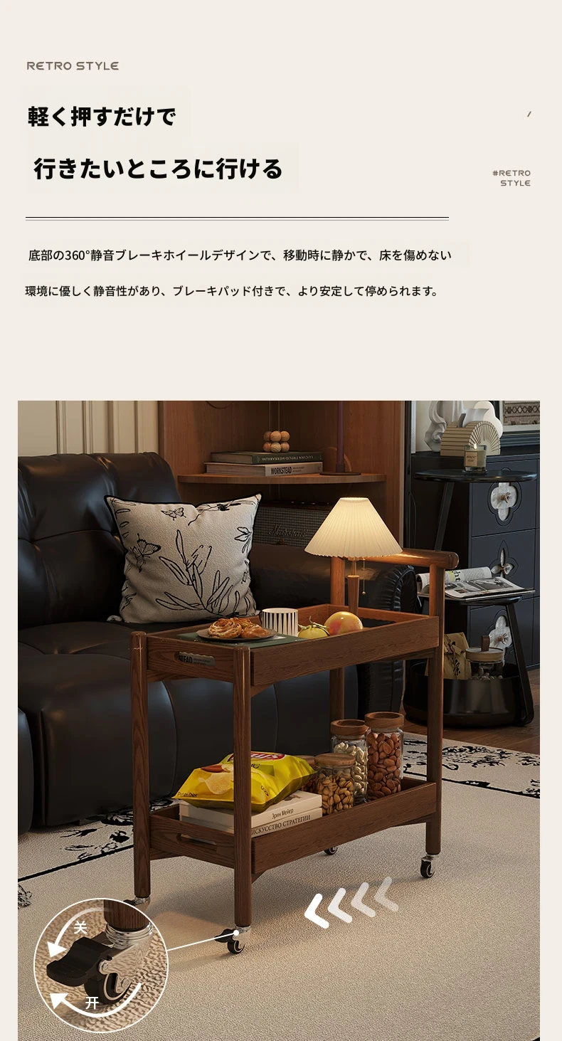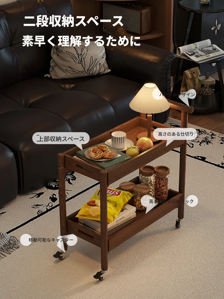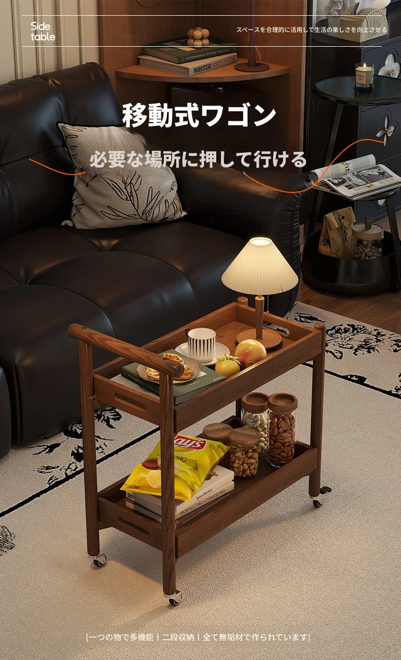 キャスター付きの実木製小型サイドテーブル - リビングに最適な収納力抜群のティーカート!おしゃれなデザインで、お茶やスナックを手軽に運べる便利アイテム。お部屋をスッキリ整える、あなたの新しい相棒です!