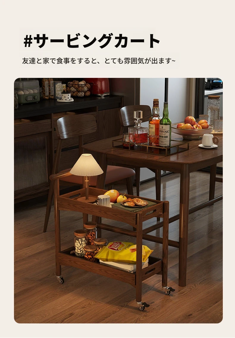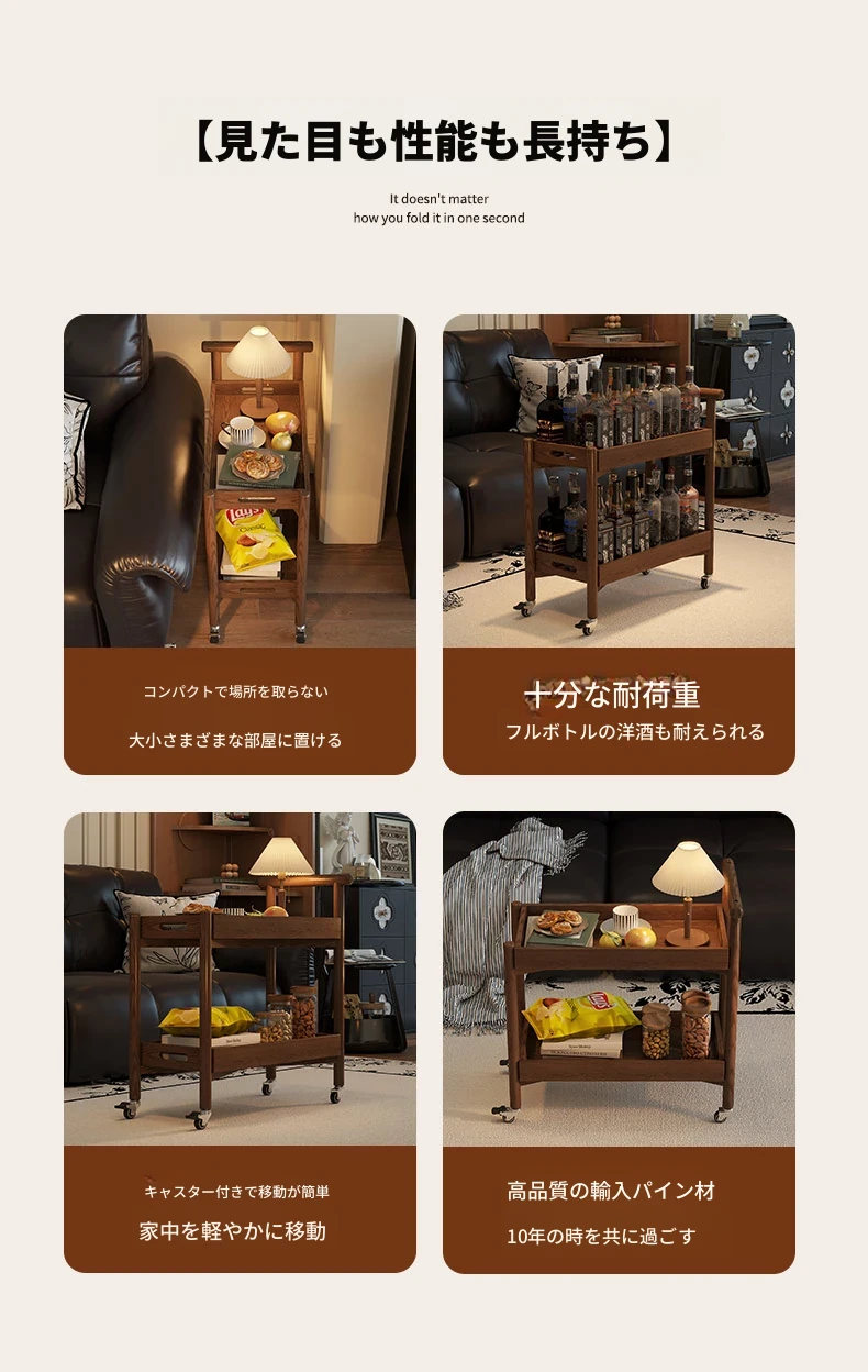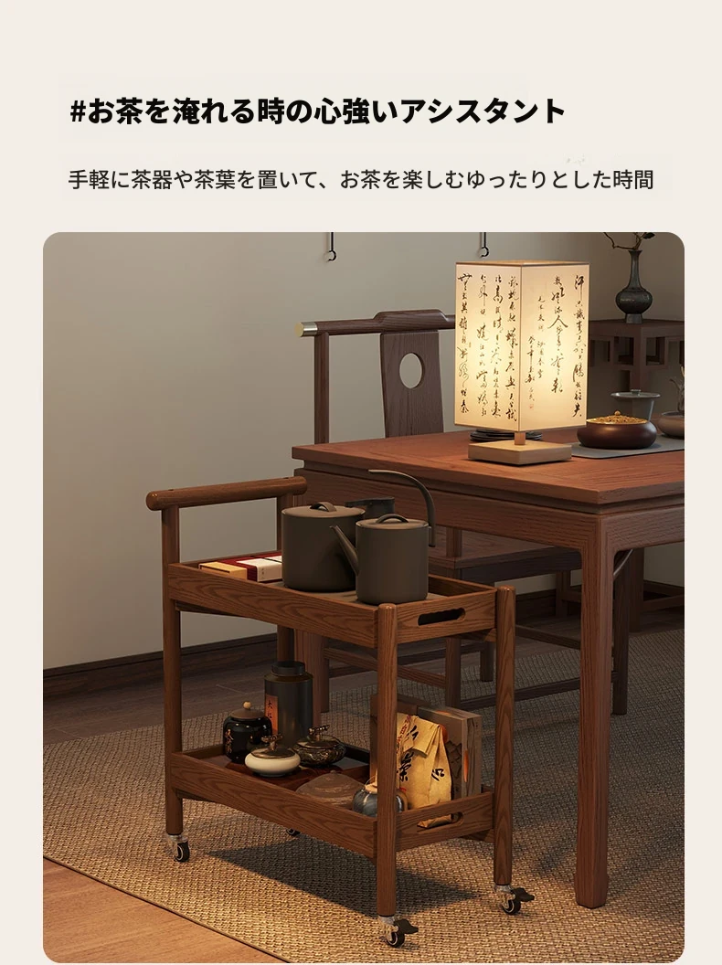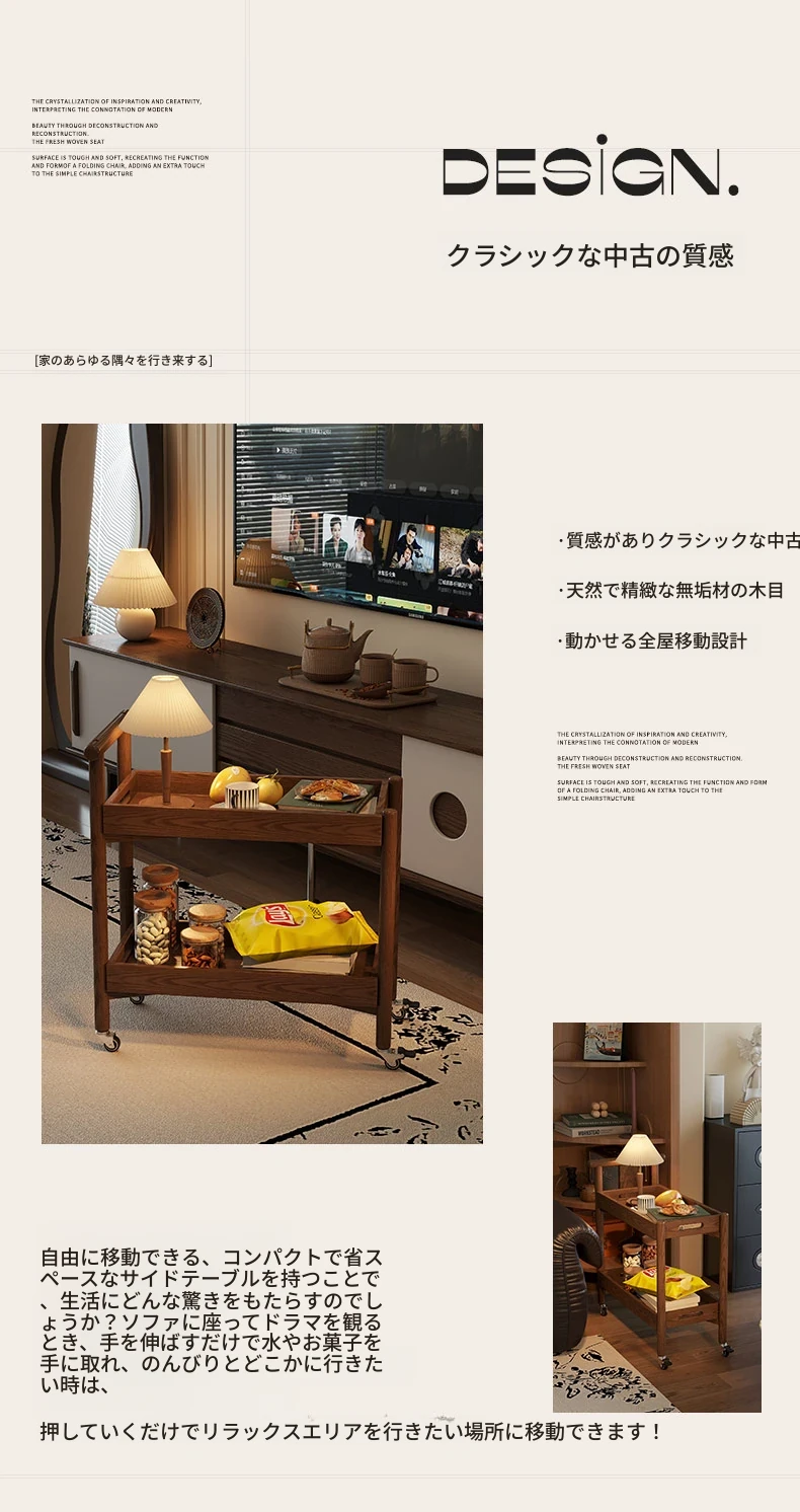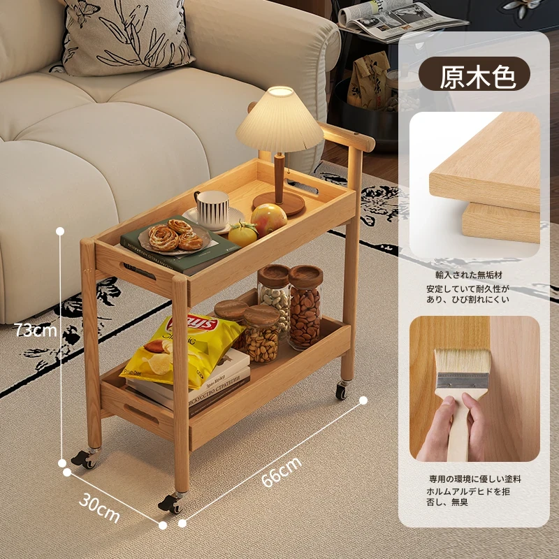 キャスター付きの実木製小型サイドテーブル - リビングに最適な収納力抜群のティーカート!おしゃれなデザインで、お茶やスナックを手軽に運べる便利アイテム。お部屋をスッキリ整える、あなたの新しい相棒です!