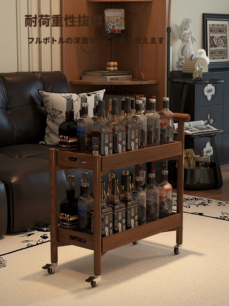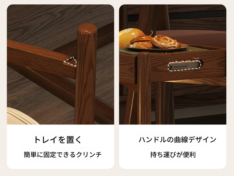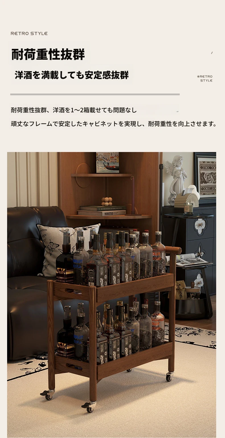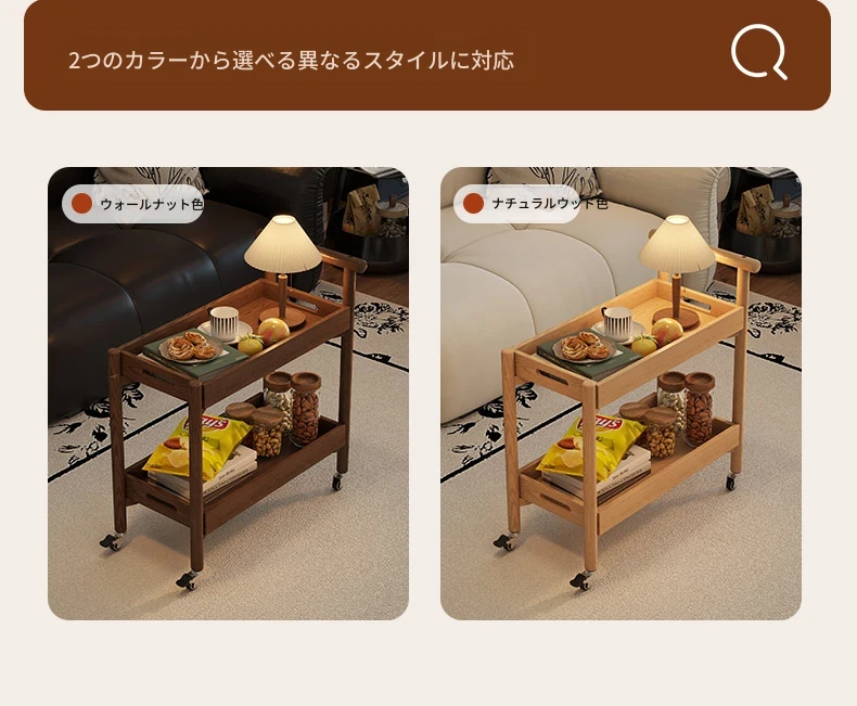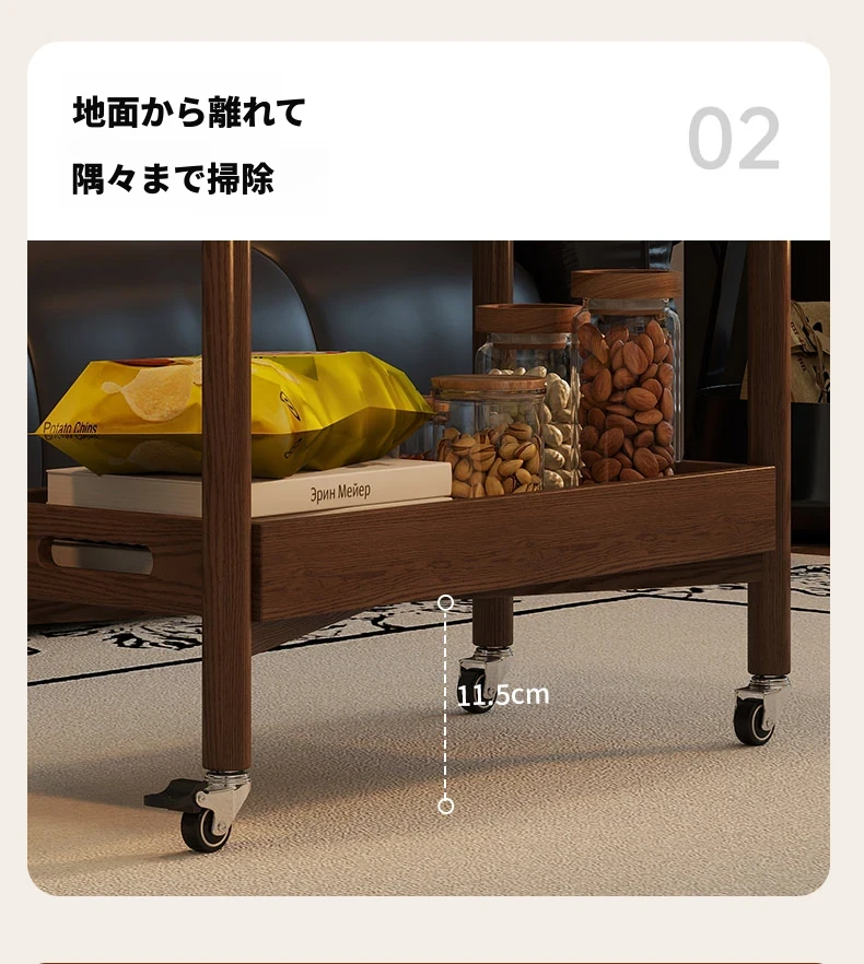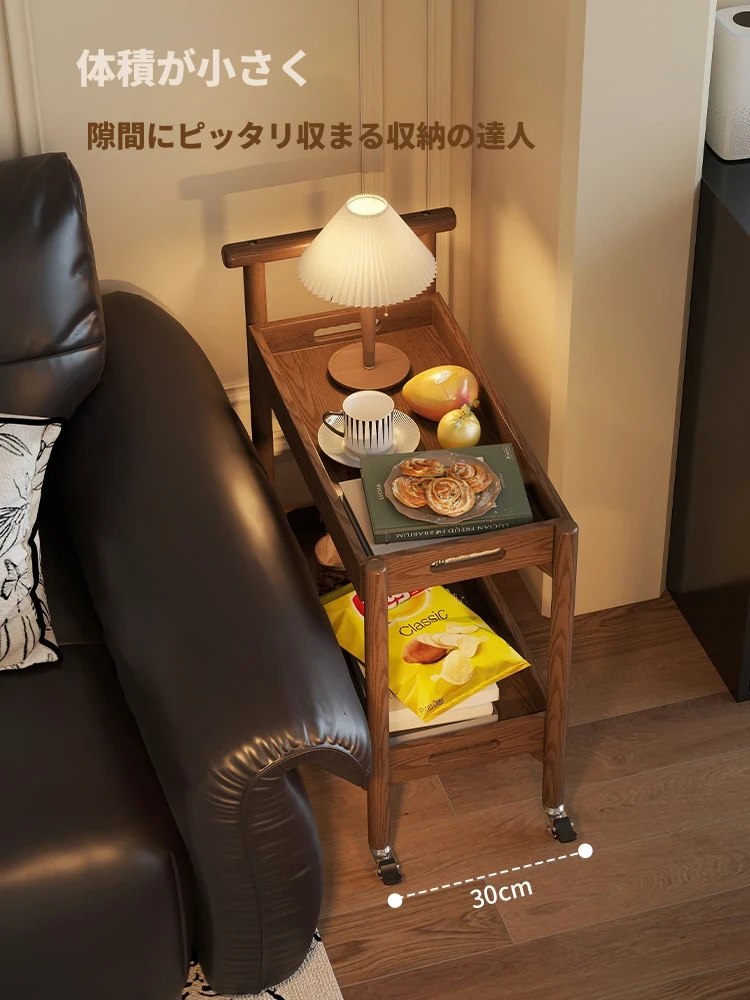 キャスター付きの実木製小型サイドテーブル - リビングに最適な収納力抜群のティーカート!おしゃれなデザインで、お茶やスナックを手軽に運べる便利アイテム。お部屋をスッキリ整える、あなたの新しい相棒です!