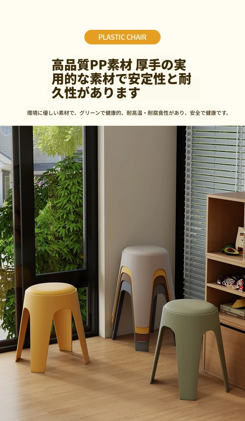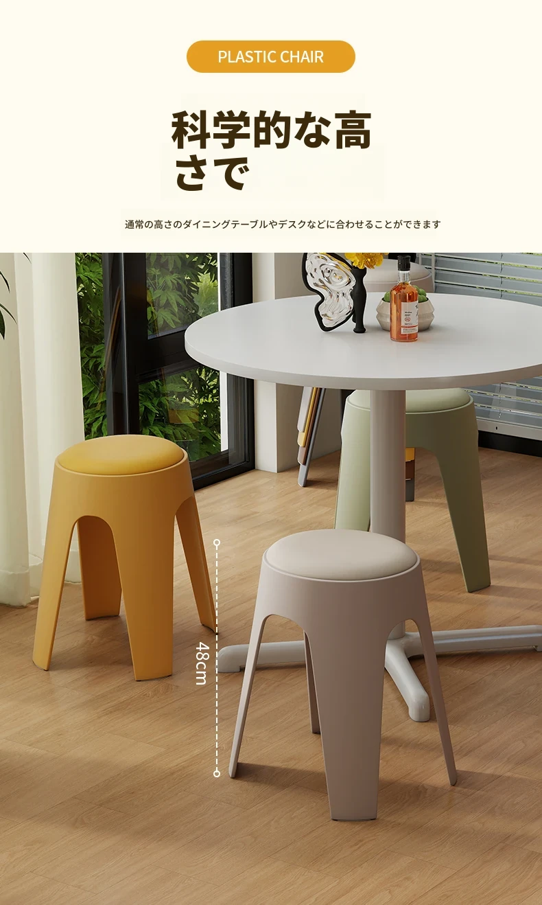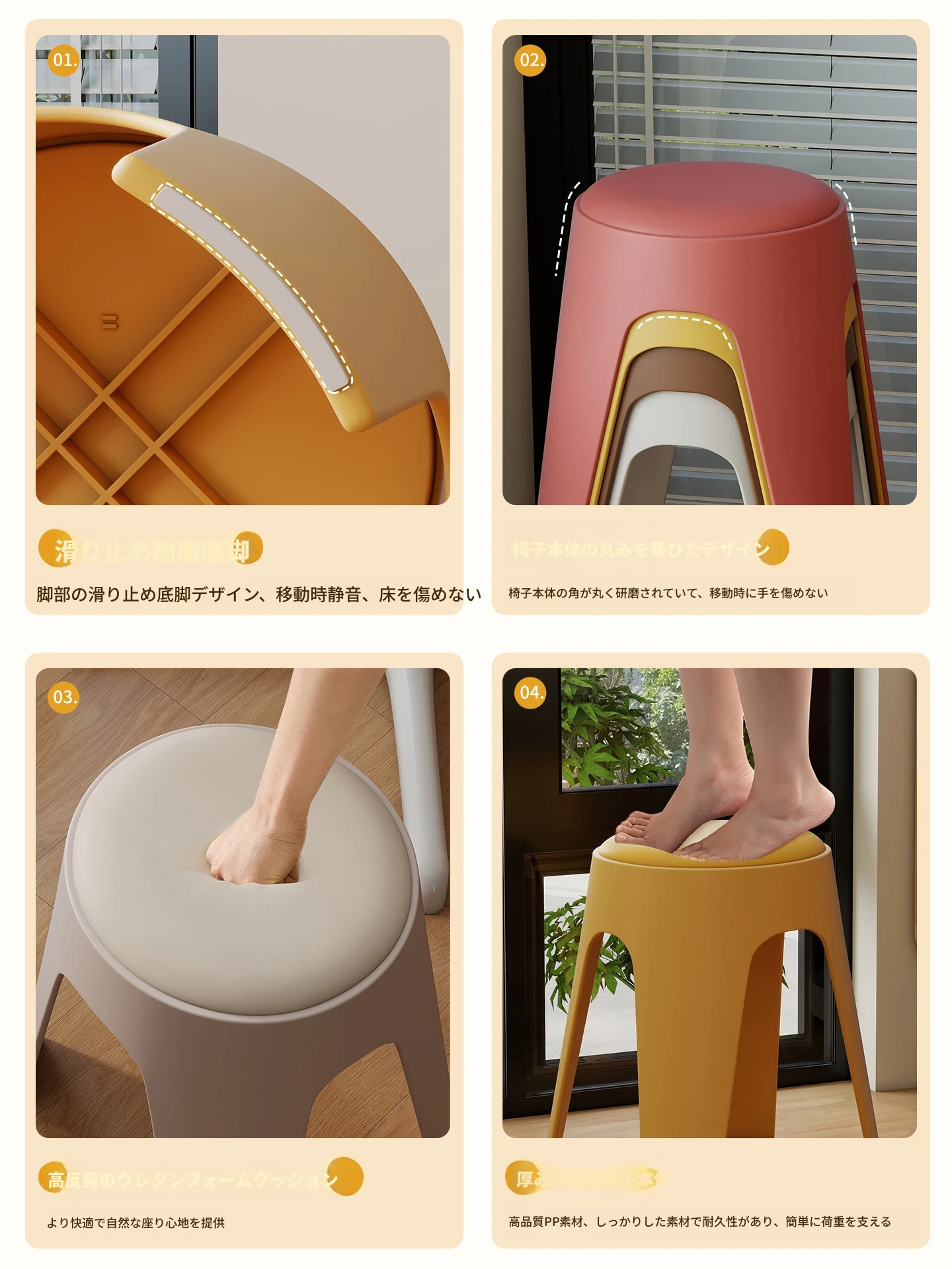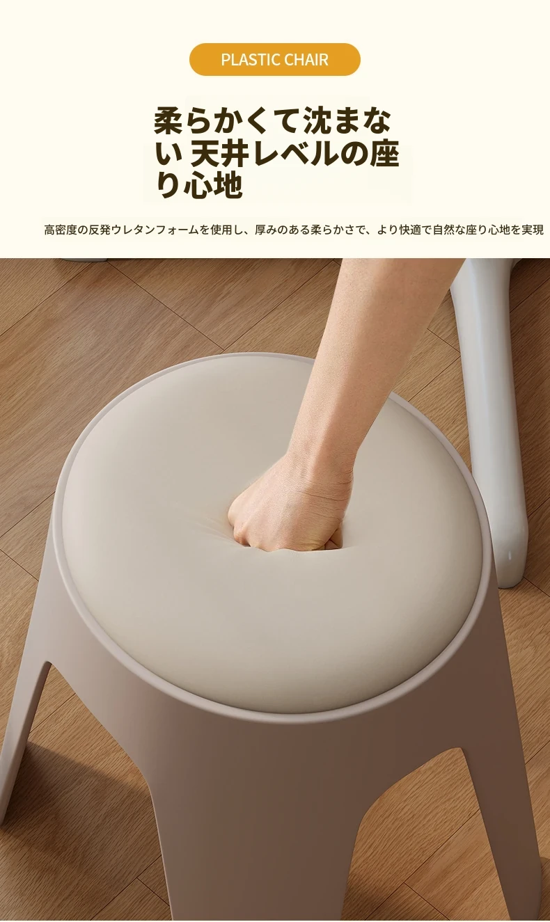 厚手仕様のプラスチック製スツール - 収納便利なスタッキング式、柔らかなクッション付きの円形デザイン。シンプルでモダンなリビングやダイニングにぴったりのクリエイティブなハイスツール!