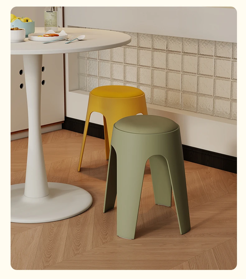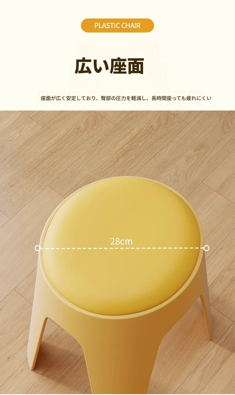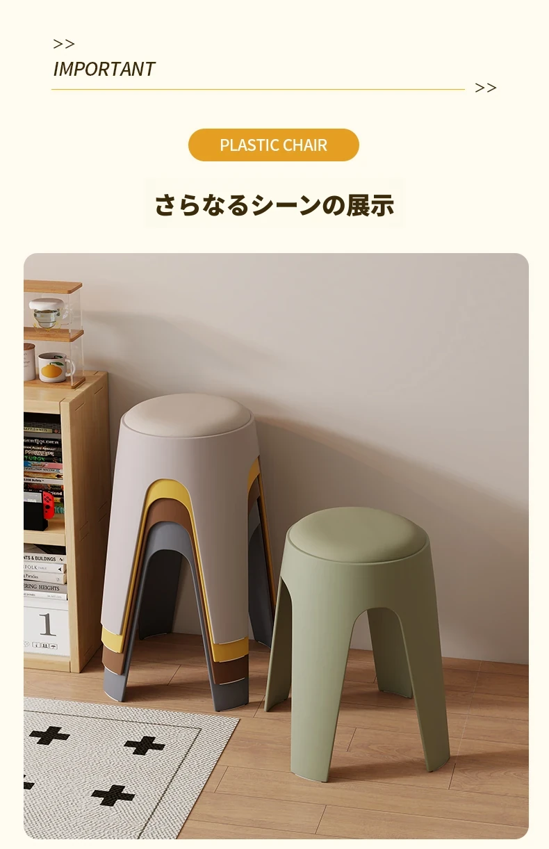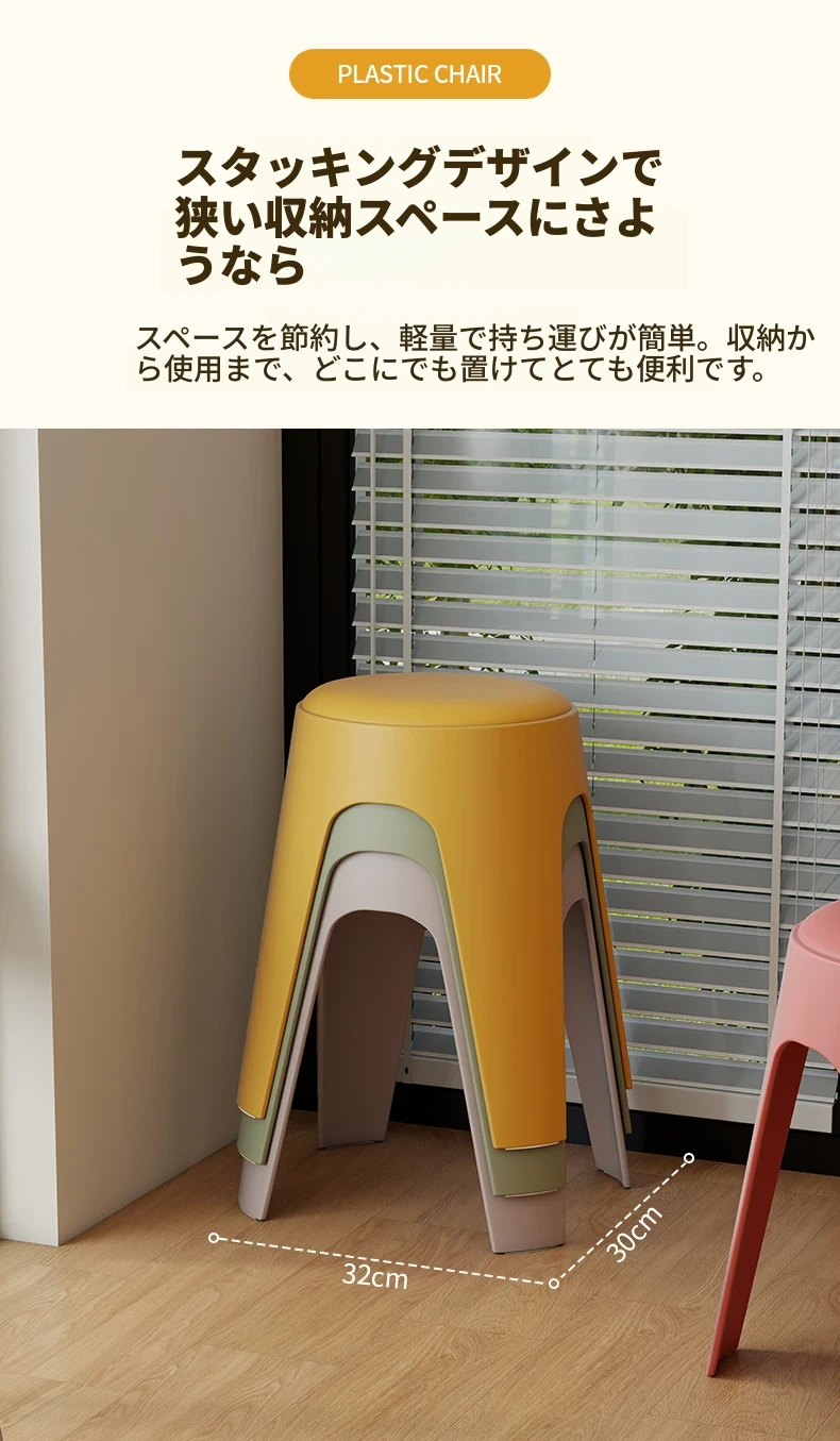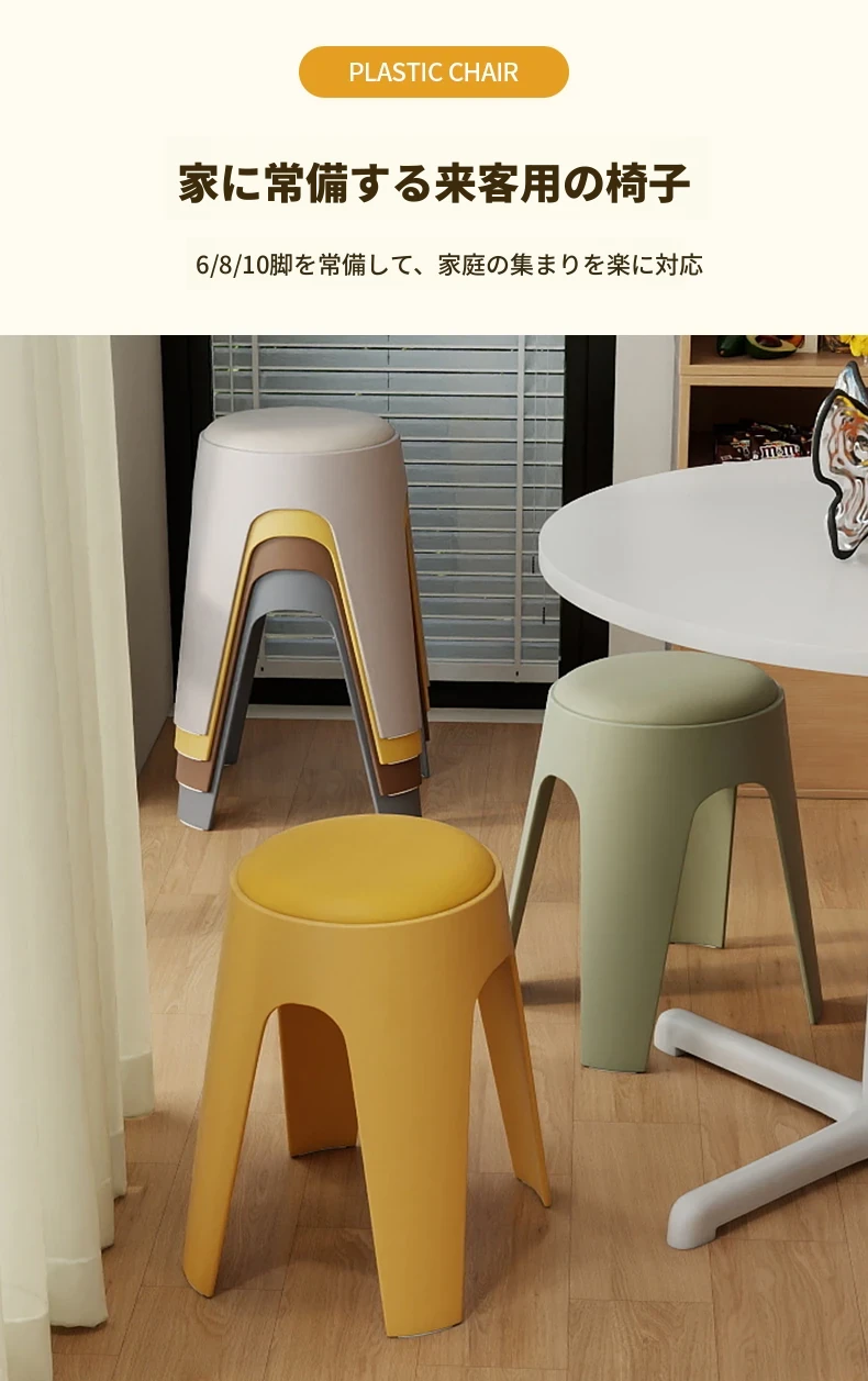 厚手仕様のプラスチック製スツール - 収納便利なスタッキング式、柔らかなクッション付きの円形デザイン。シンプルでモダンなリビングやダイニングにぴったりのクリエイティブなハイスツール!