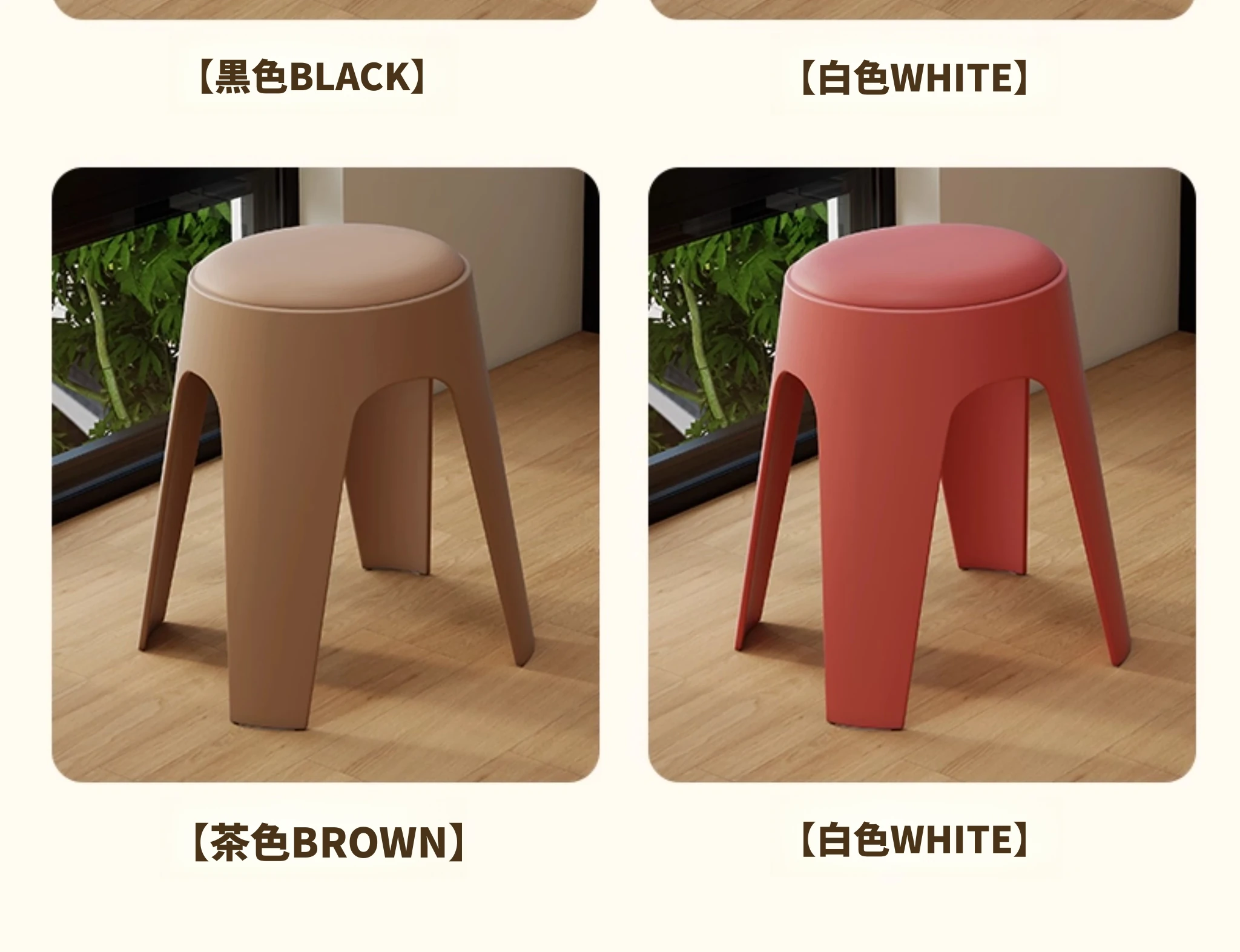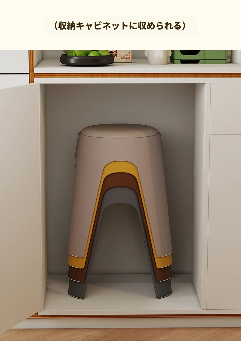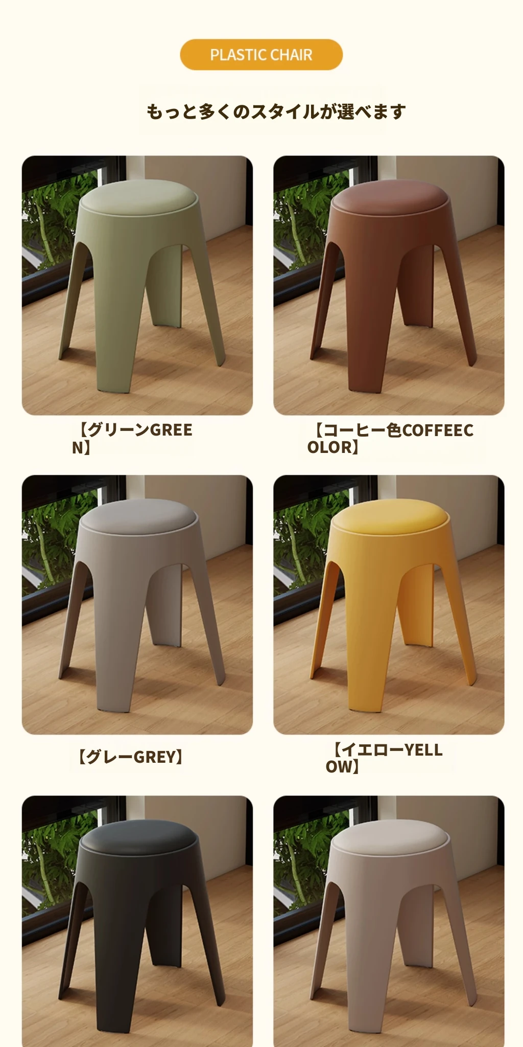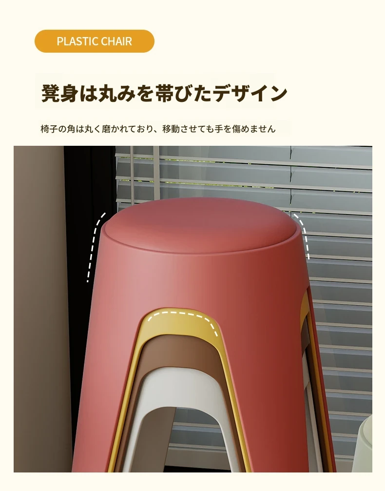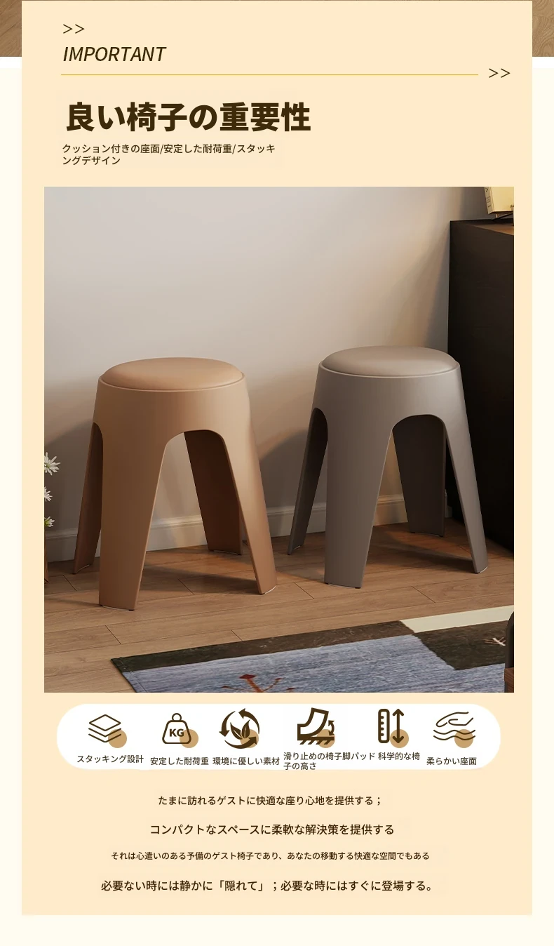 厚手仕様のプラスチック製スツール - 収納便利なスタッキング式、柔らかなクッション付きの円形デザイン。シンプルでモダンなリビングやダイニングにぴったりのクリエイティブなハイスツール!