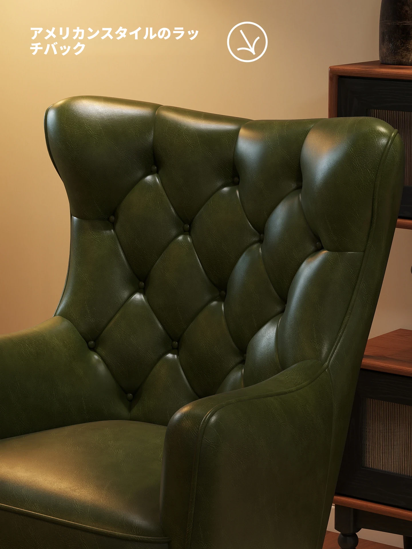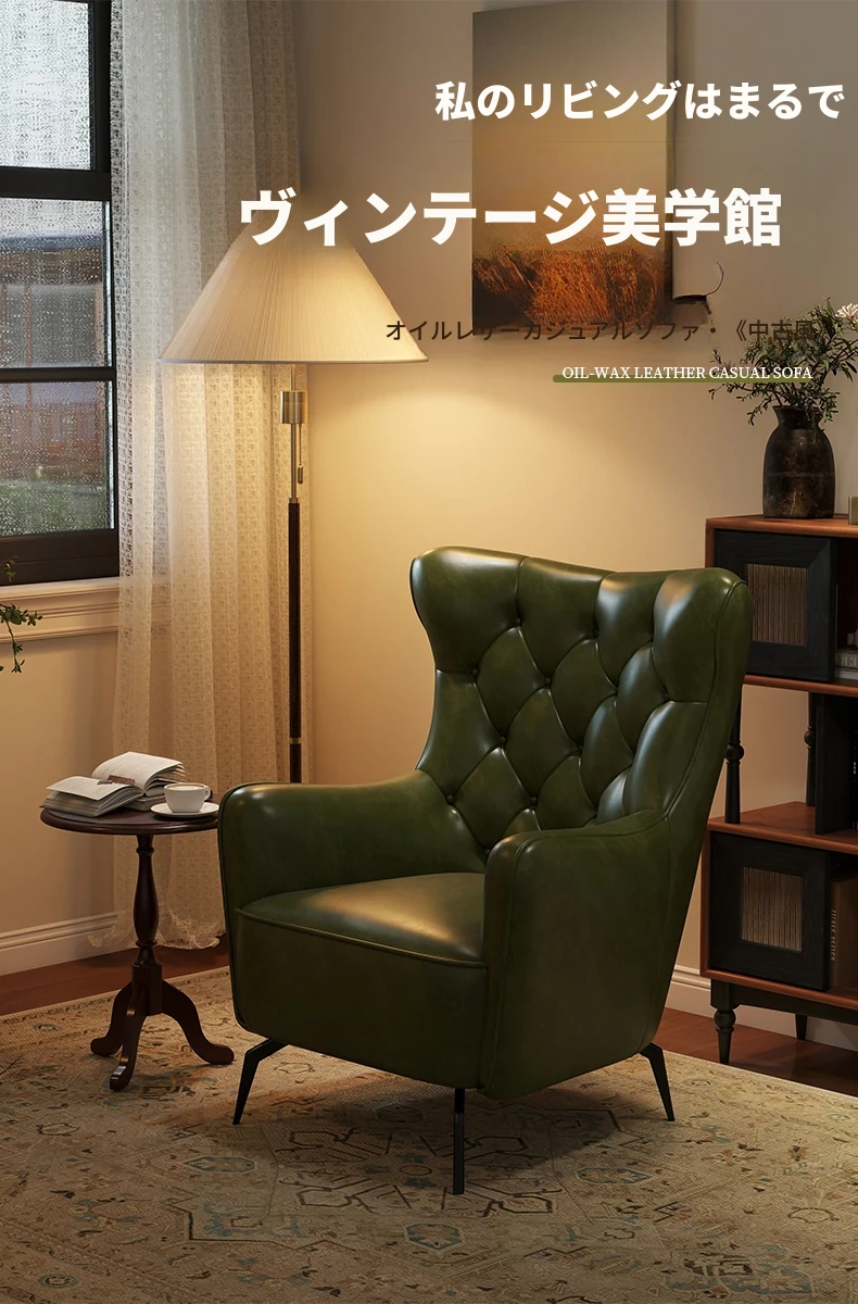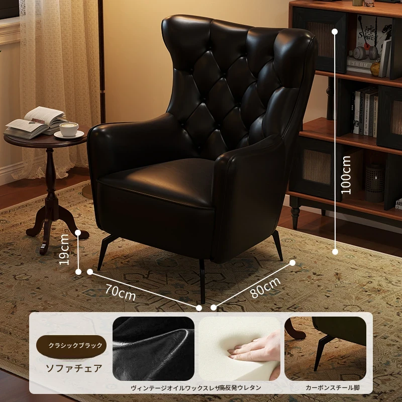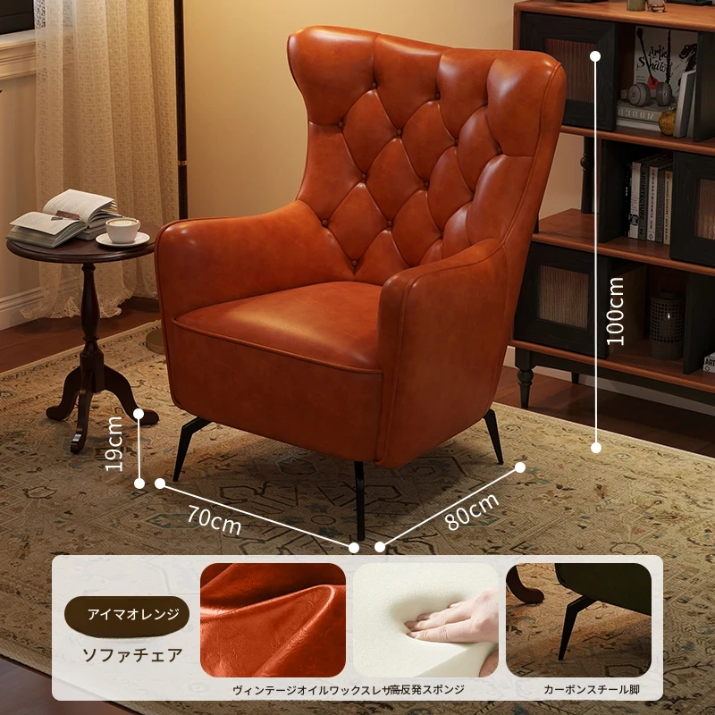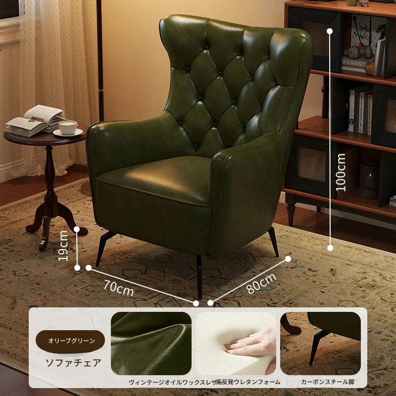 レトロな一人掛けソファー|オイルワックスレザー使用のアメリカンハイバックソファ|リビングや商談に最適なエレガントな一人椅子!快適な座り心地で、あなたの空間をスタイリッシュに演出します。