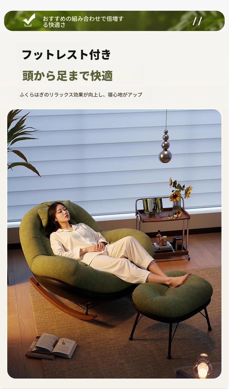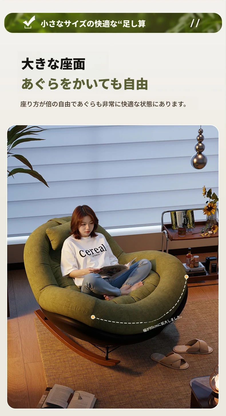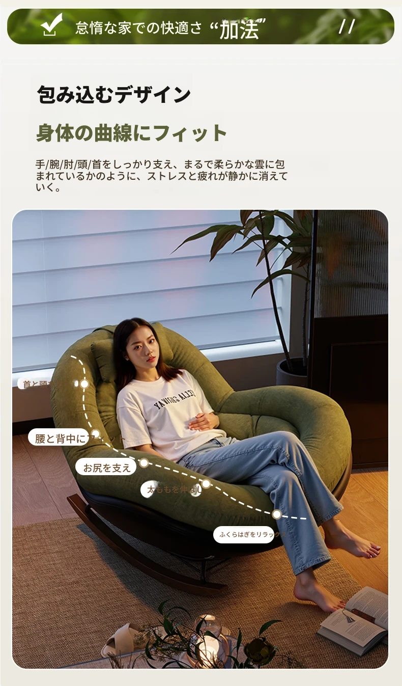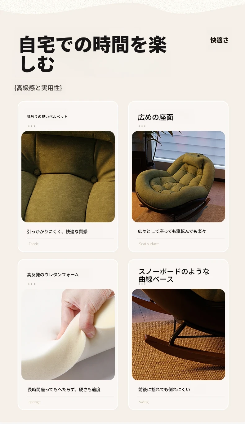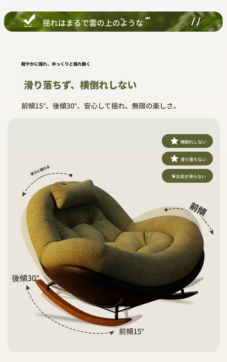 ヴィンテージ風シングルロッキングチェア、大人向け自宅用バルコニー・リビングルームに最適!リラックスと安らぎを提供する、寝転んでも使える中古風のラウンジチェア。理想的な休息スペースを手に入れよう!