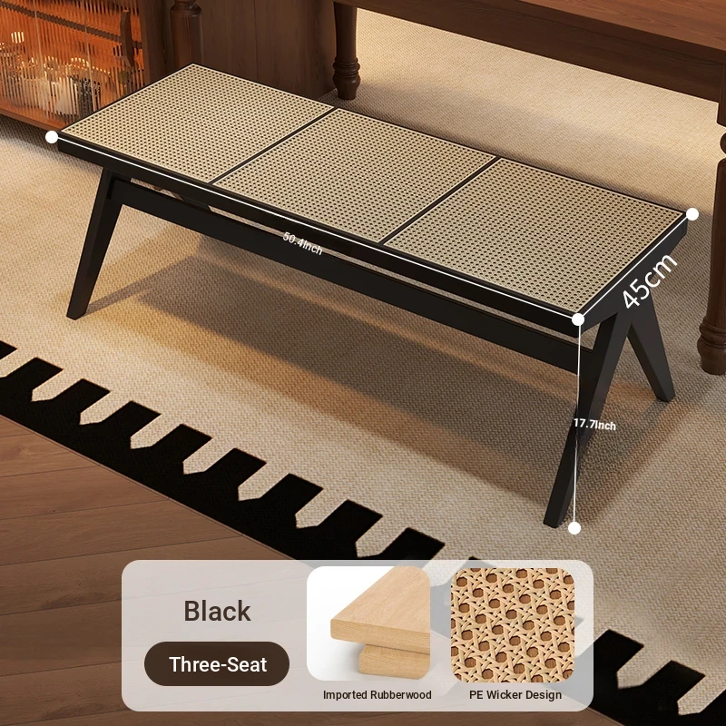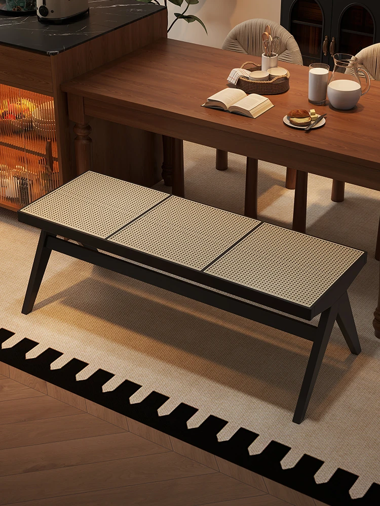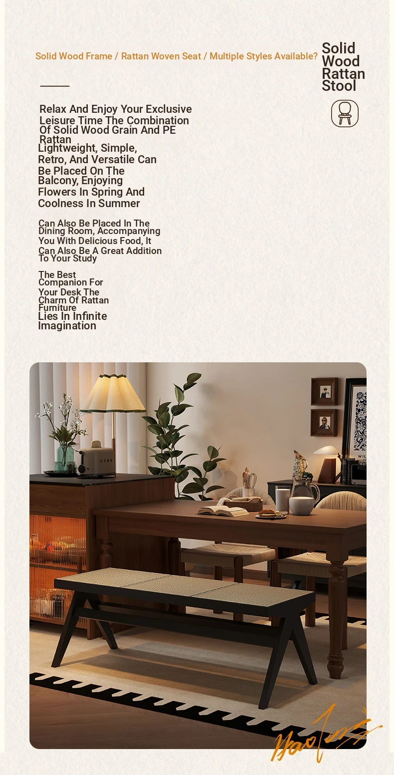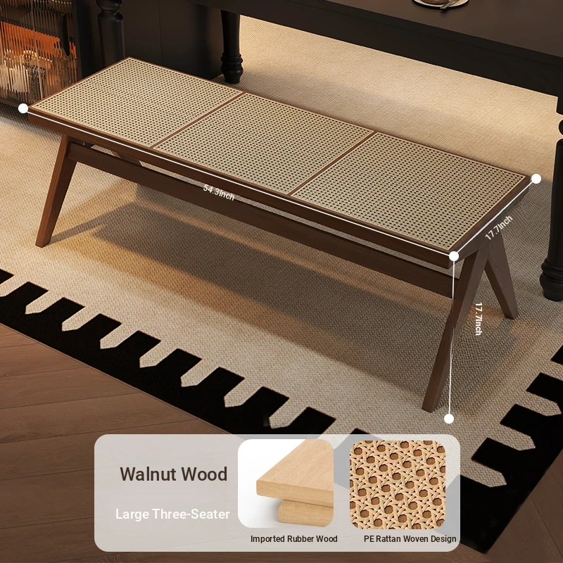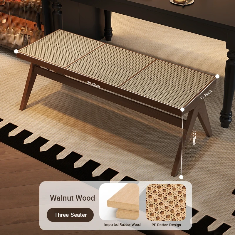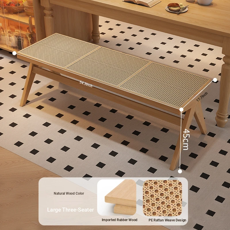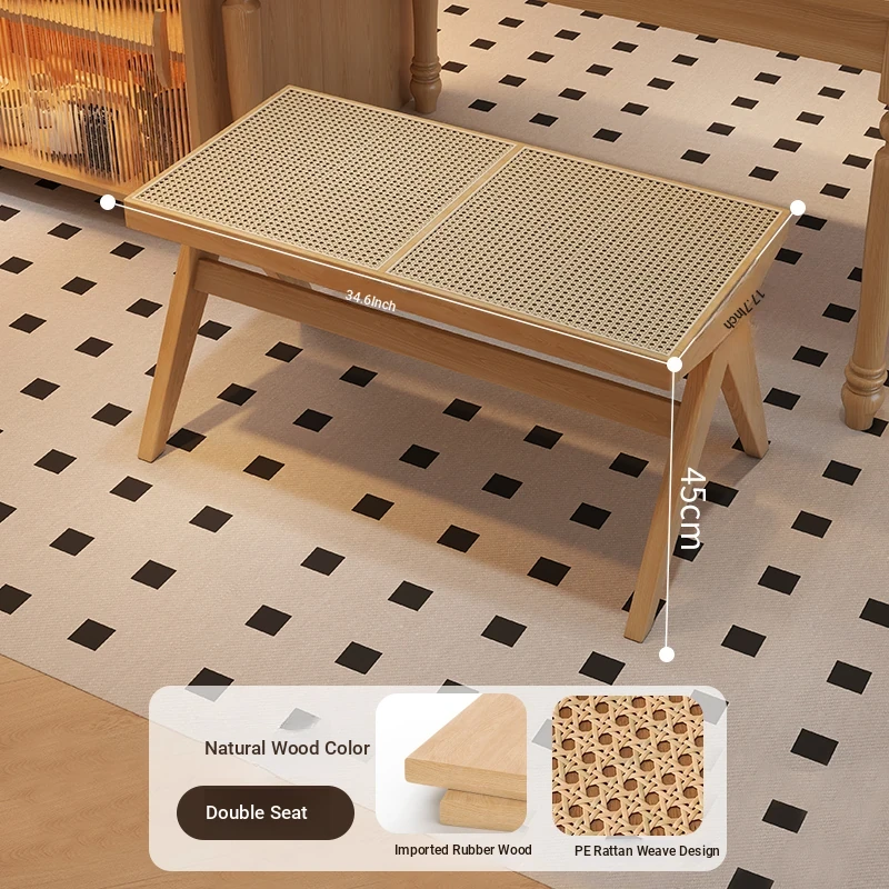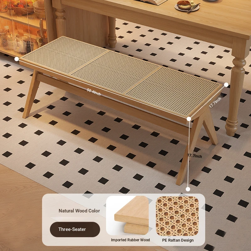 Vintage Solid Wood Rattan Long Dining Chair - Wabi-Sabi Home Stool for Entryway, Perfect for Guesthouses - Natural Wood Bench with Rattan Weaving
