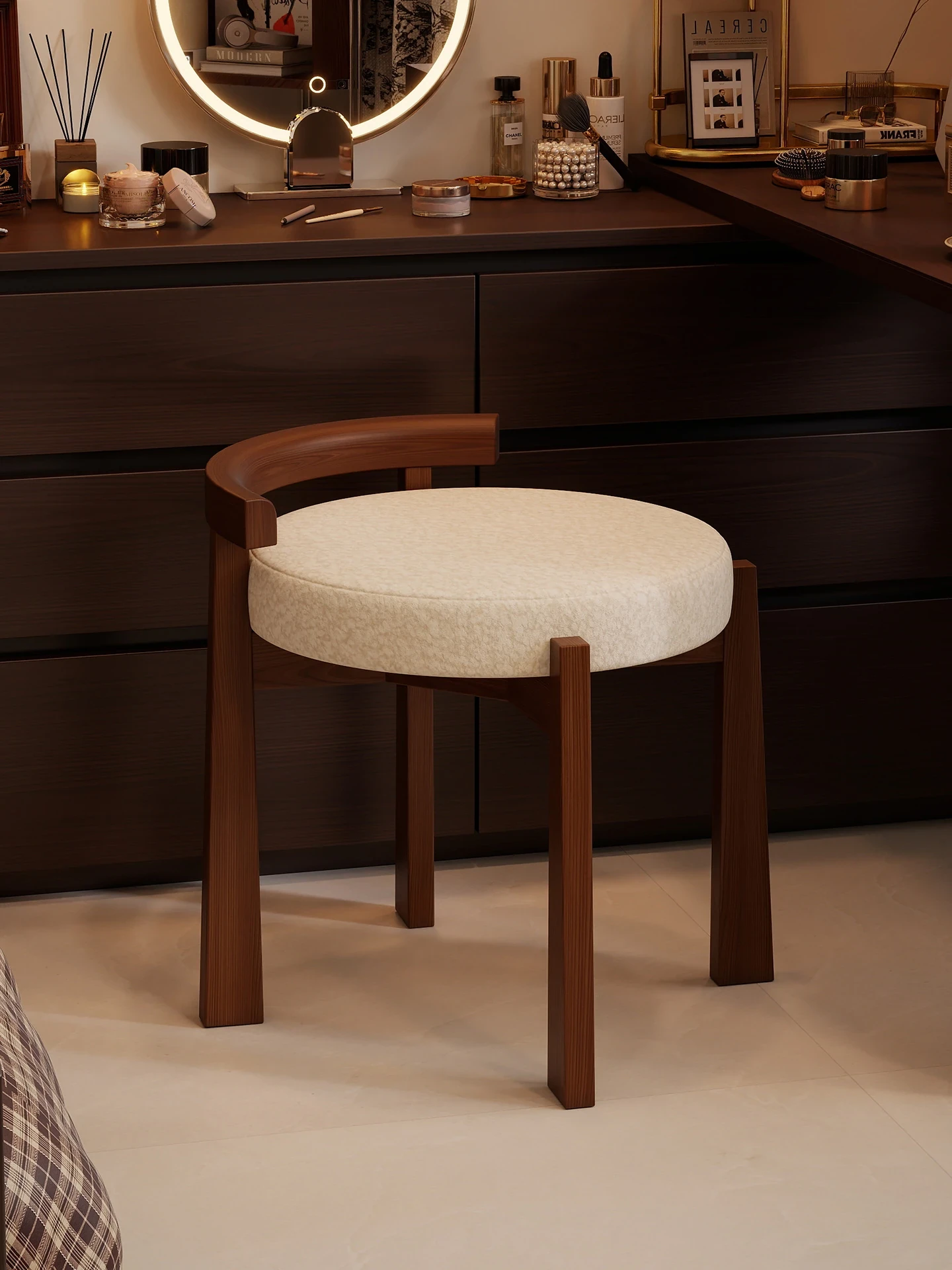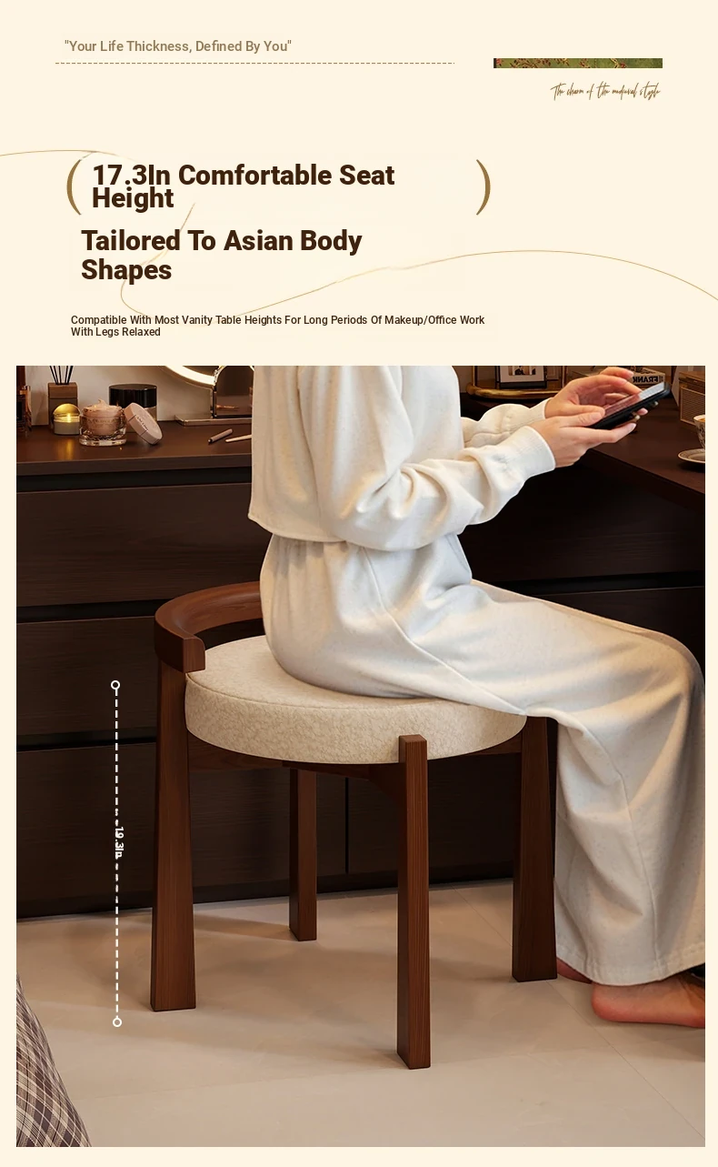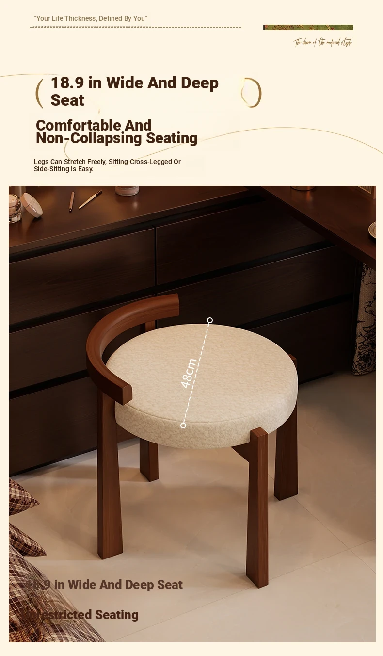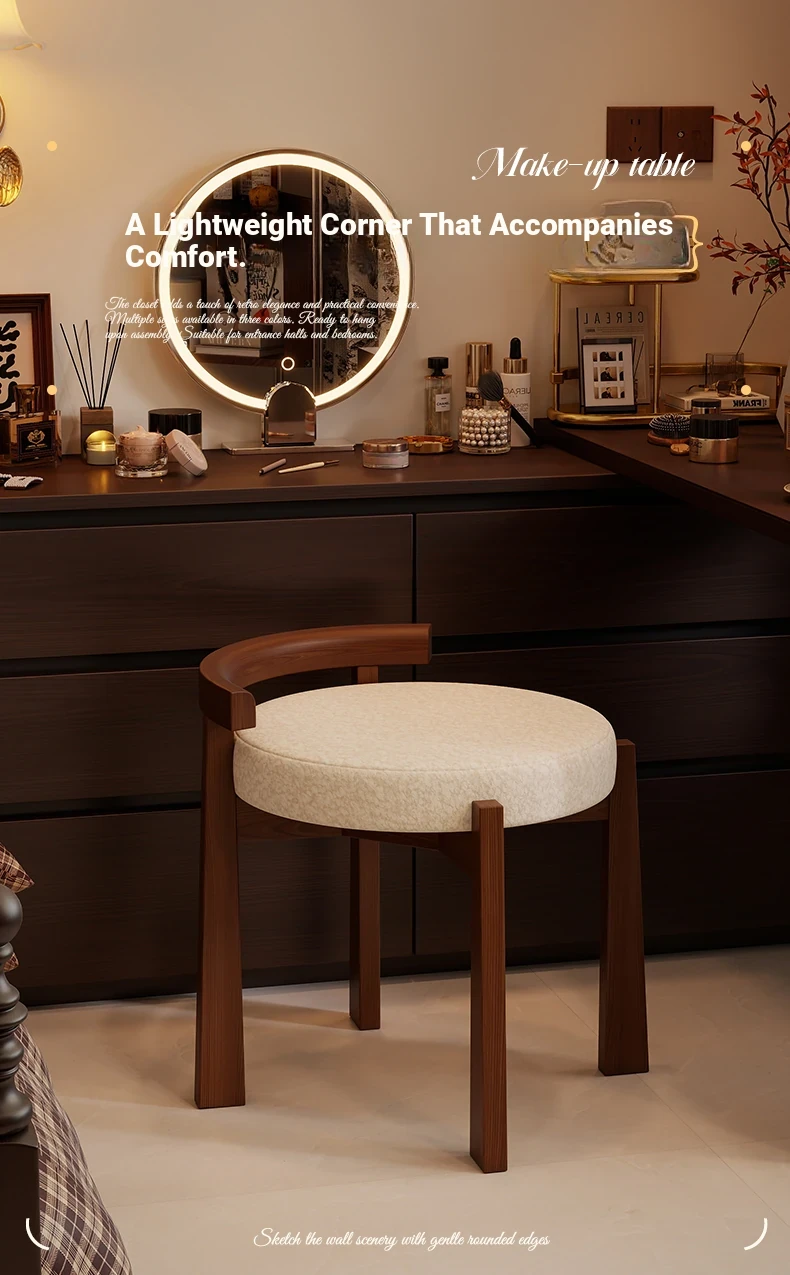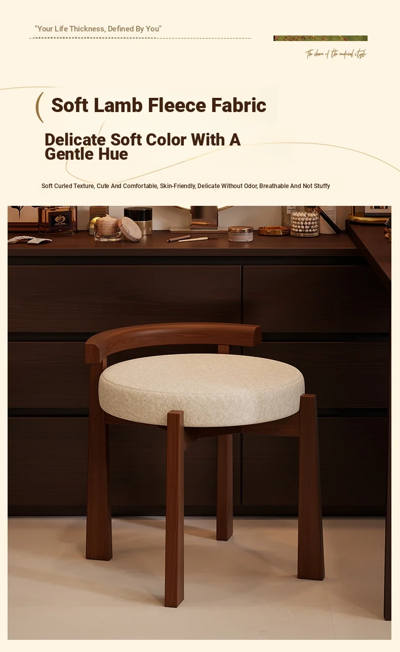 Vintage Solid Wood Vanity Stool for Bedroom - Plush Lambswool Upholstered Makeup Chair for Dressing Table and Walk-in Closet