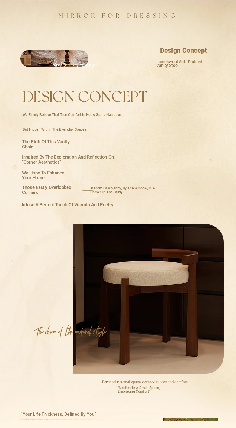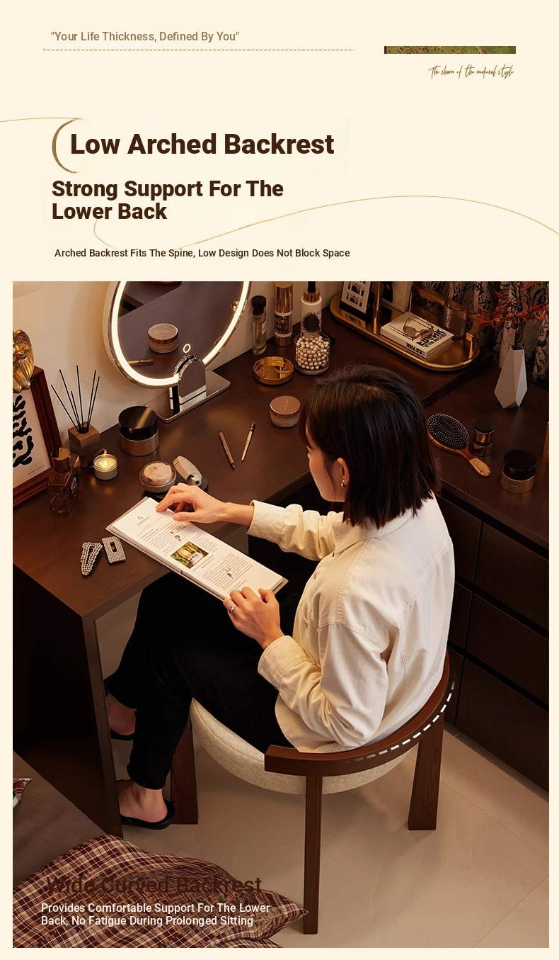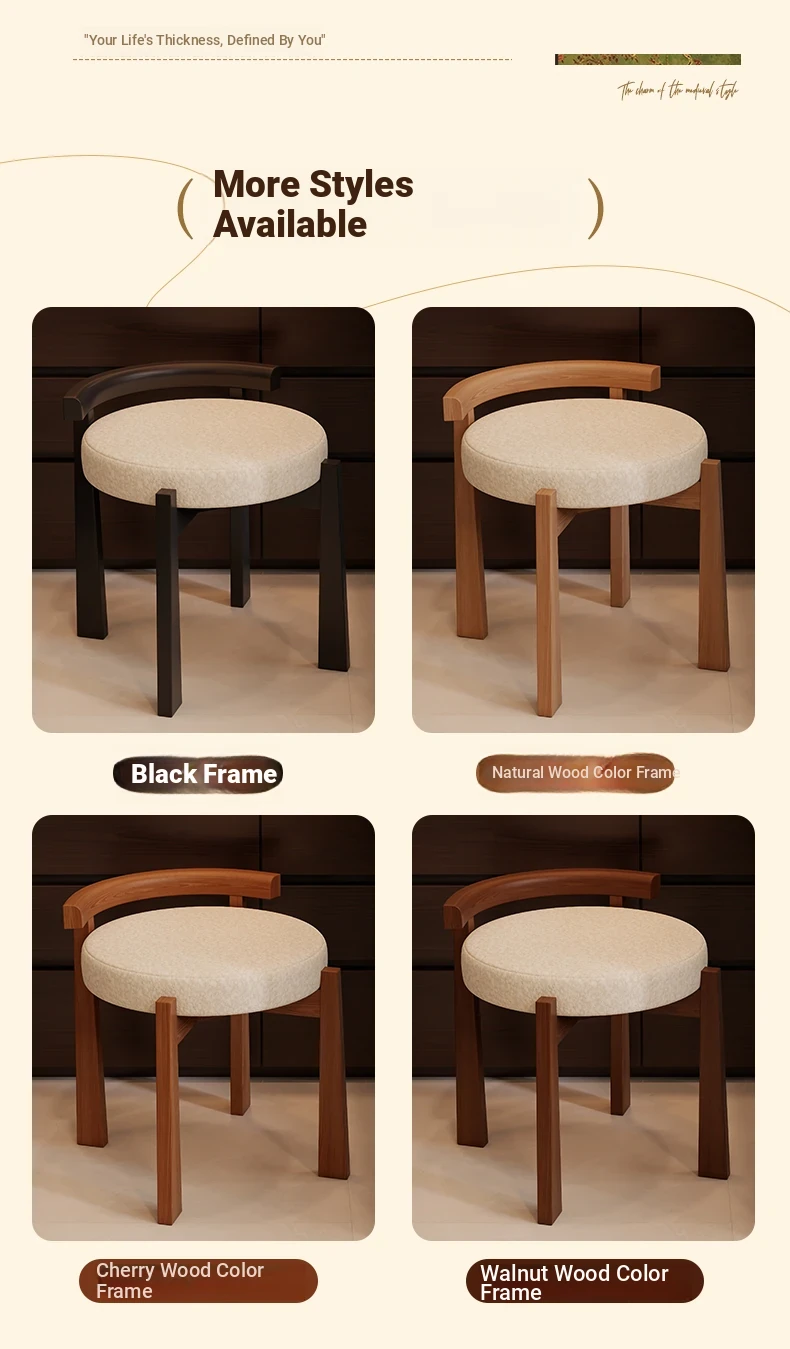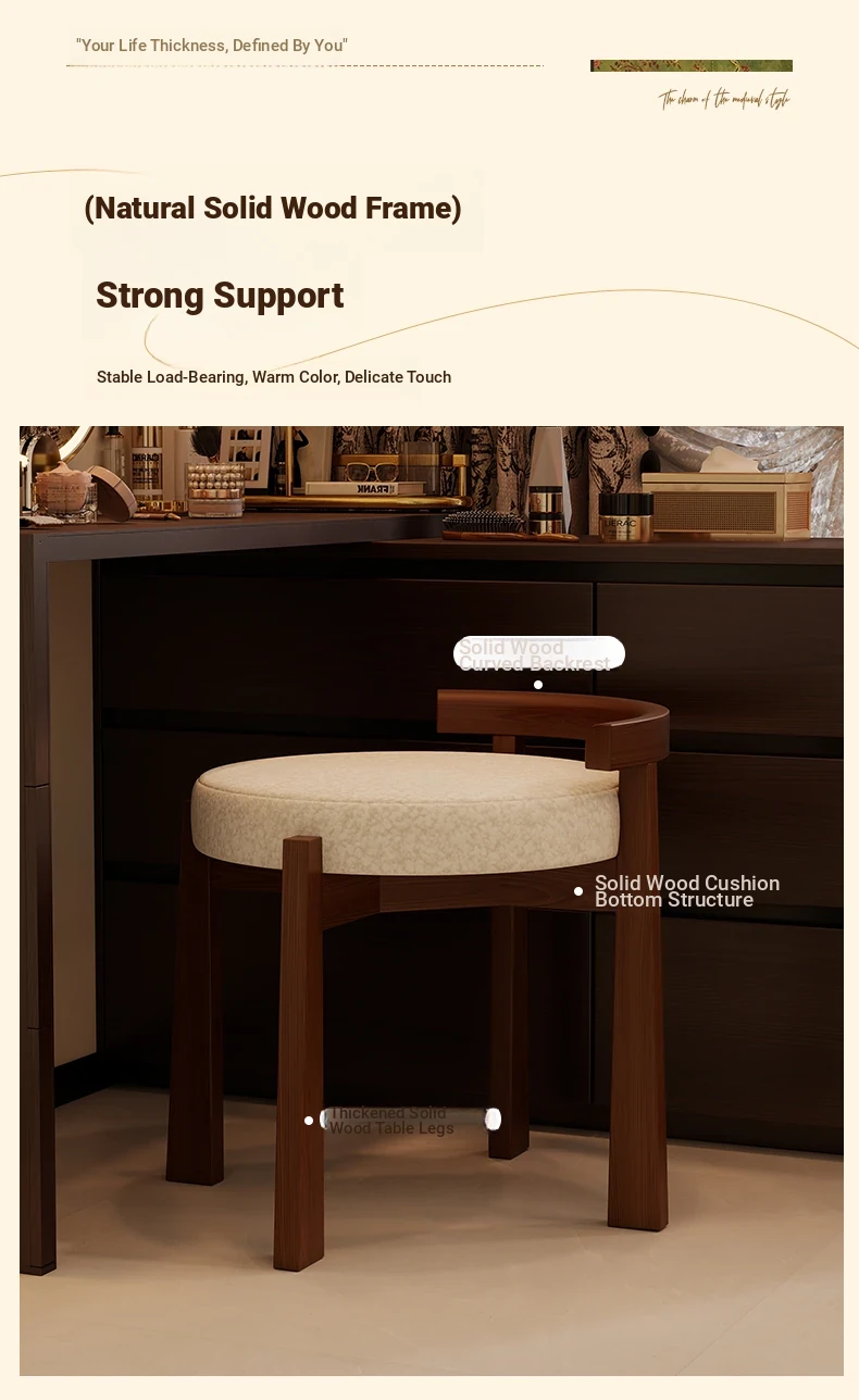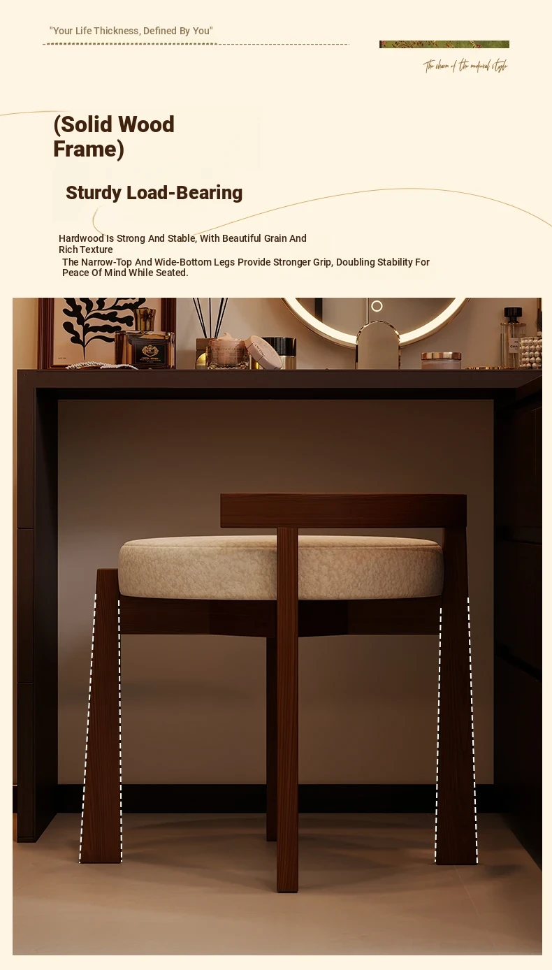 Vintage Solid Wood Vanity Stool for Bedroom - Plush Lambswool Upholstered Makeup Chair for Dressing Table and Walk-in Closet