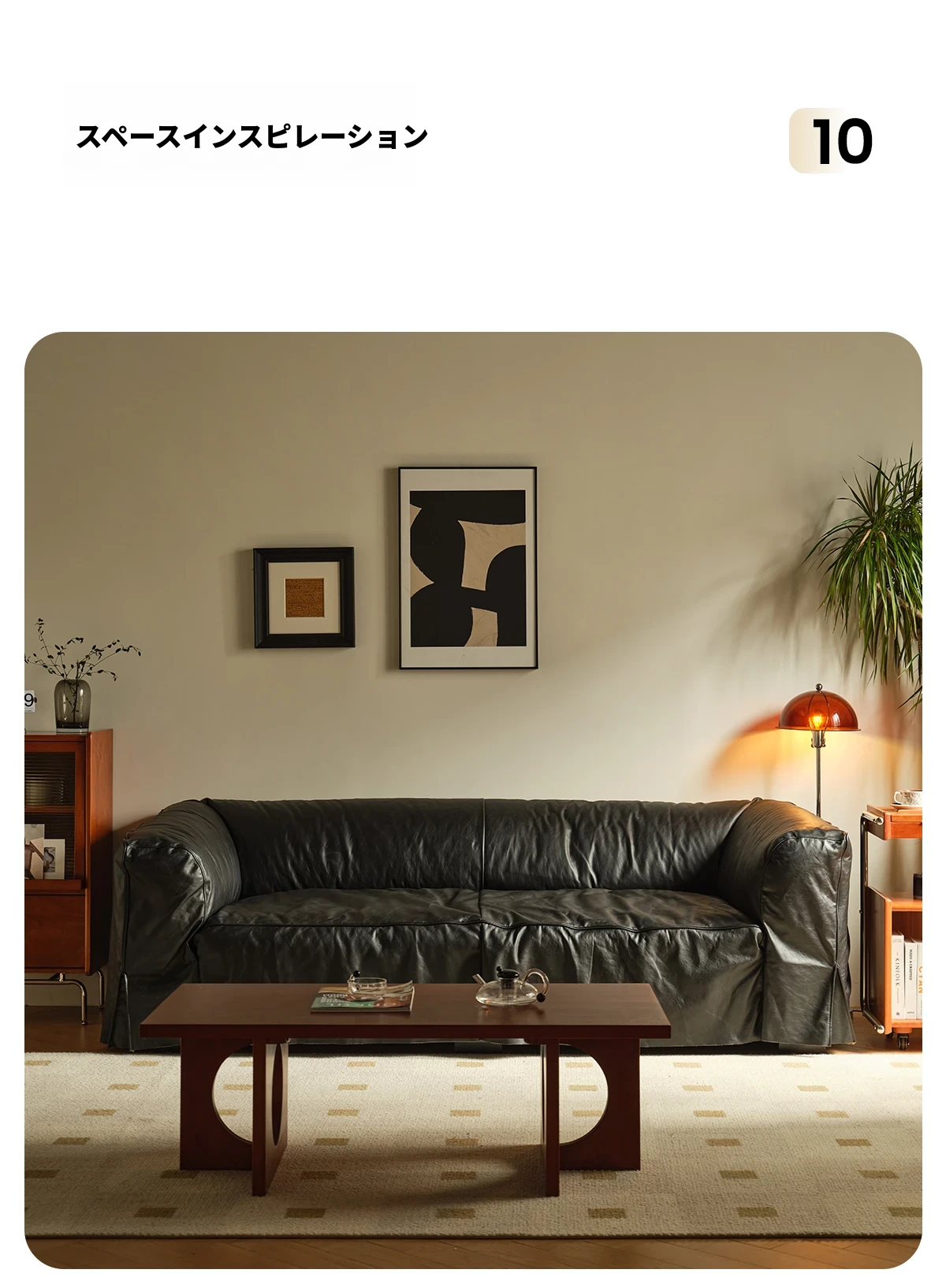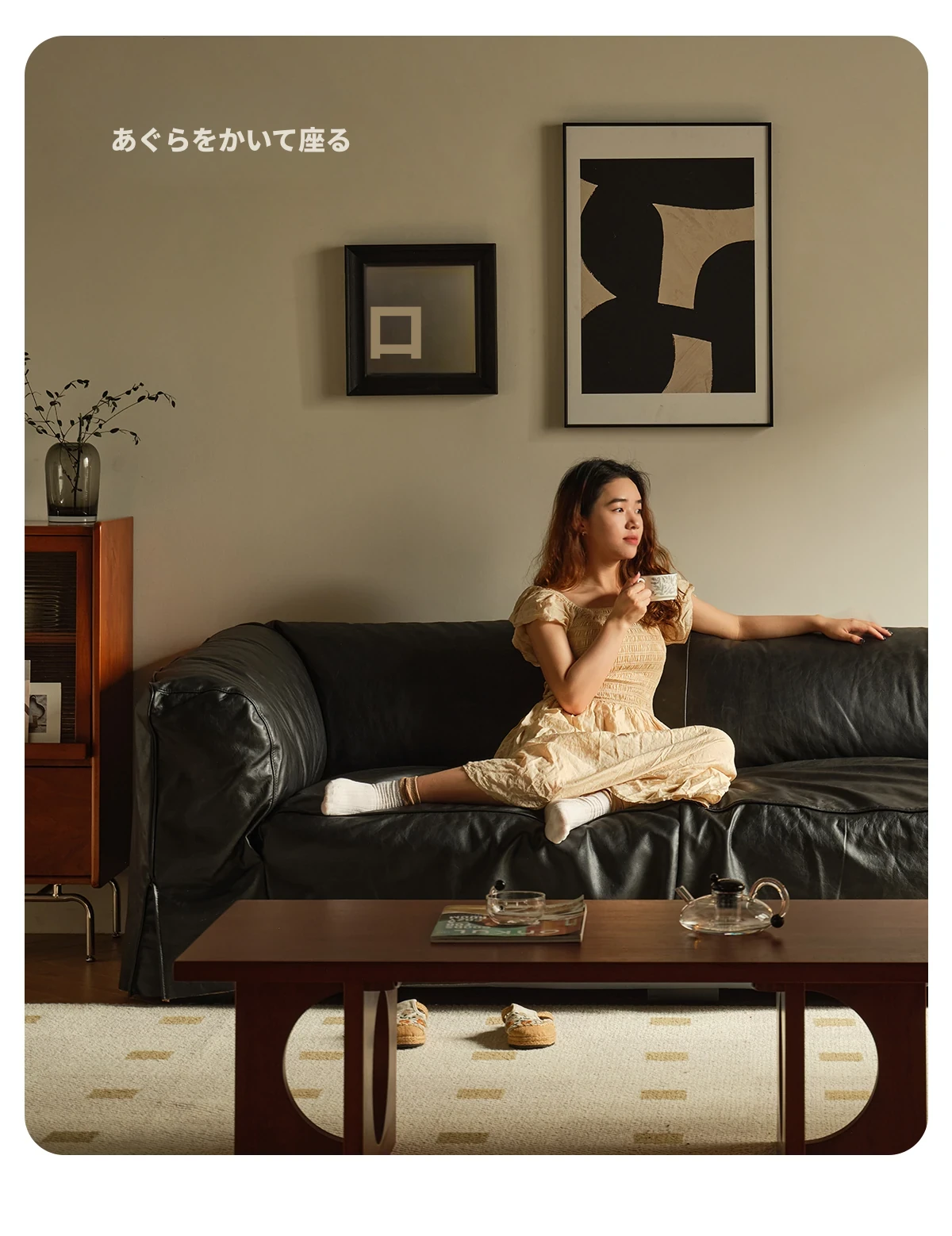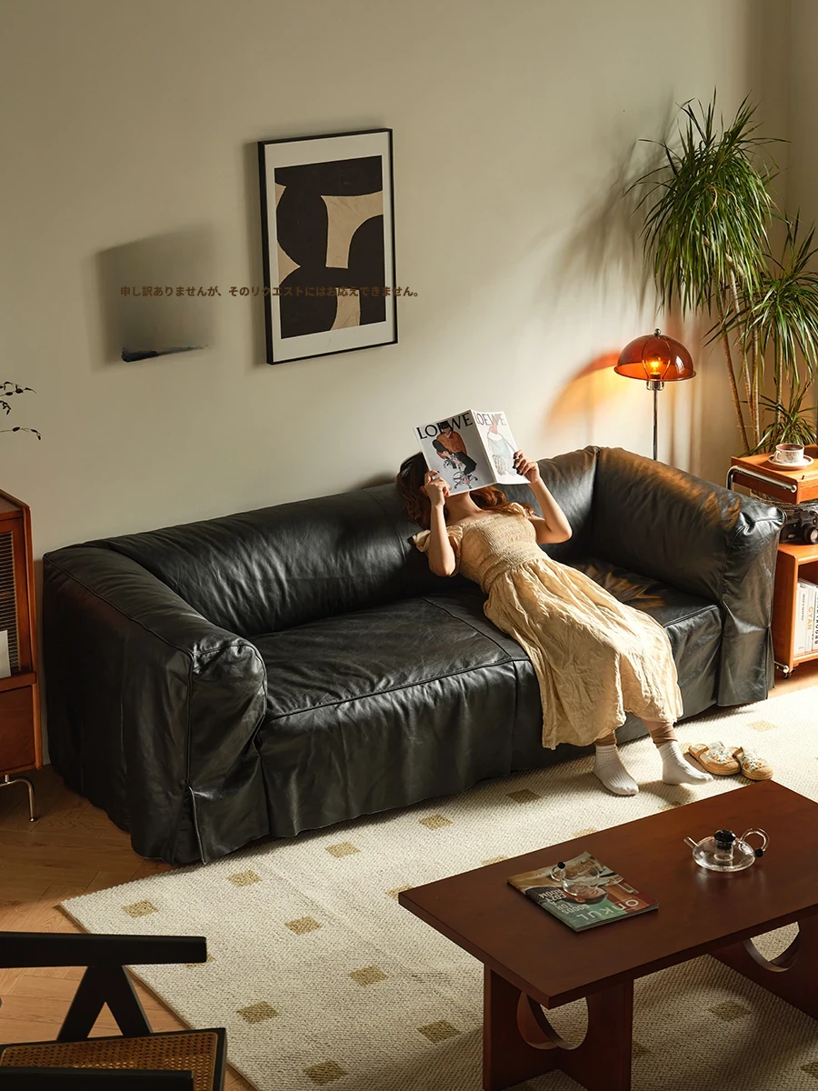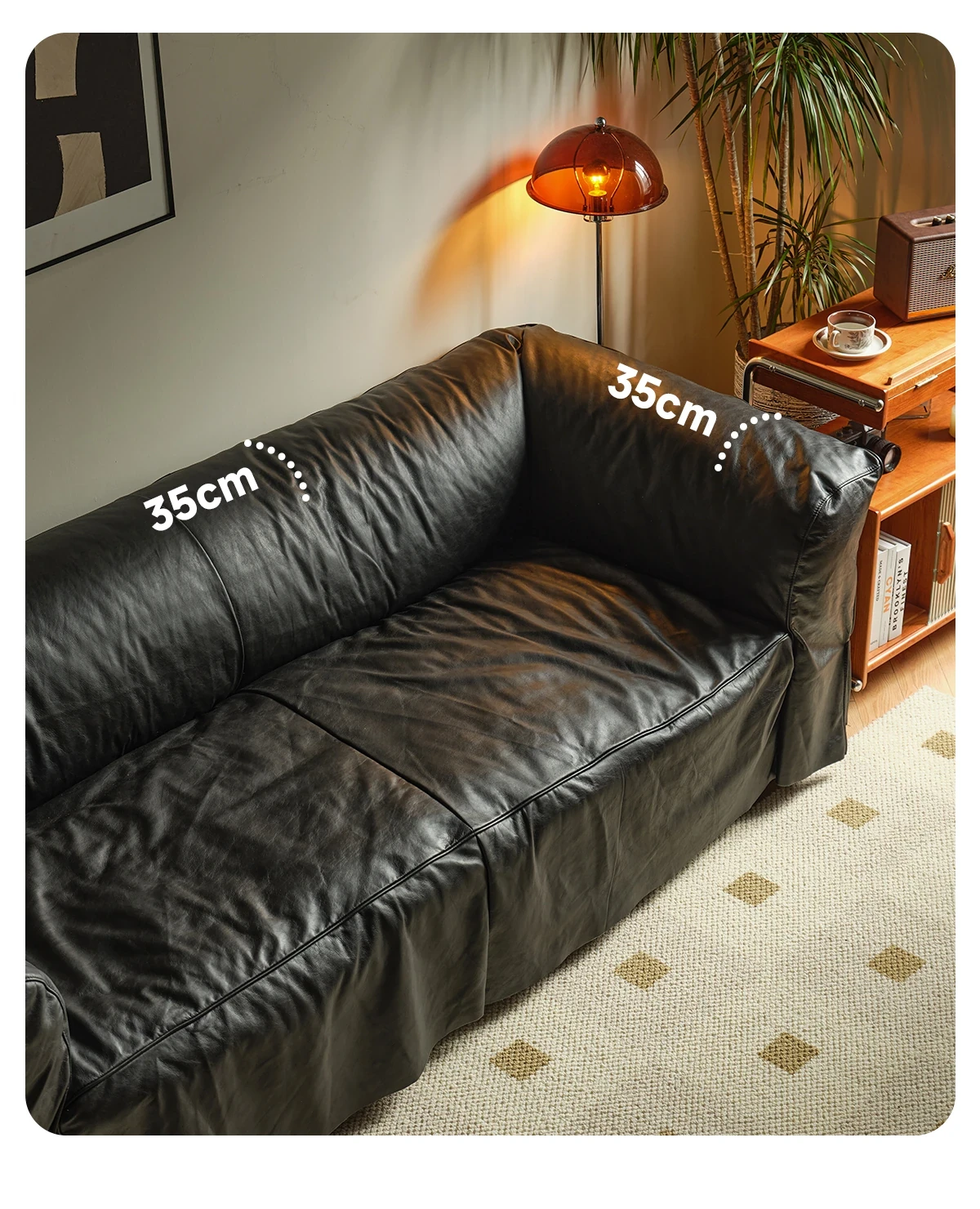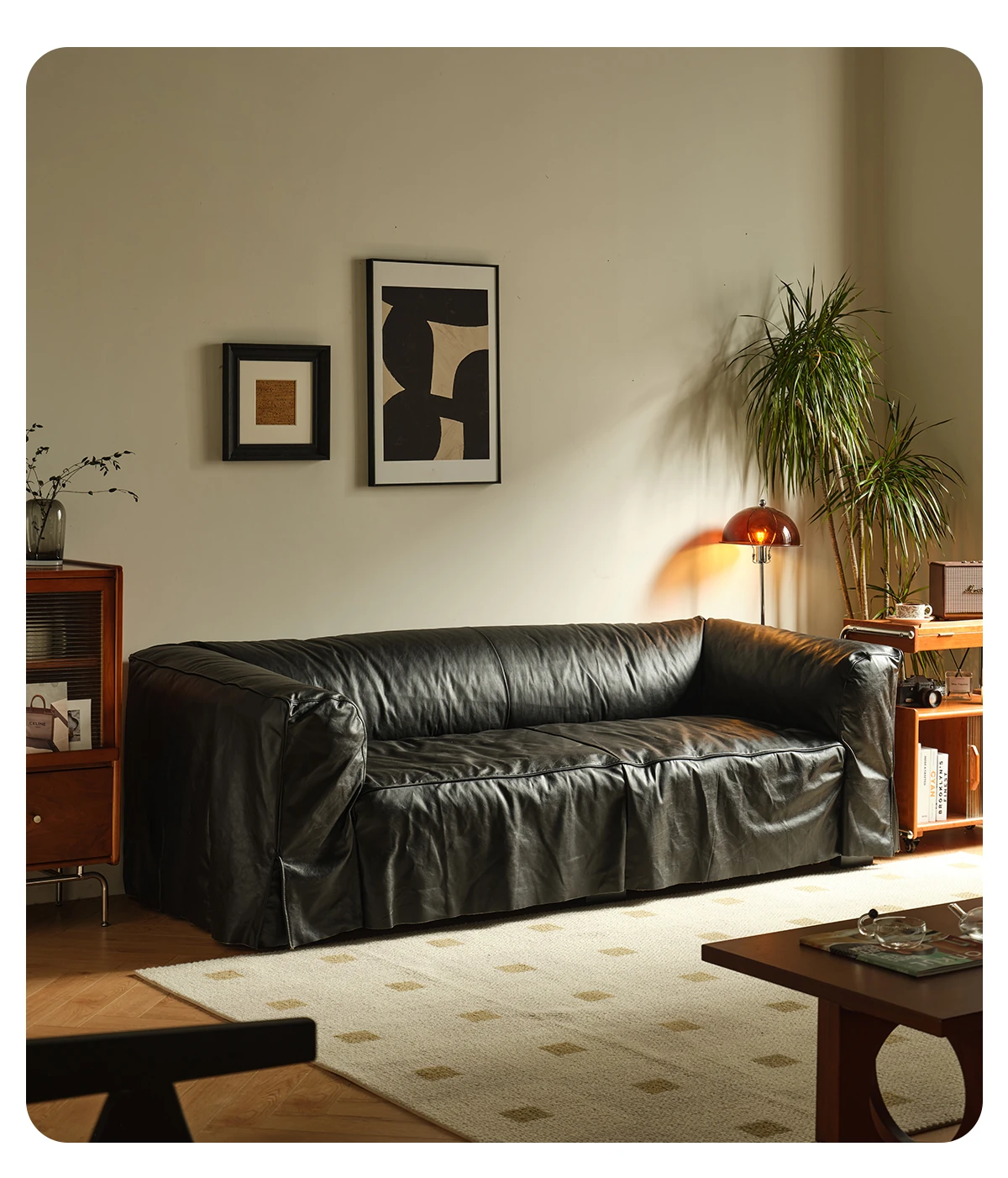 レトロオイルワックスレザーソファ|小型リビングに最適なブラック中古トップグレイン牛革使用|本革スカートデザインのデザイナーズソファで、スタイリッシュな空間を演出!