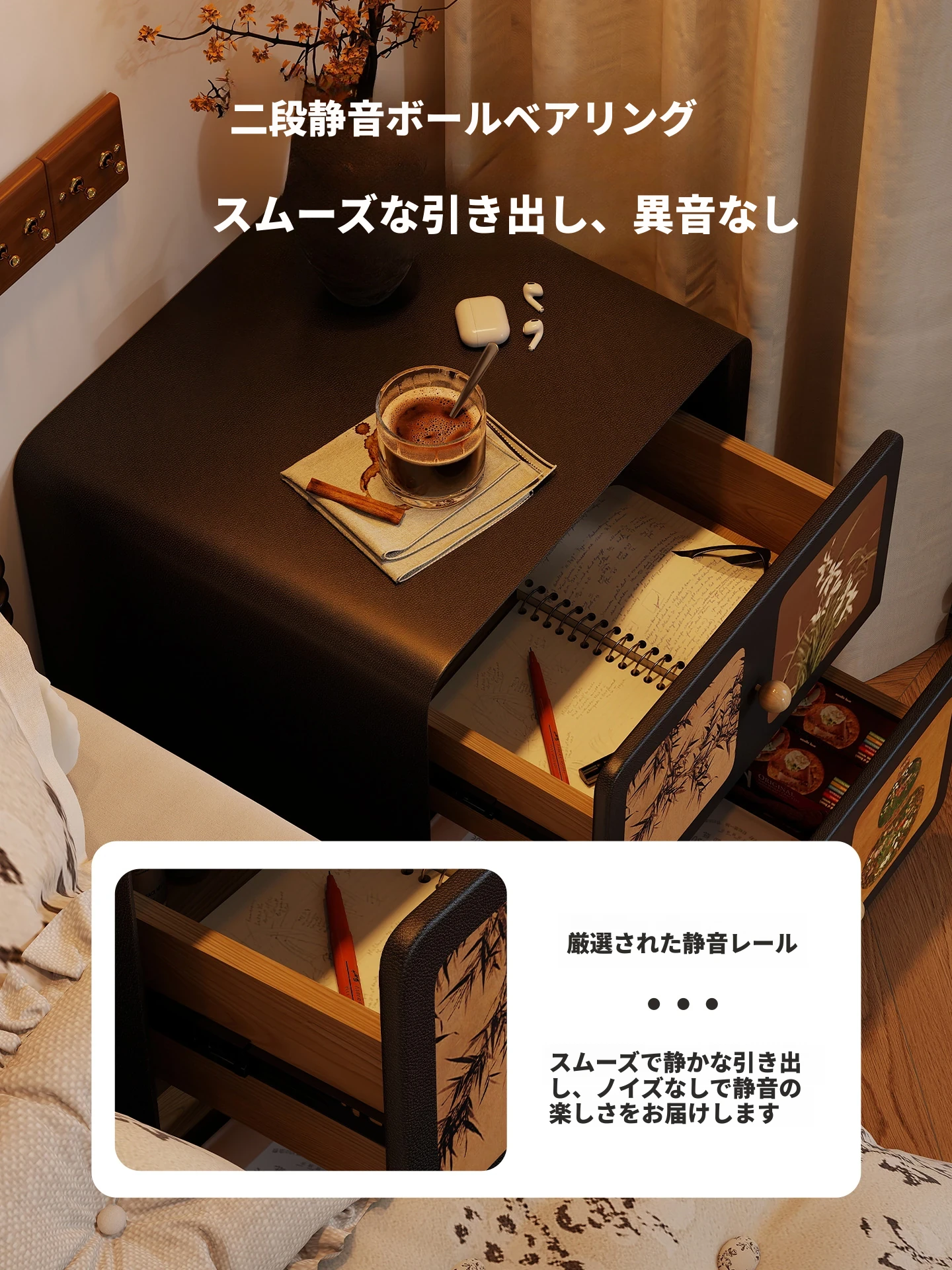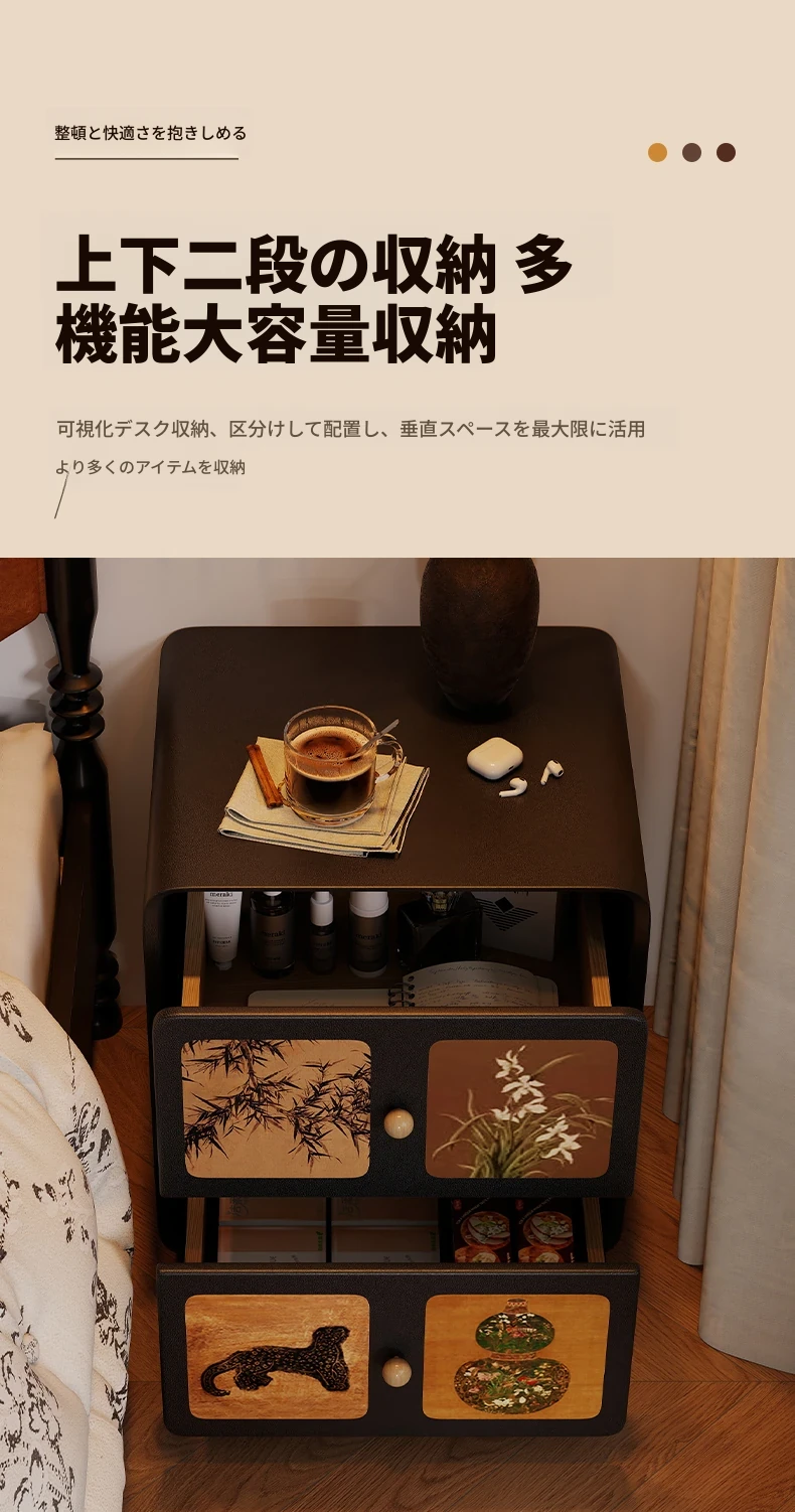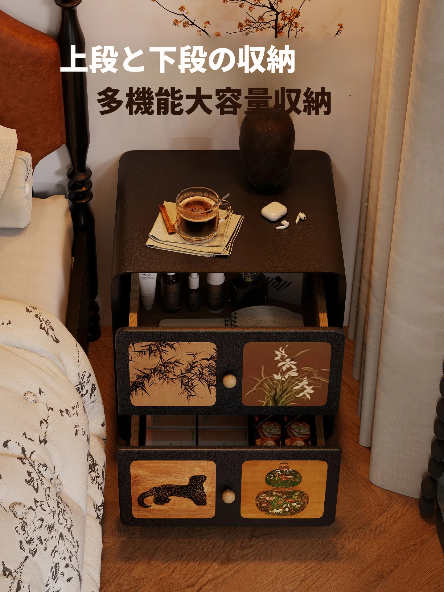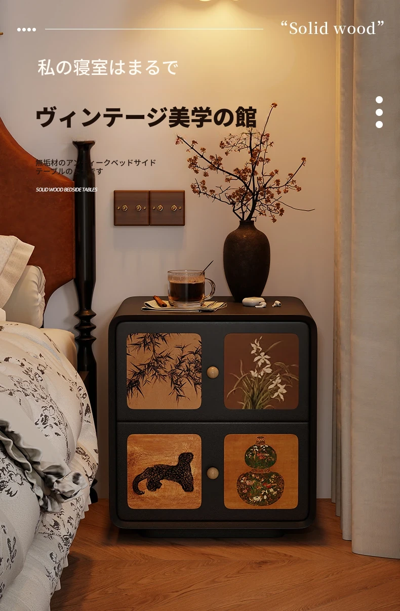 ヴィンテージ風のベッドサイドテーブル、個性的なデザインの実木製ナイトスタンド - おしゃれな黒色の小型収納キャビネットで、あなたの寝室を魅力的に演出!